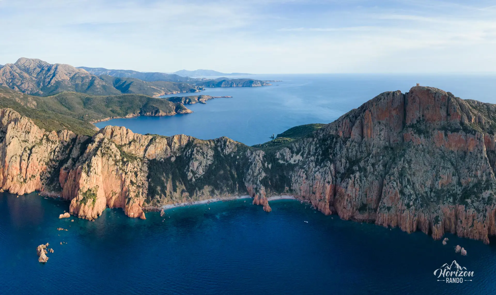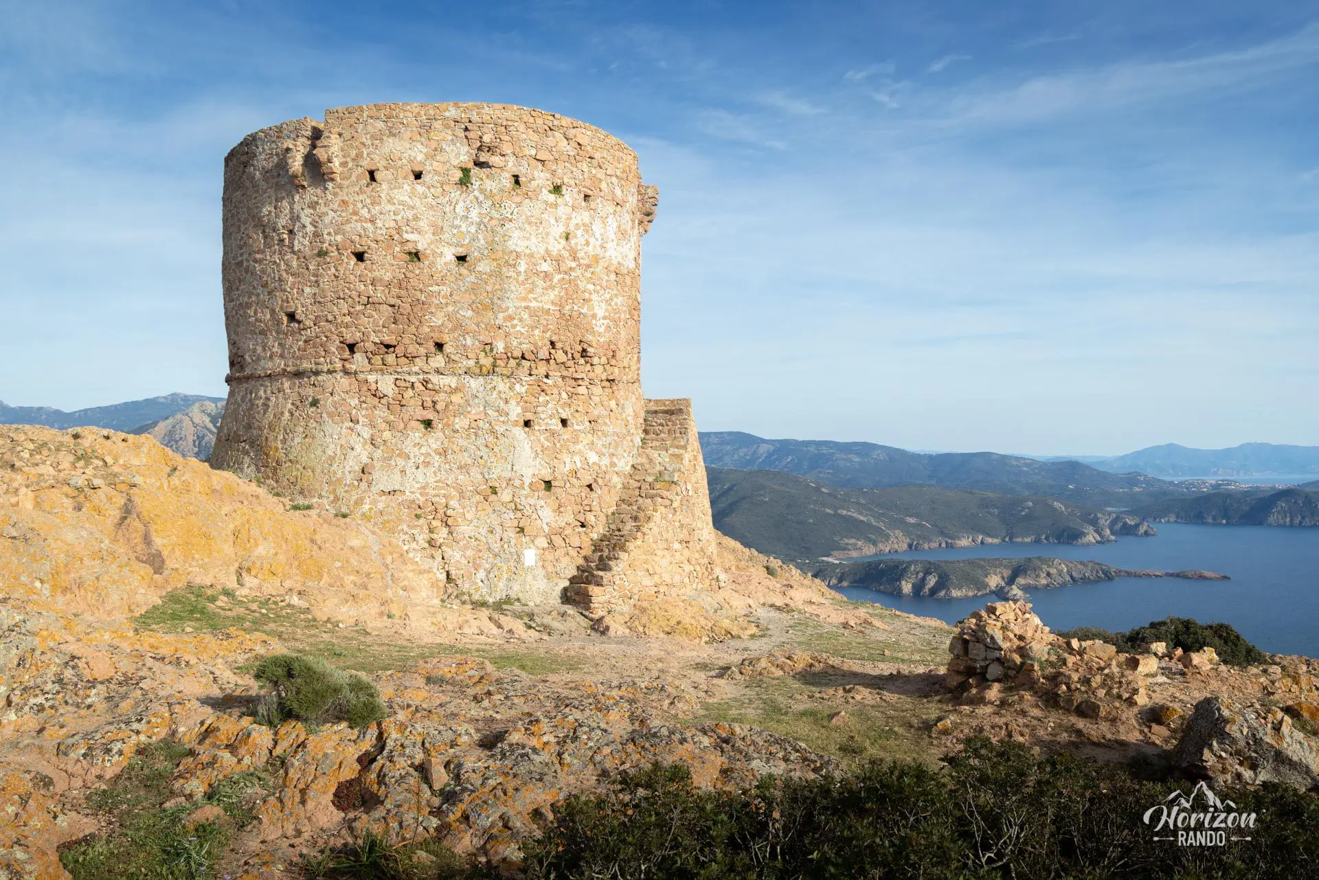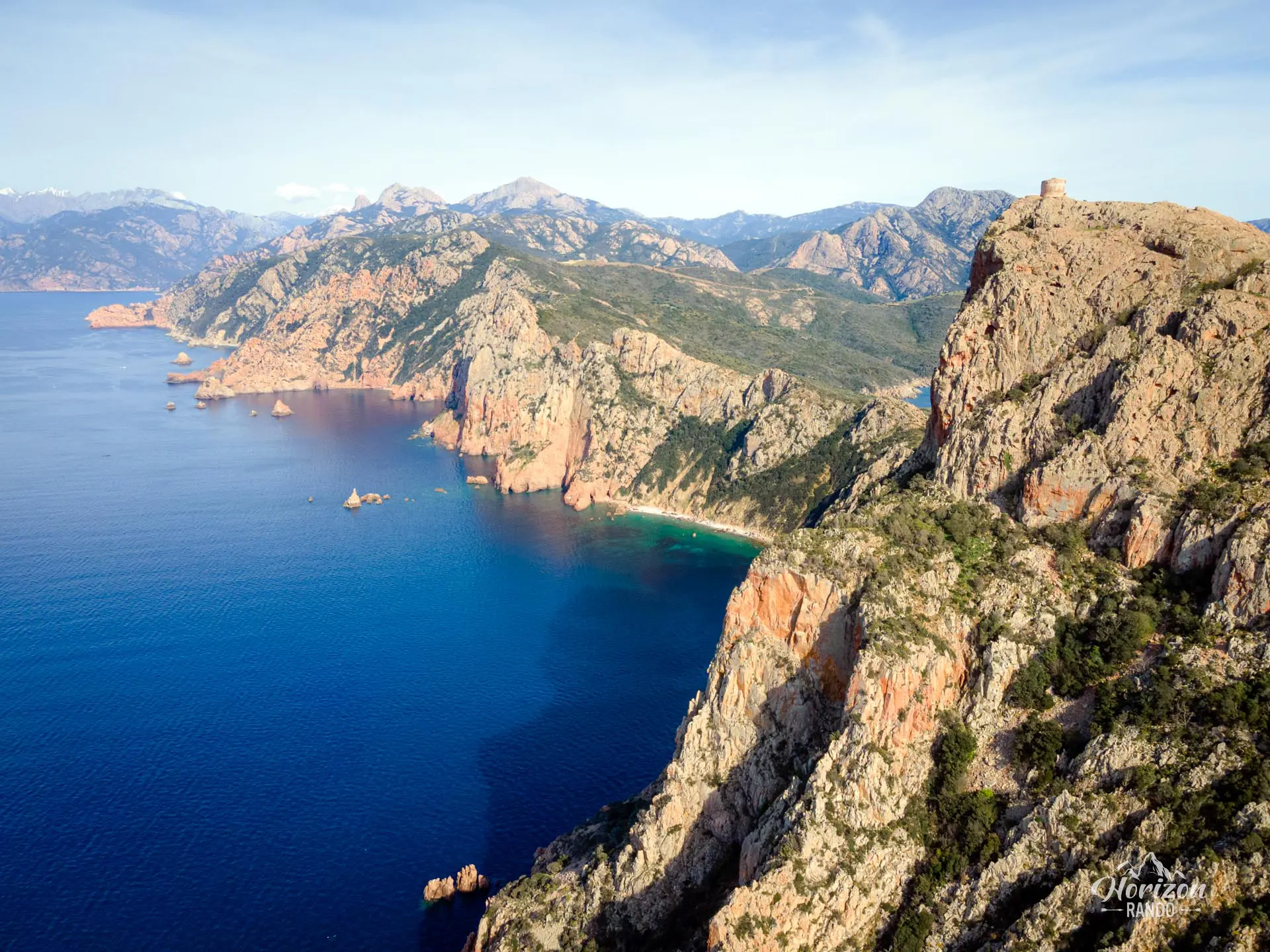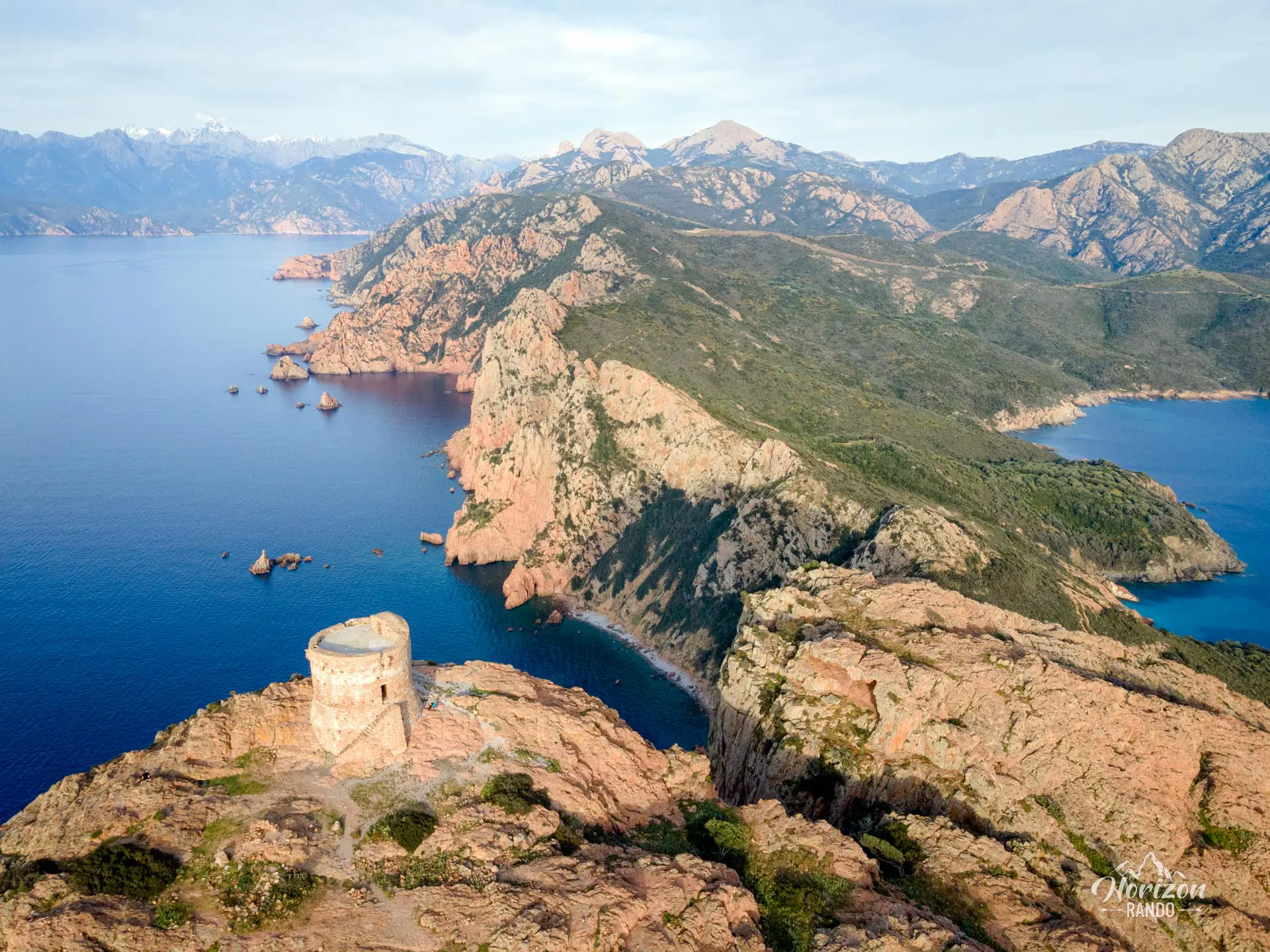 La randonnée du Capo Rosso mène à la tour génoise de Turghiu, joyau du patrimoine corse édifié en 1608 et perché sur un promontoire de granit rose dominant la Méditerranée à 335 mètres d'altitude. Depuis ce point le plus occidental de l'île, le panorama s'ouvre à 360° sur les golfes de Porto et de Sagone, la réserve naturelle de Scandola, les calanques de Piana et les plus hauts massifs corses à l'est.