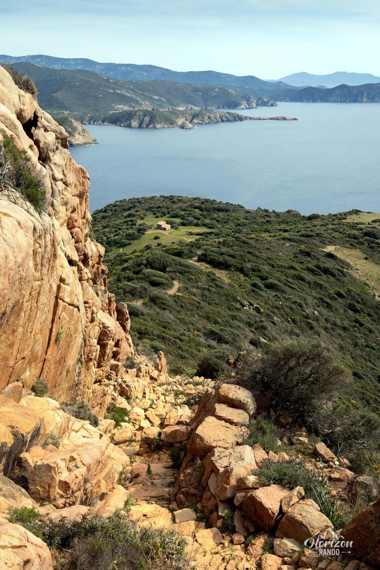 Fait rare en Corse, la randonnée commence par une descente dans le maquis, puis remonte progressivement. La dernière partie de l'ascension, d'environ 30 minutes, est plus raide et se fait à travers un couloir étroit équipé de marches en granit.