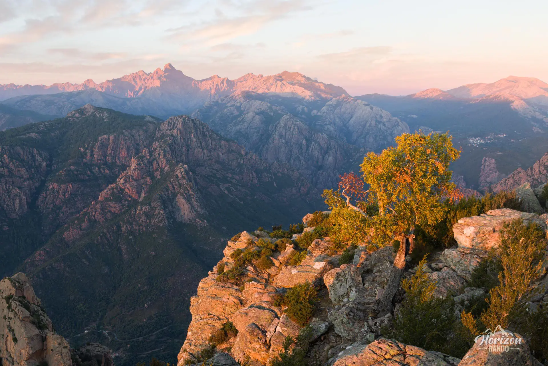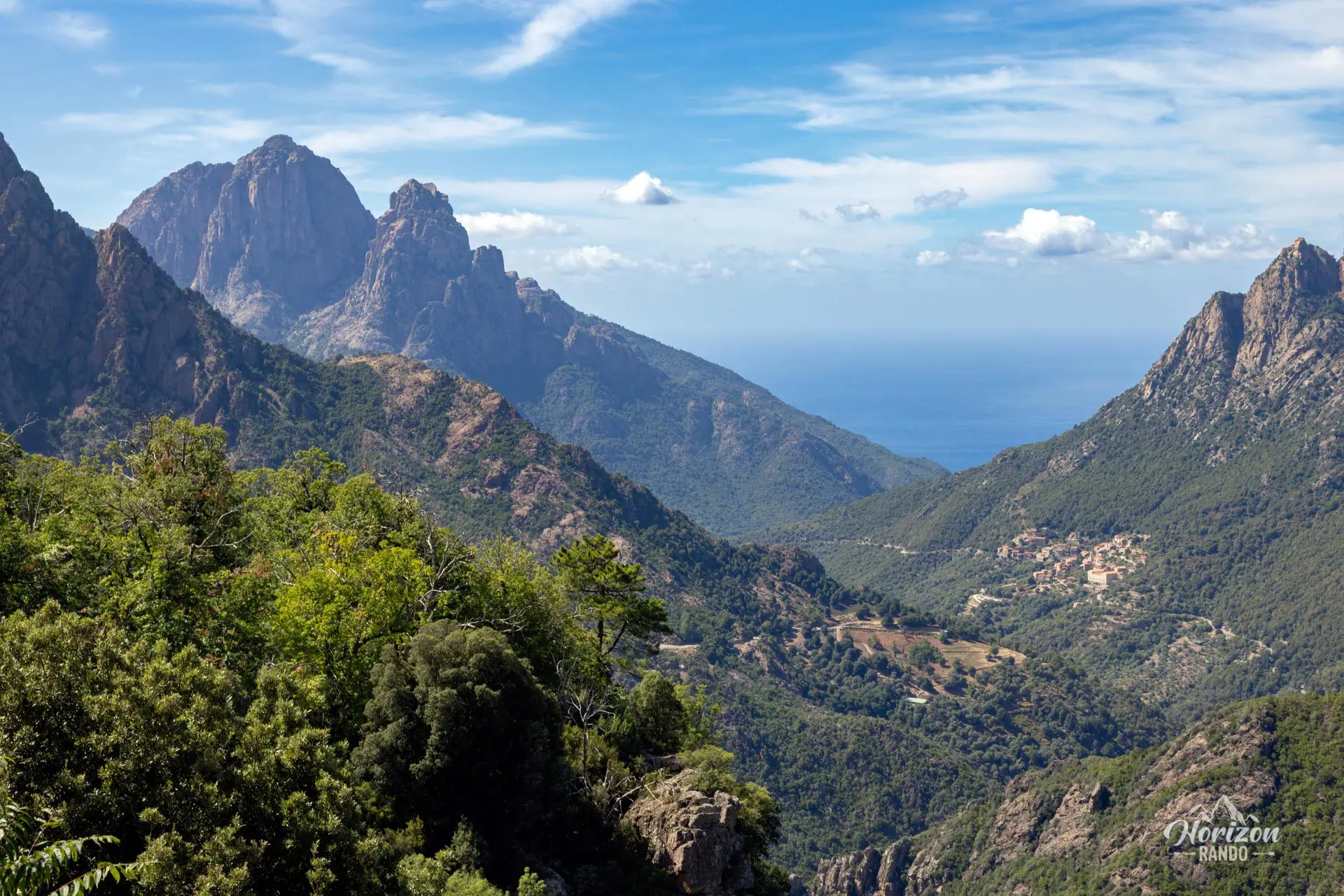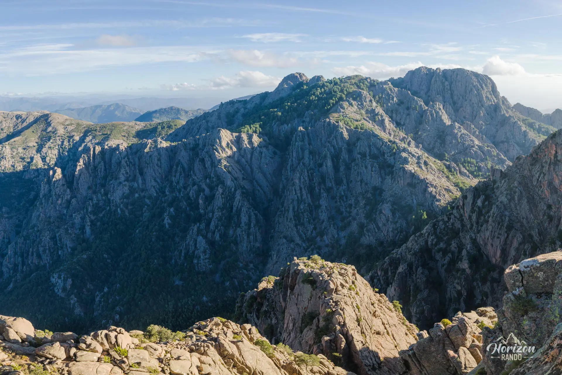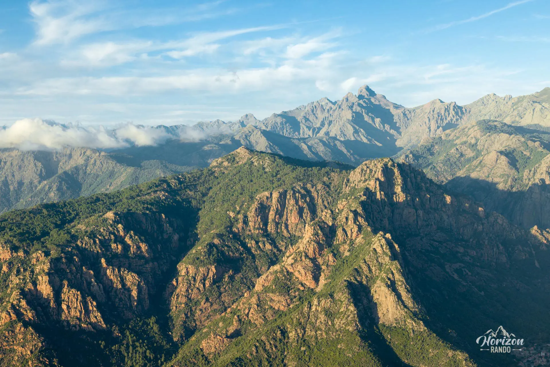 Le parcours évolue d'abord à l'ombre de la forêt de pins de Piana, avant de basculer sur un terrain rocailleux et minéral où le panorama se dévoile progressivement jusqu'au sommet.