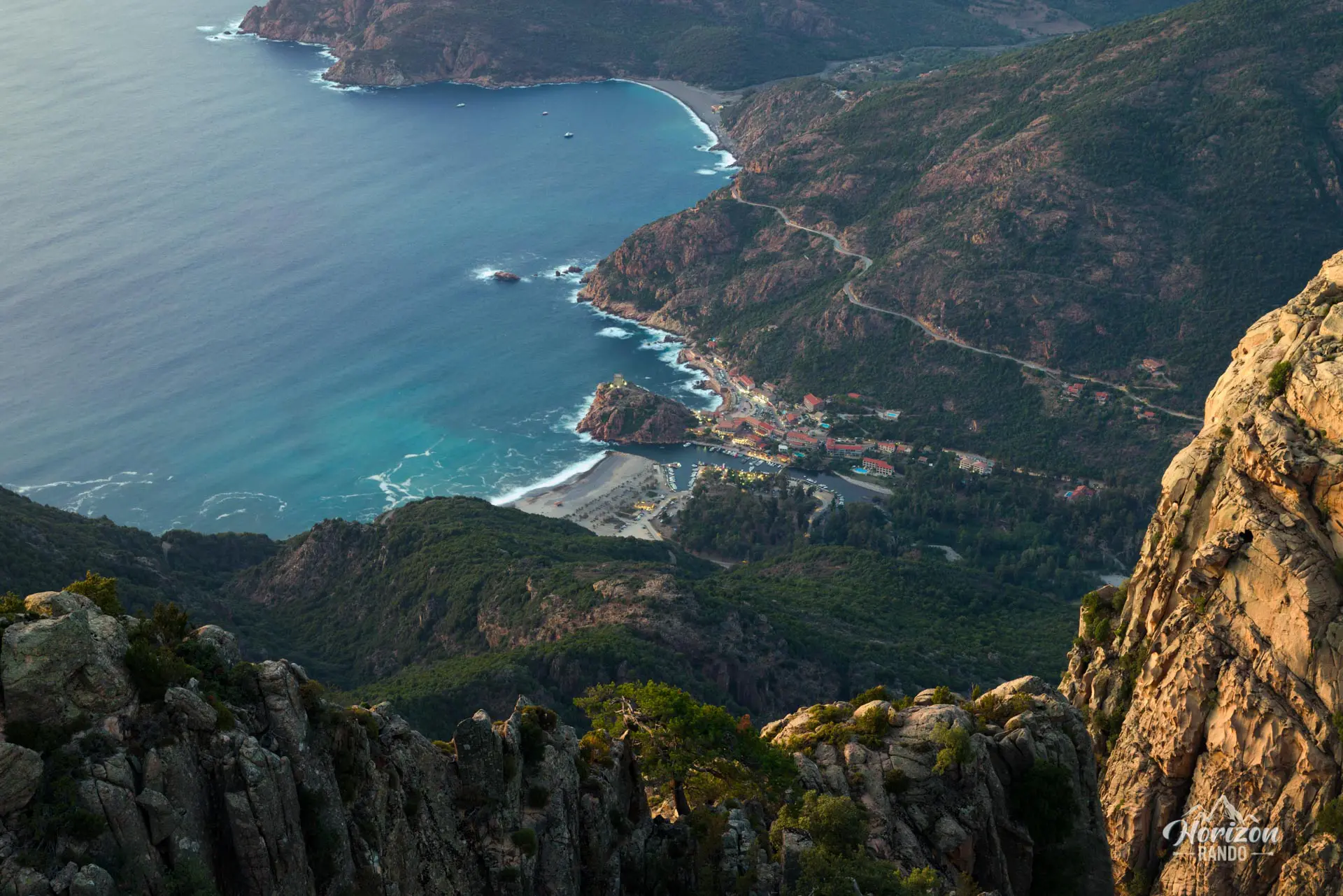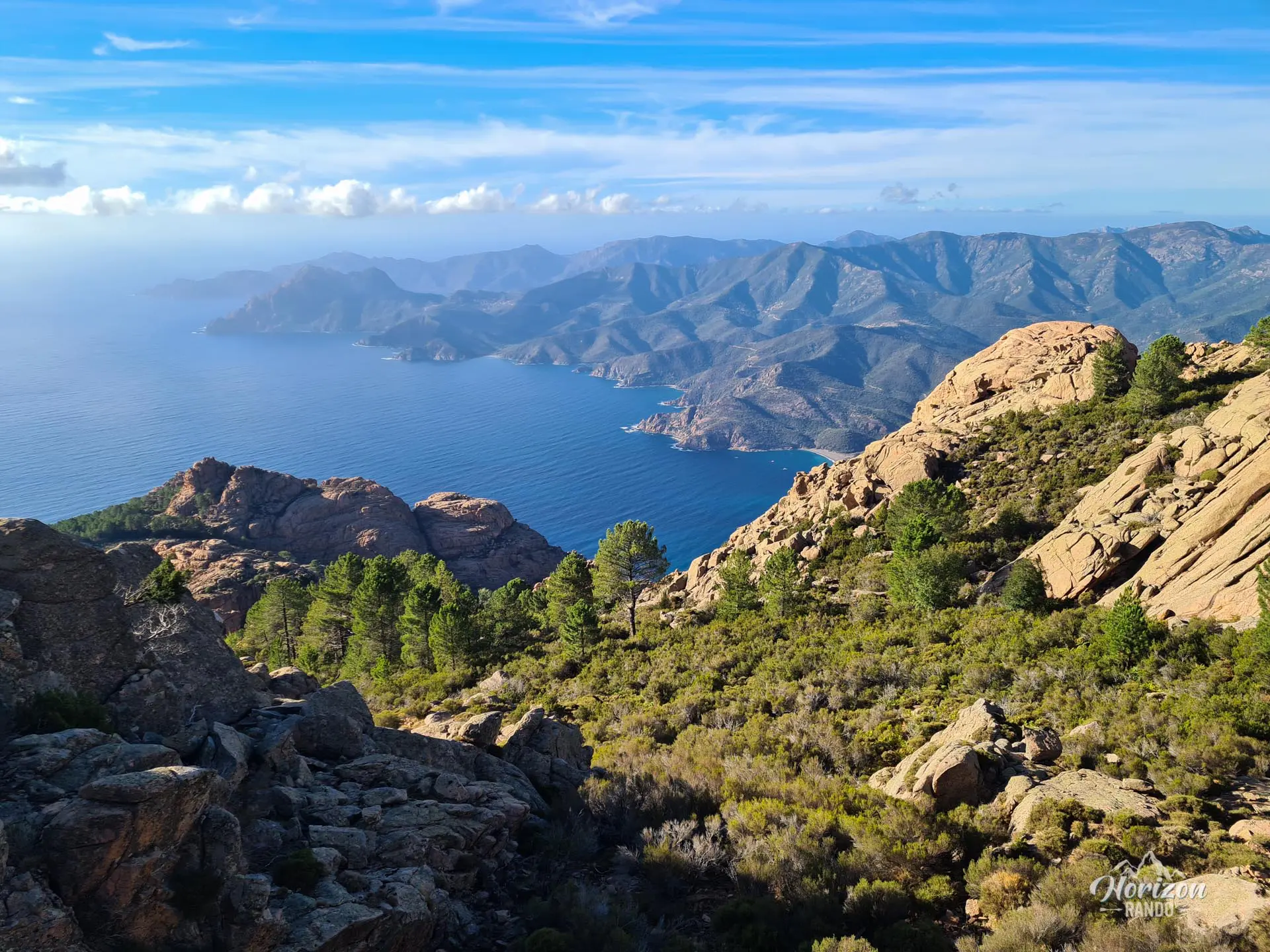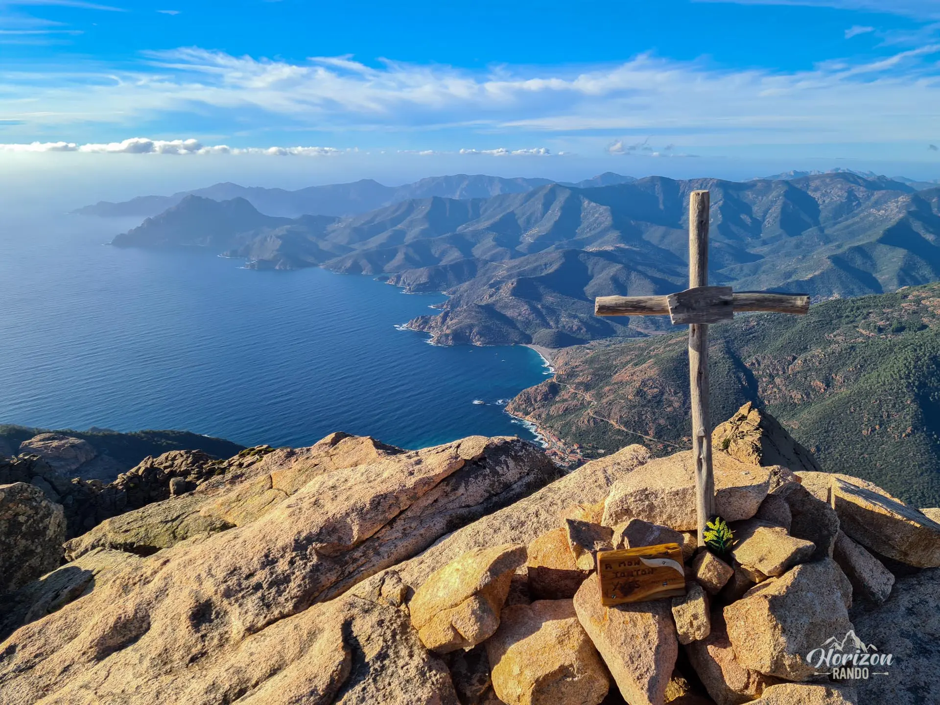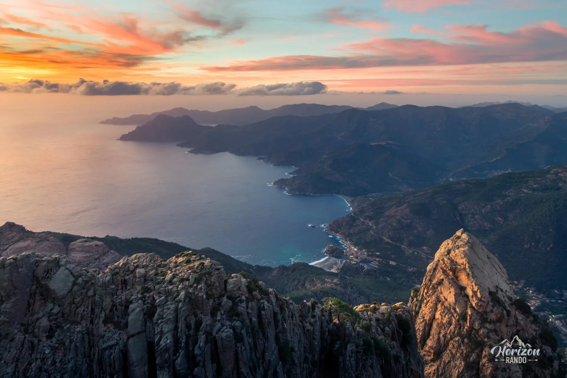 - Un panorama exceptionnel depuis le sommet : vue plongeante sur le golfe de Porto, le Capo Rosso, le Capu di u Vitullu, et vers l'est les sommets emblématiques du massif du Cinto dont la Paglia Orba.
