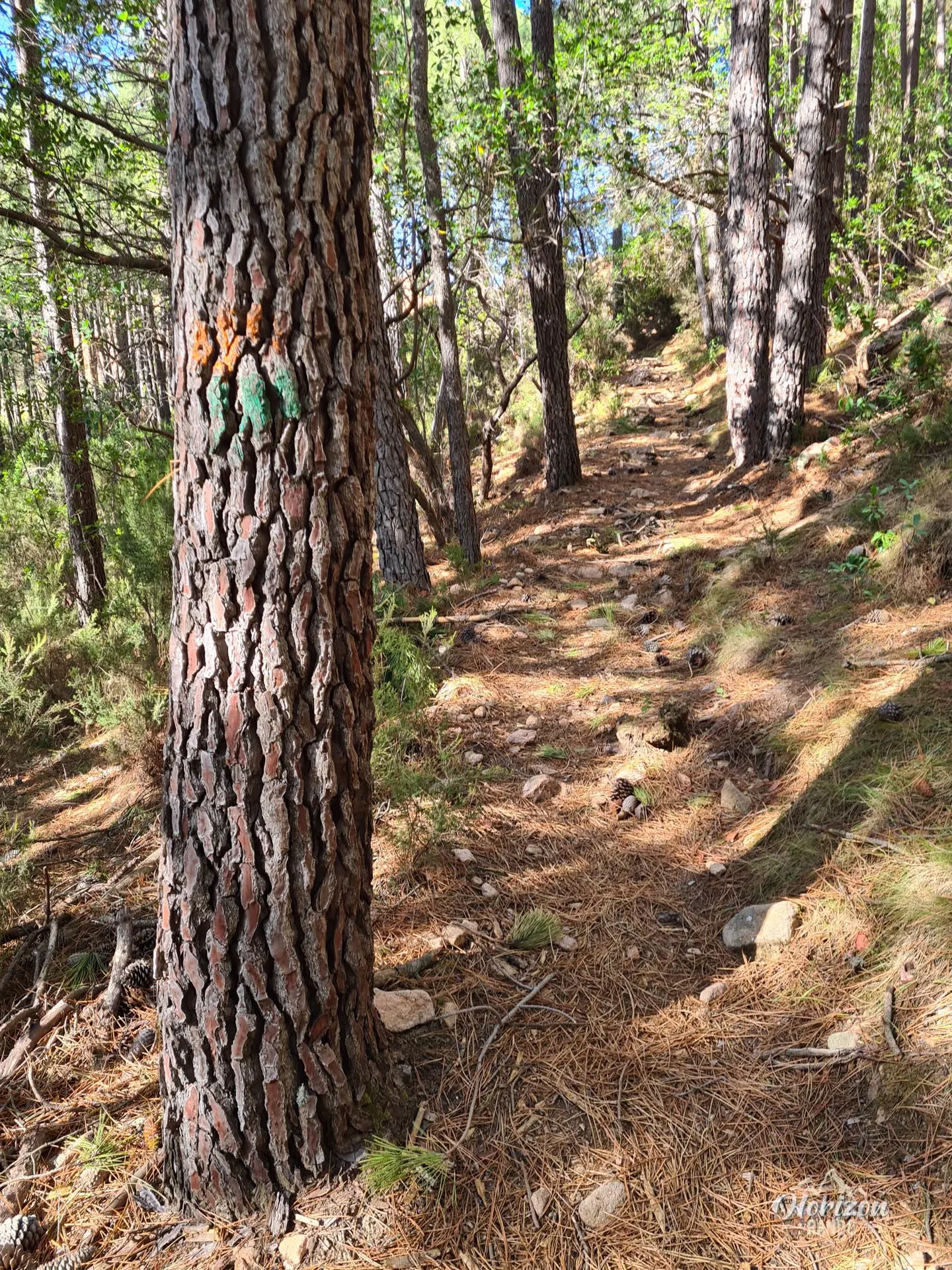 L'ascension se divise en deux parties distinctes : la première moitié se déroule en forêt, sur un sentier bien balisé (orange et vert), avec une pente régulière et sans difficulté particulière.