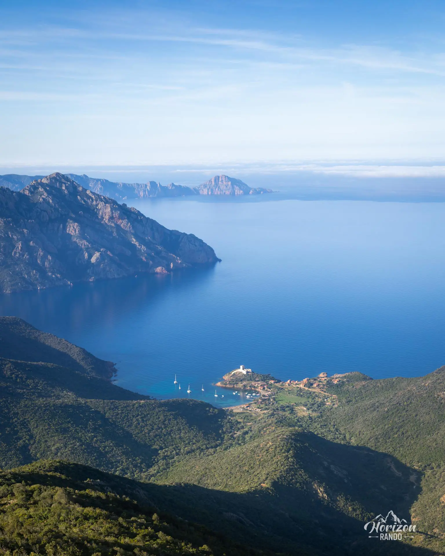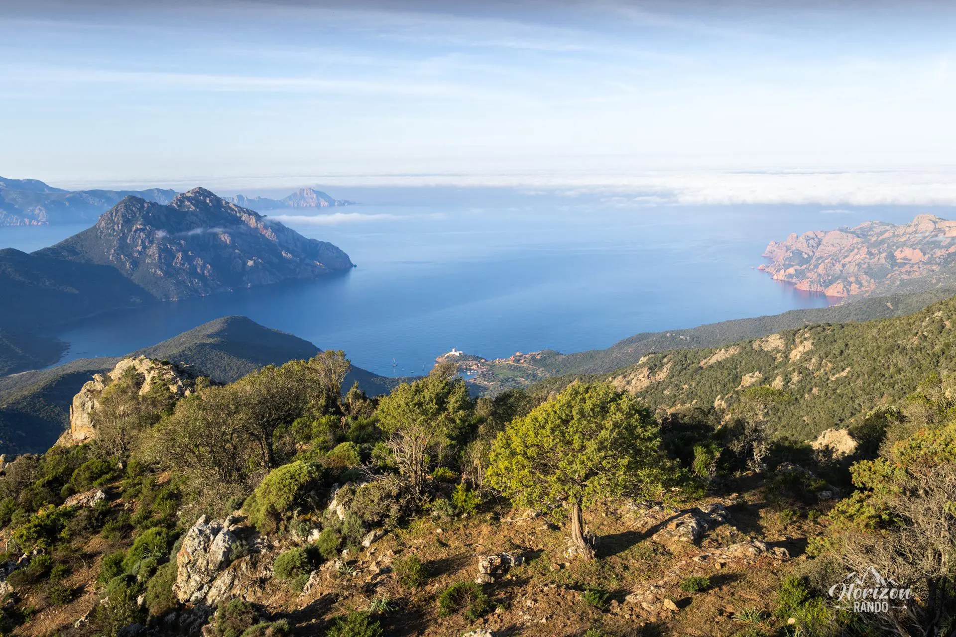 L'itinéraire évolue longuement sur une large crête surplombant la mer des deux côtés, offrant des panoramas exceptionnels sur le golfe de Girolata et la réserve naturelle de Scandola. Si vous avez la condition physique et le temps nécessaires, ce parcours est bien plus intéressant que le classique sentier du facteur, et l'intérêt de cette randonnée dépasse largement la simple visite du village.
