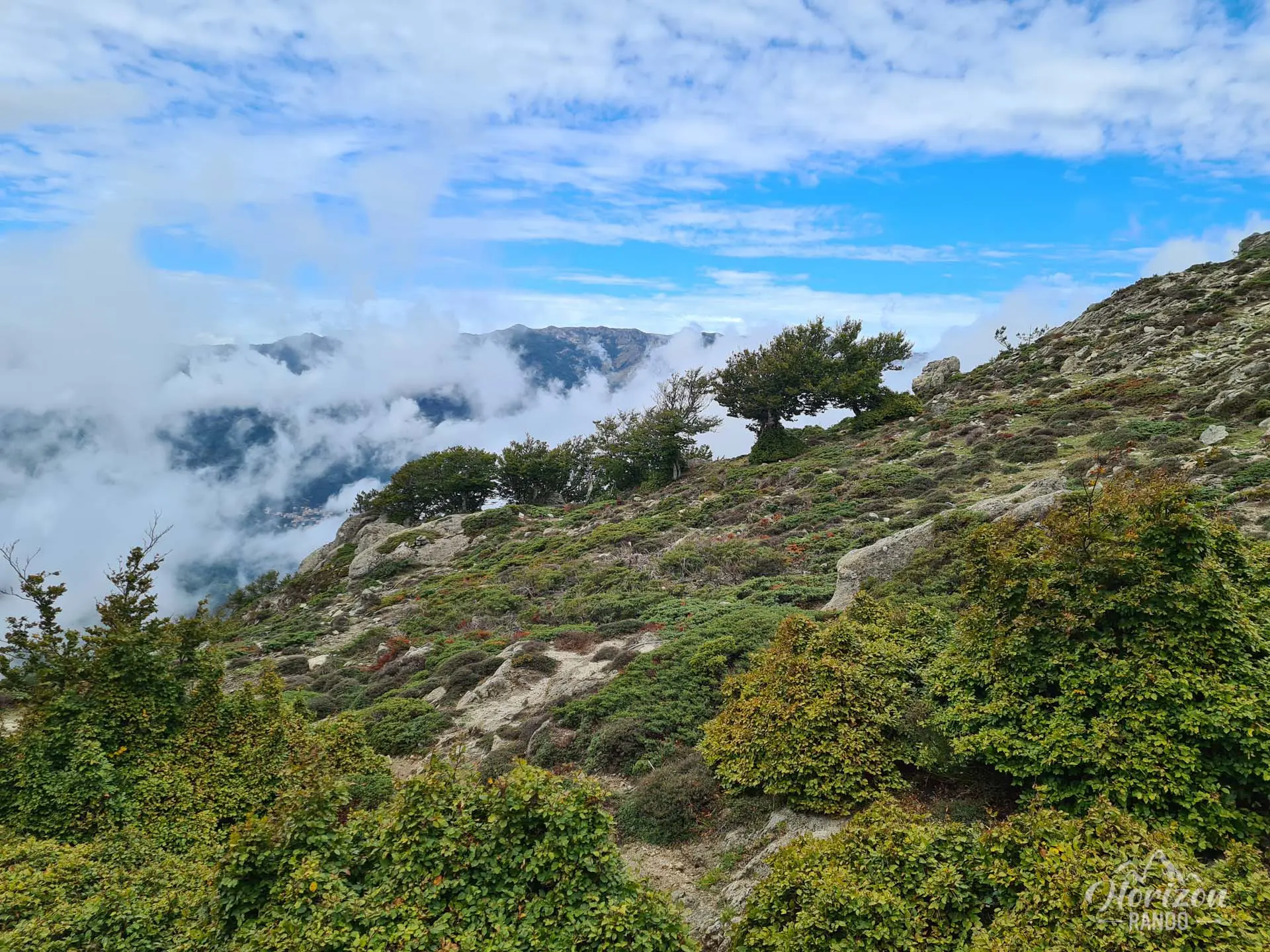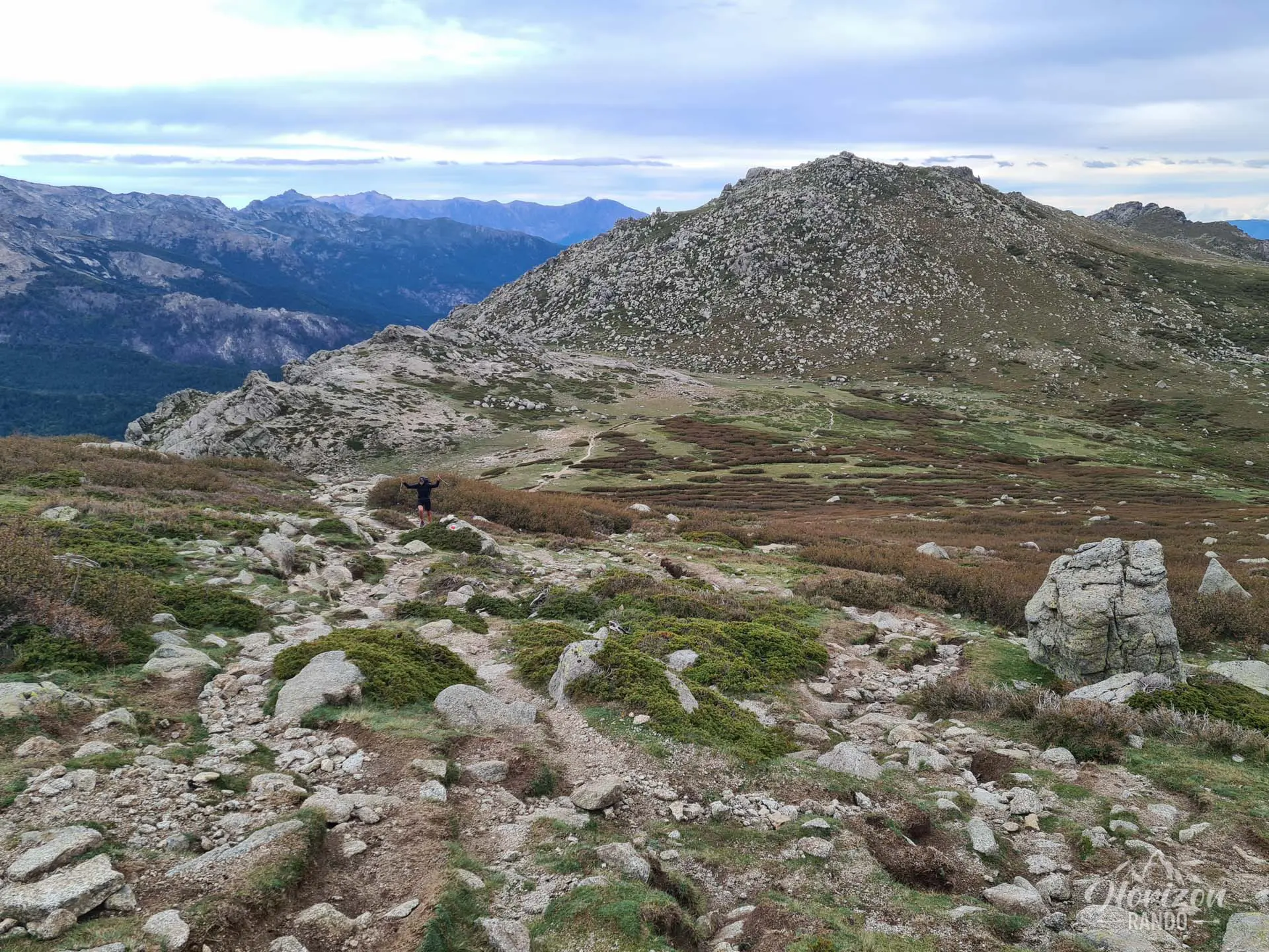 Le sentier poursuit ensuite en crête pendant environ deux heures, serpentant entre les versants ouest et est. Le terrain alterne entre sections roulantes et passages rocheux plus techniques, avec notamment un passage dans les éboulis après la Punta di Campitellu. Des dalles en dévers deviennent particulièrement glissantes par temps humide.