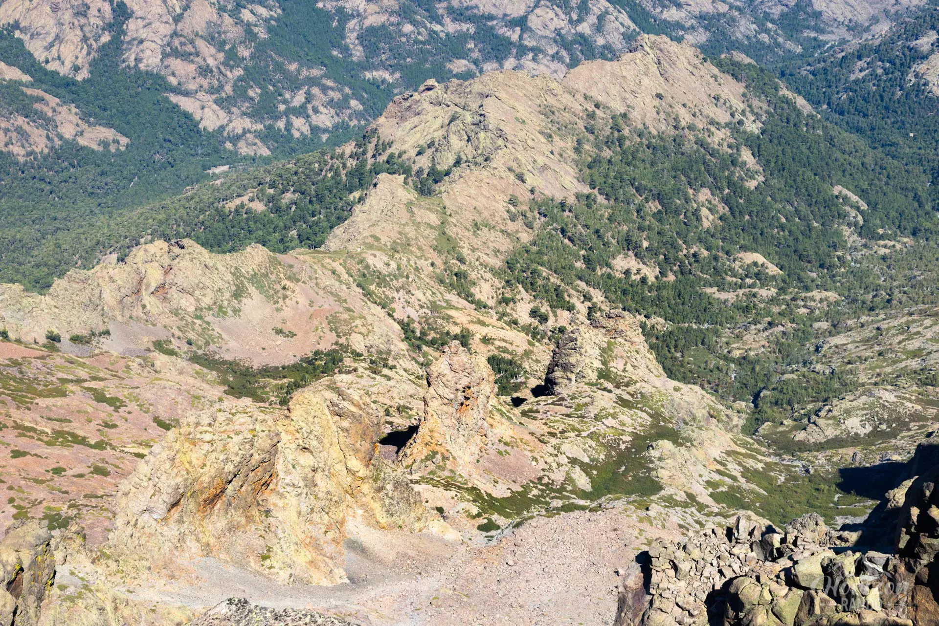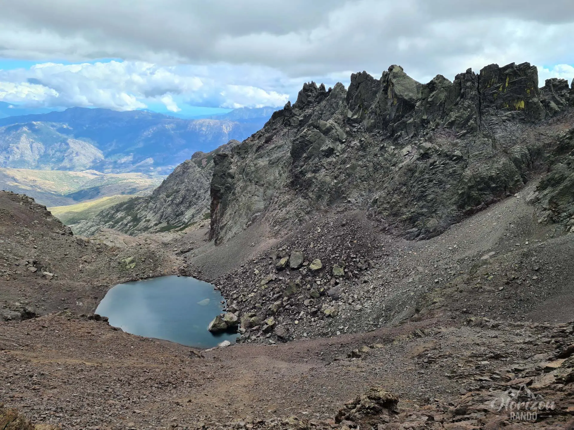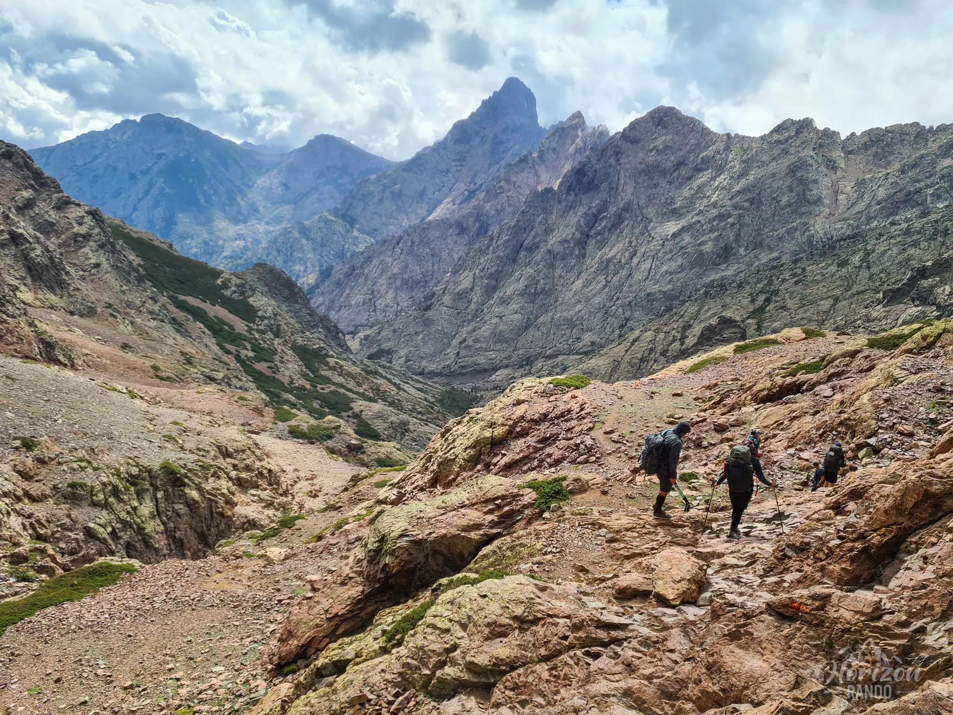 La descente vers le refuge de Tighjettu s'effectue ensuite sur un terrain technique alternant pierriers et blocs rocheux sur près de 1 000 mètres de dénivelé, sollicitant fortement genoux et chevilles.