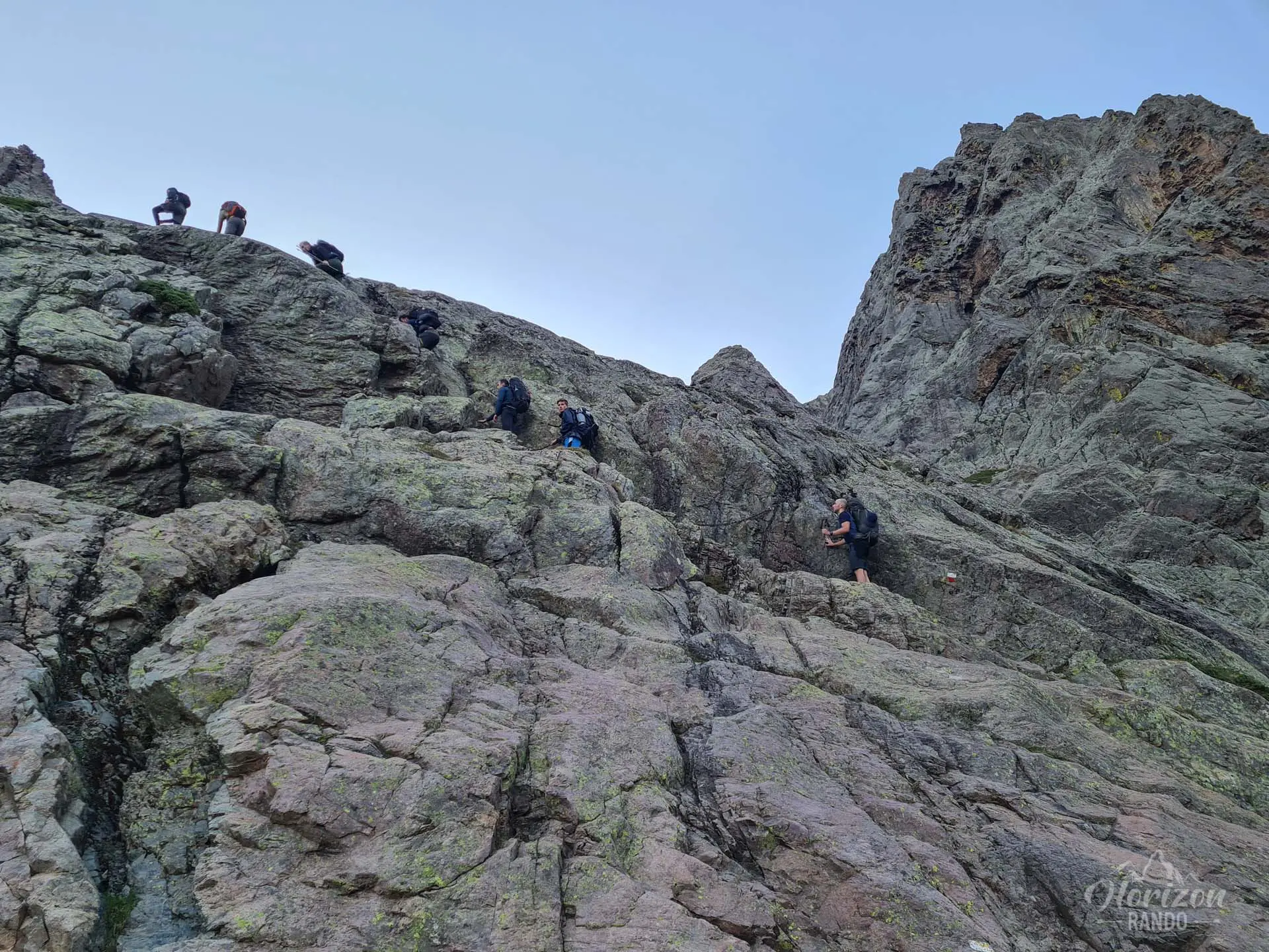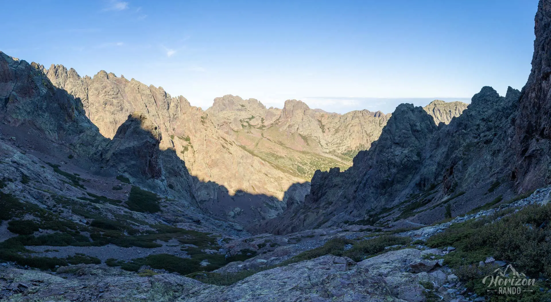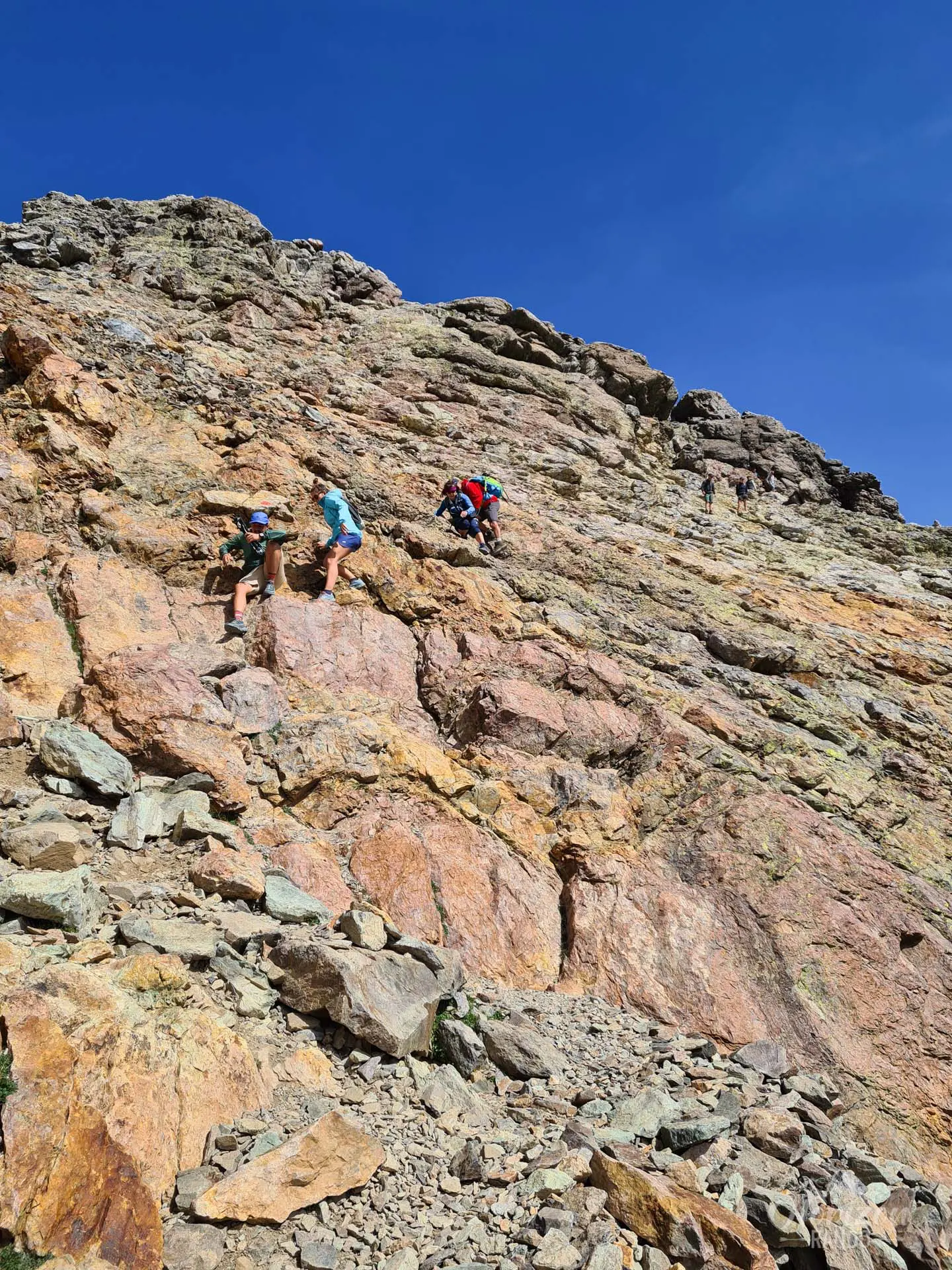 La descente vers le refuge de Tighjettu s'effectue ensuite sur un terrain technique alternant pierriers et blocs rocheux sur près de 1 000 mètres de dénivelé, sollicitant fortement genoux et chevilles.