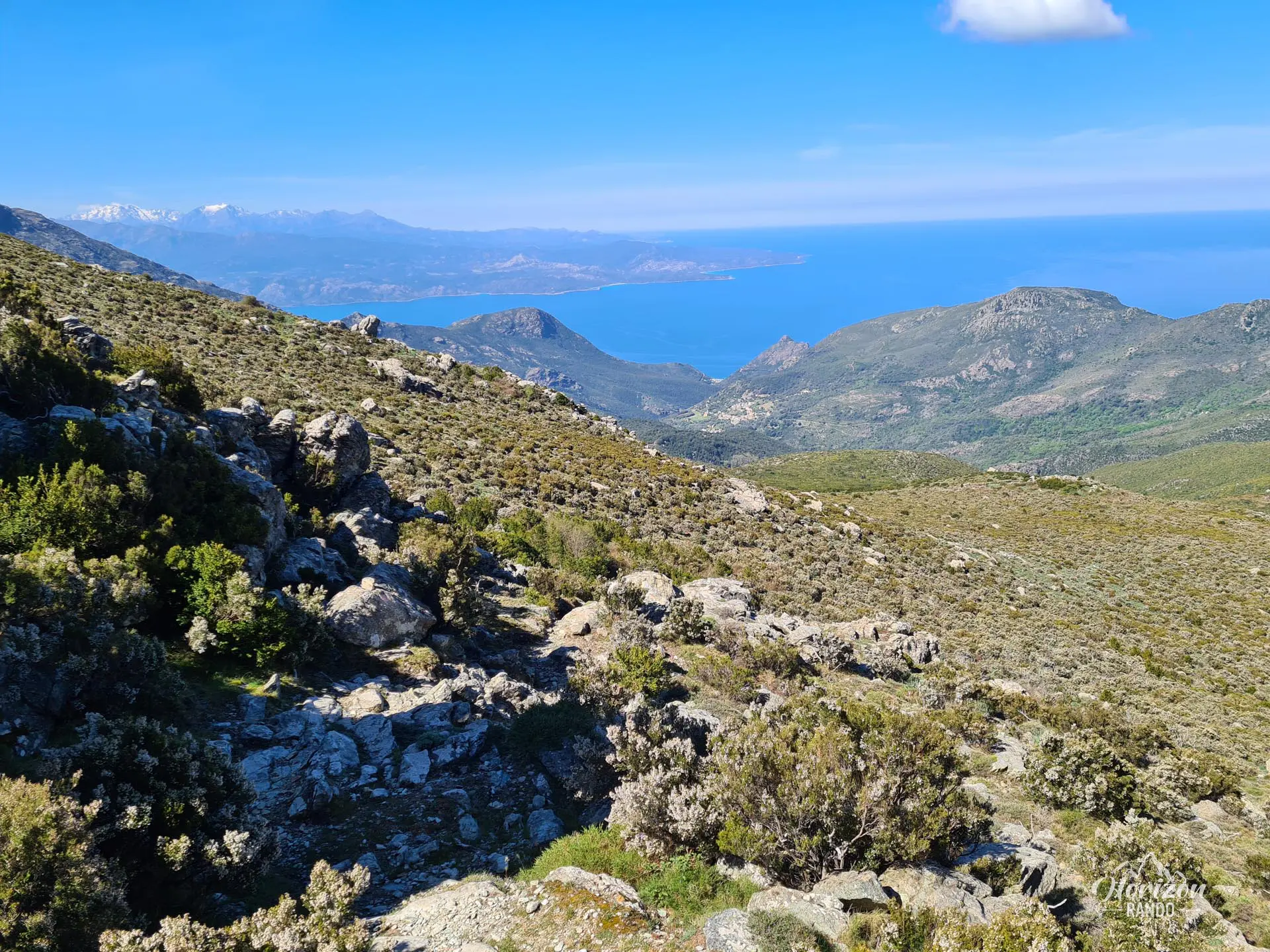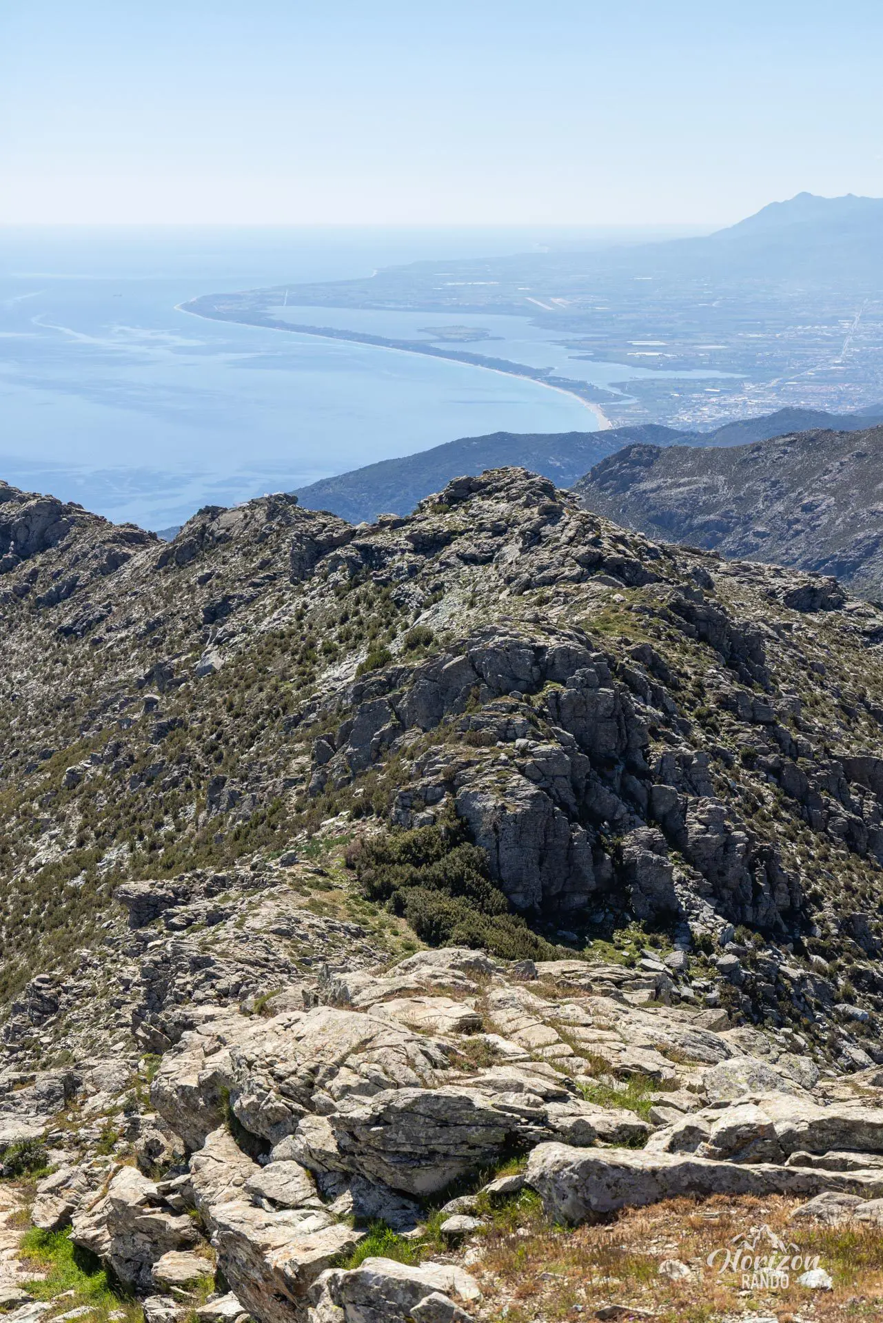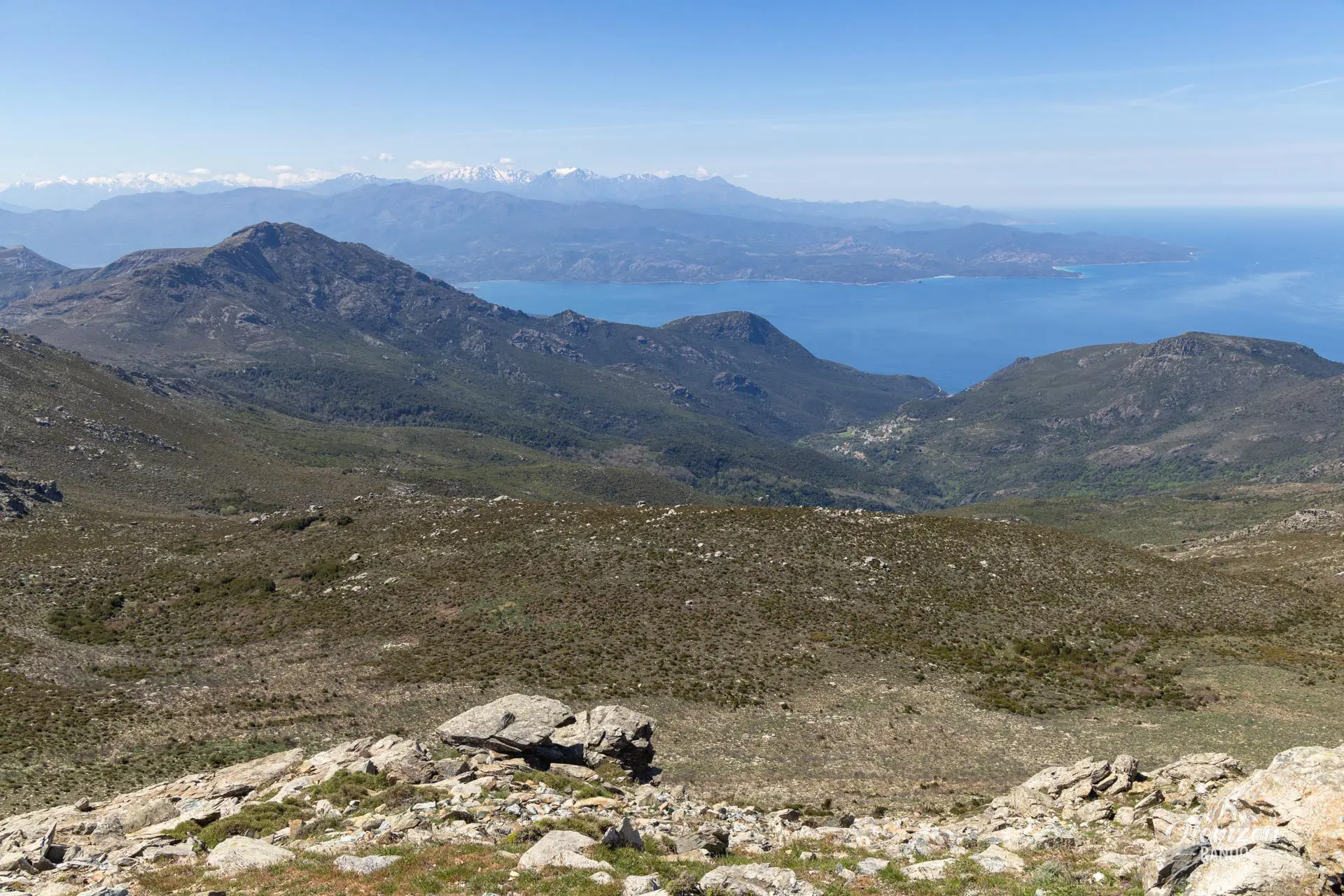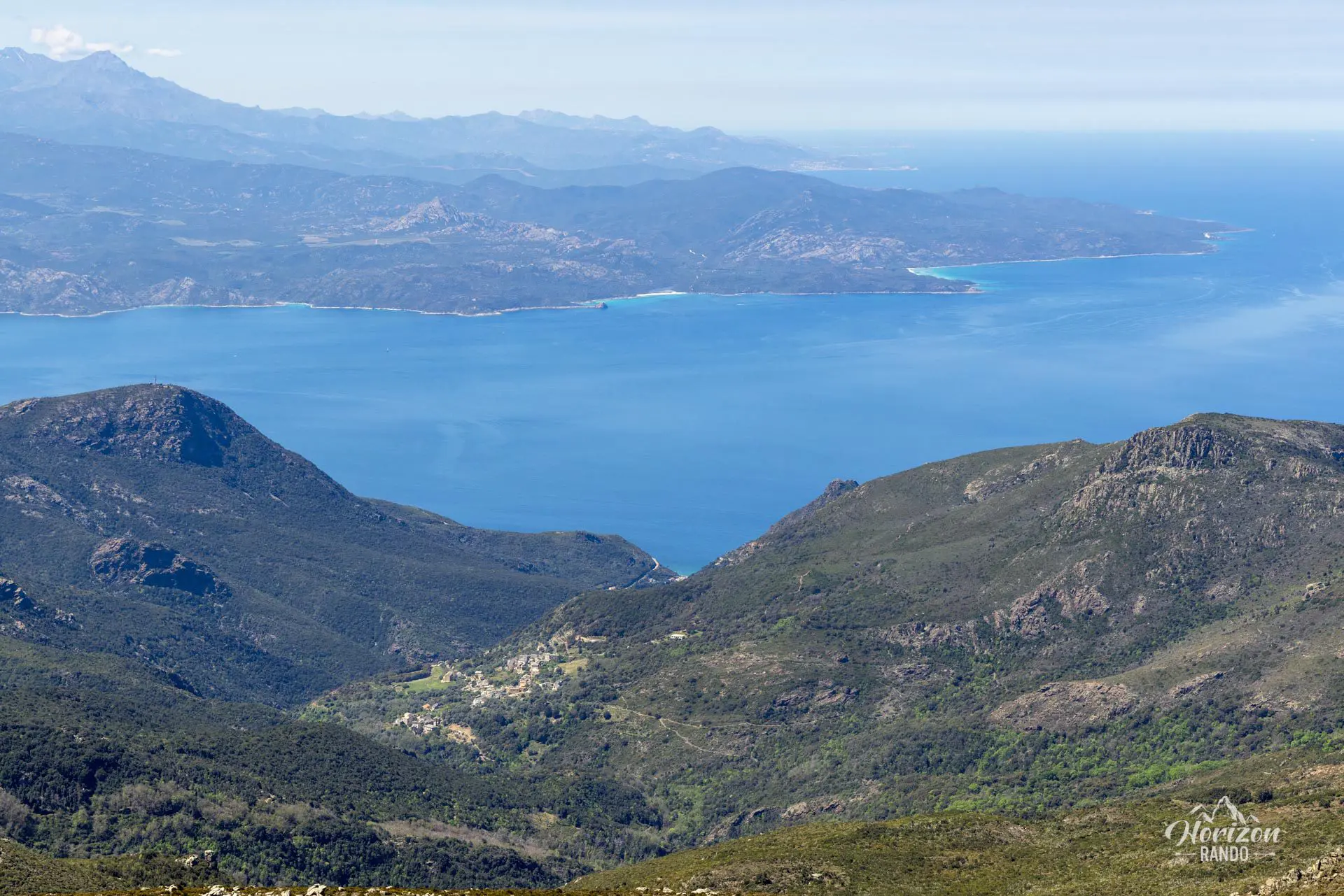 - Le panorama très ouvert depuis le sommet, embrassant simultanément les deux versants du Cap Corse