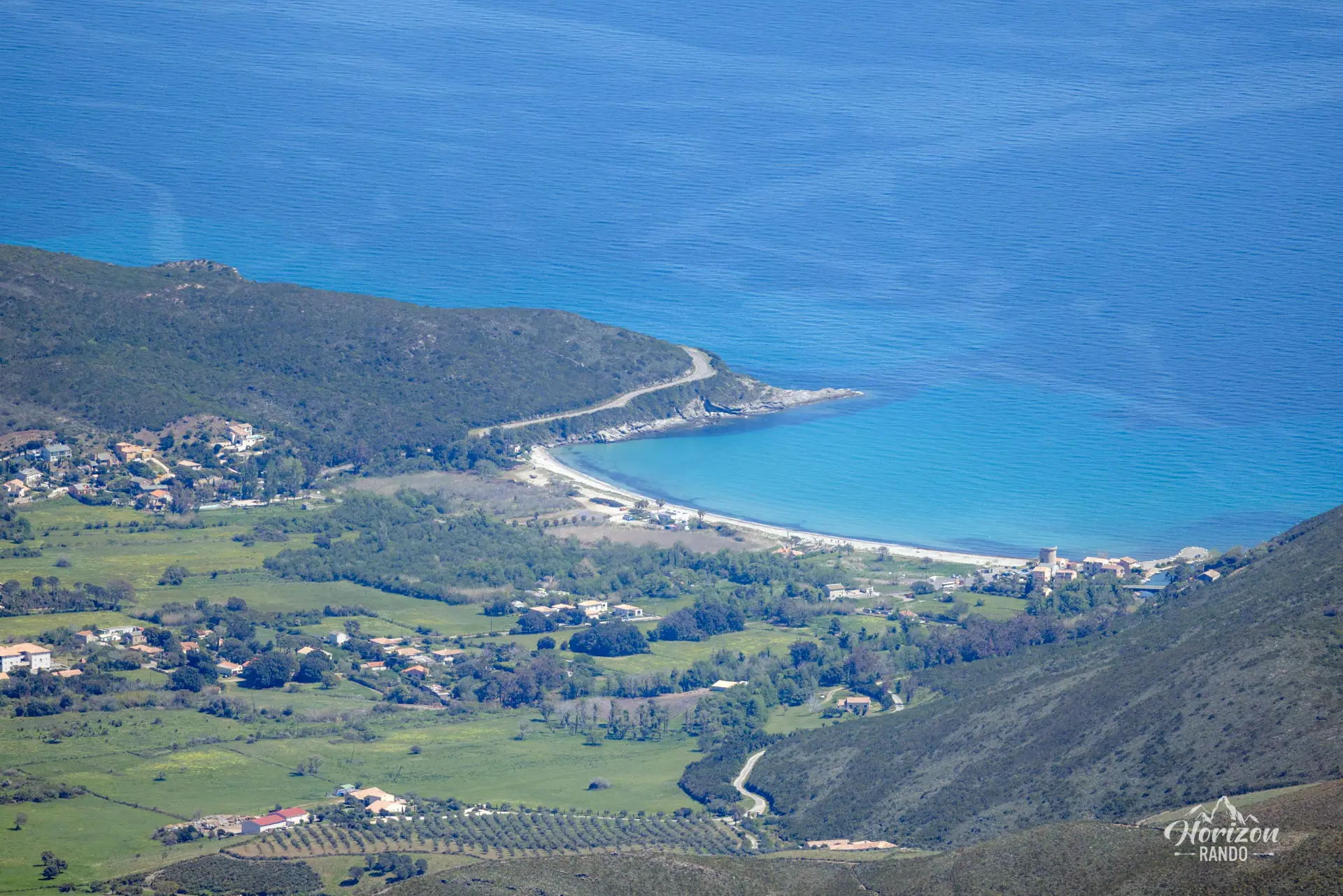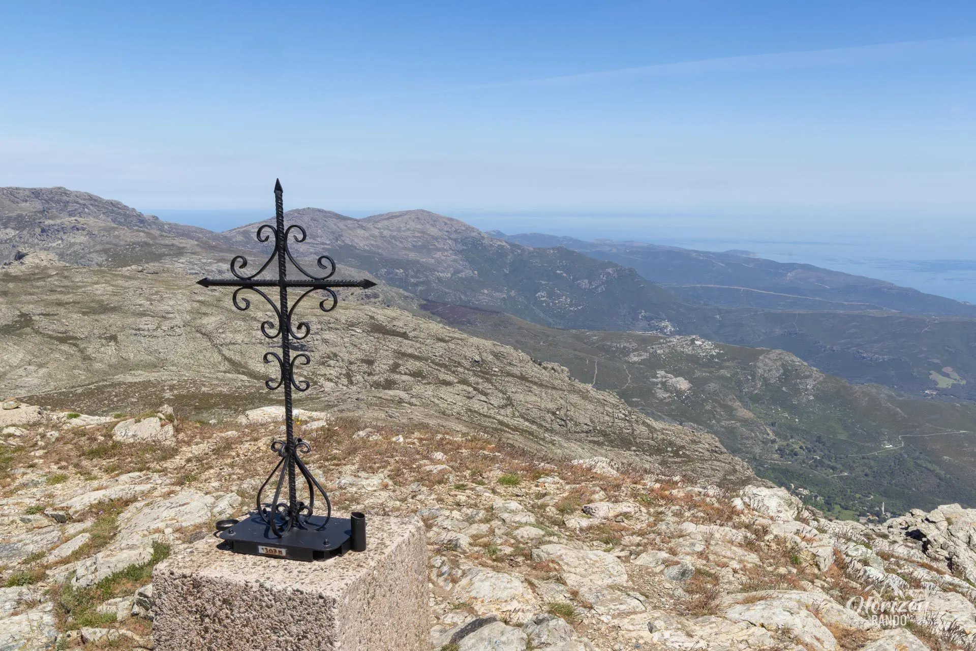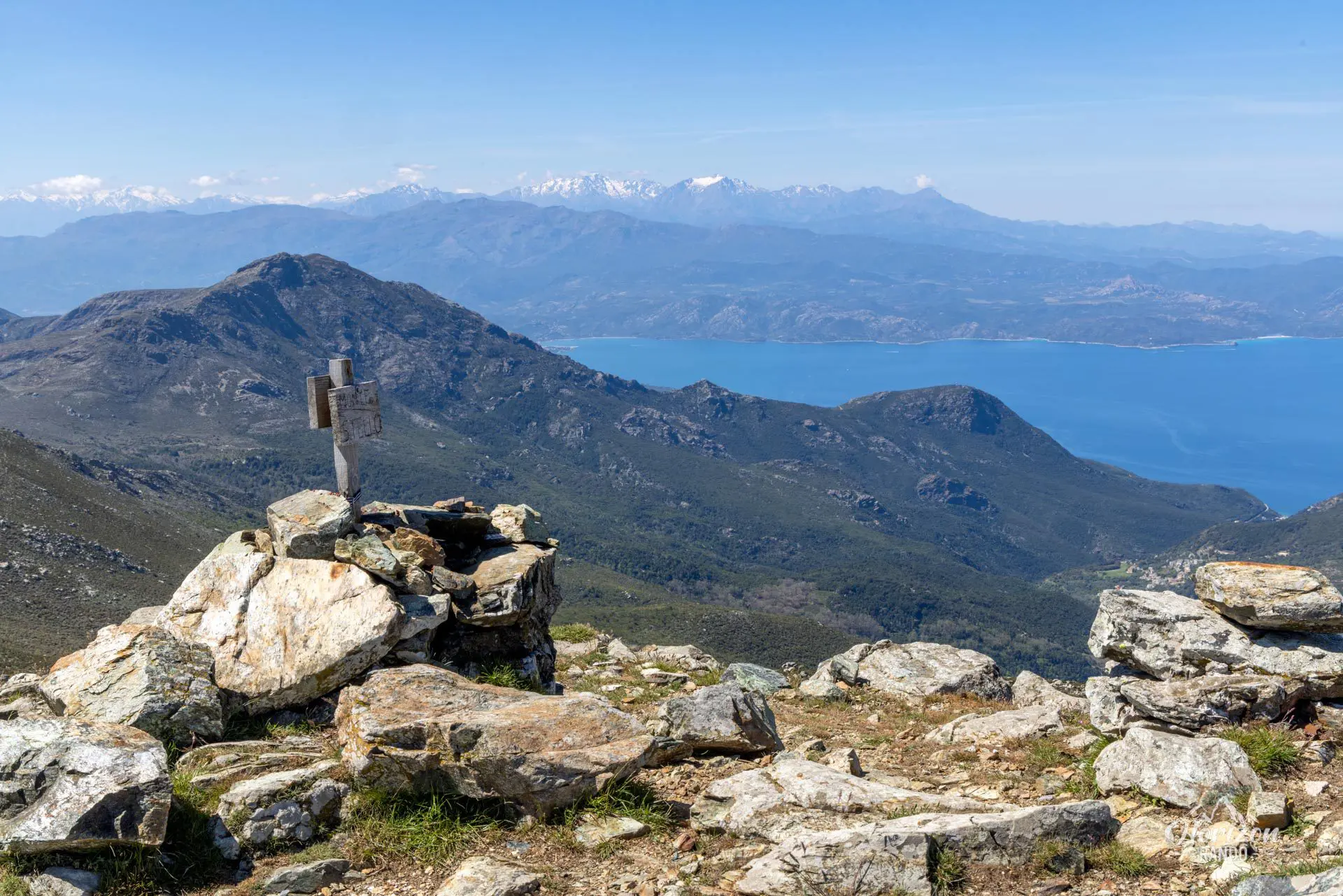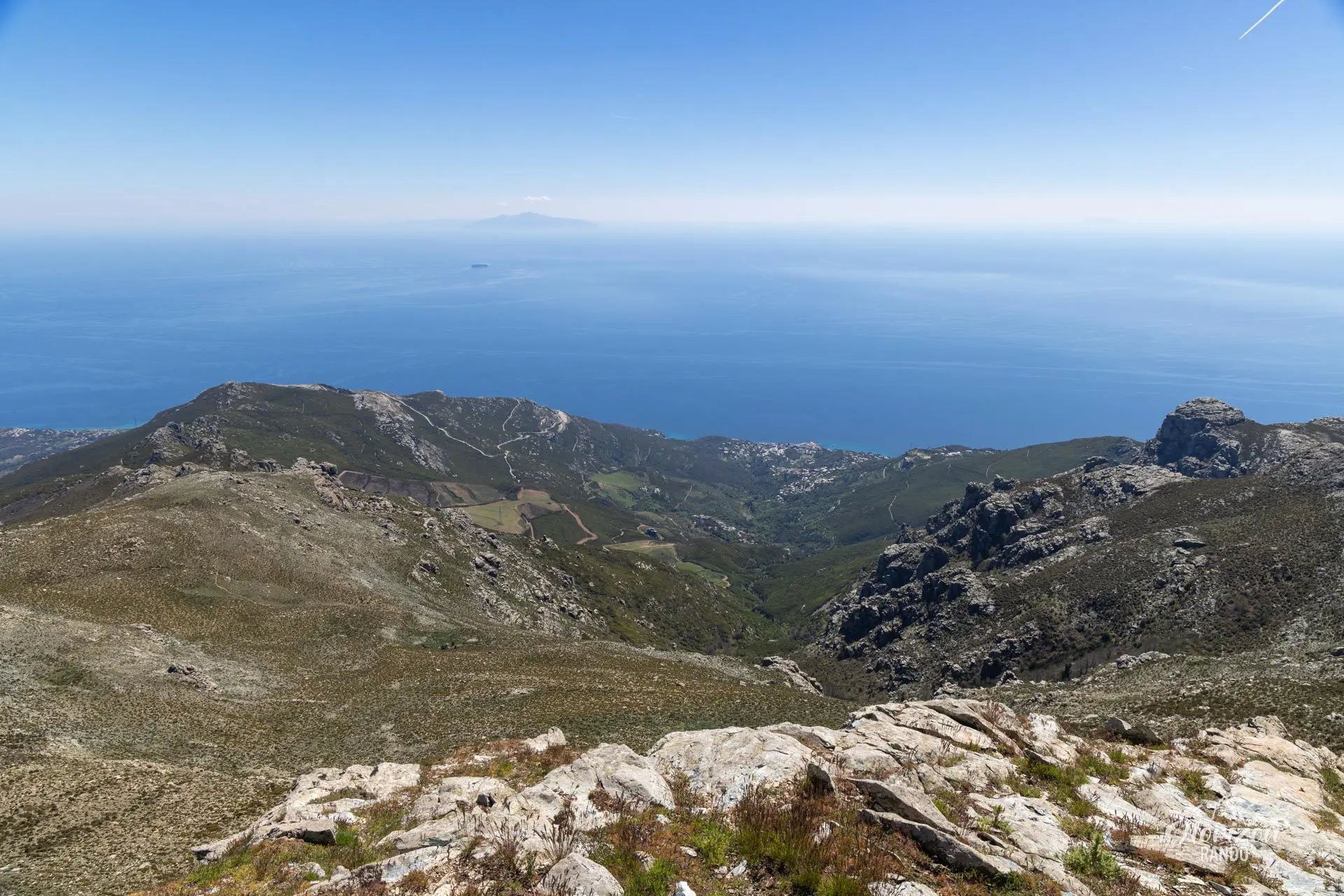 - Le panorama très ouvert depuis le sommet, embrassant simultanément les deux versants du Cap Corse