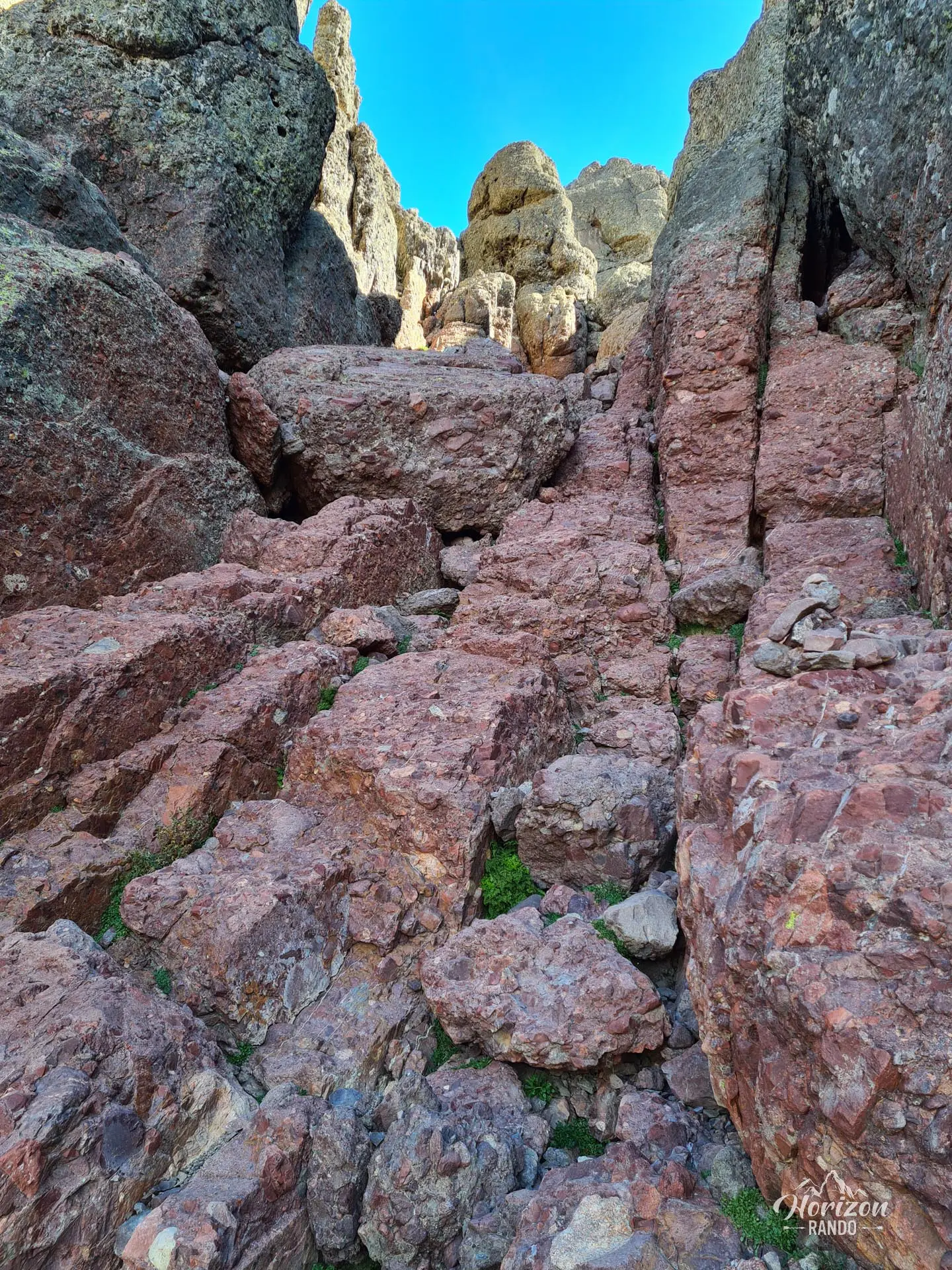 À partir du refuge, le caractère de la randonnée change radicalement. Le balisage disparaît : seuls des cairns, parfois difficiles à repérer, jalonnent désormais l'itinéraire. La navigation devient technique, particulièrement dans le chaos rocheux de l'ascension. Le parcours impose plusieurs passages d'escalade facile dans des couloirs raides et des cheminées escarpées, avec des mouvements exposés nécessitant une bonne maîtrise.