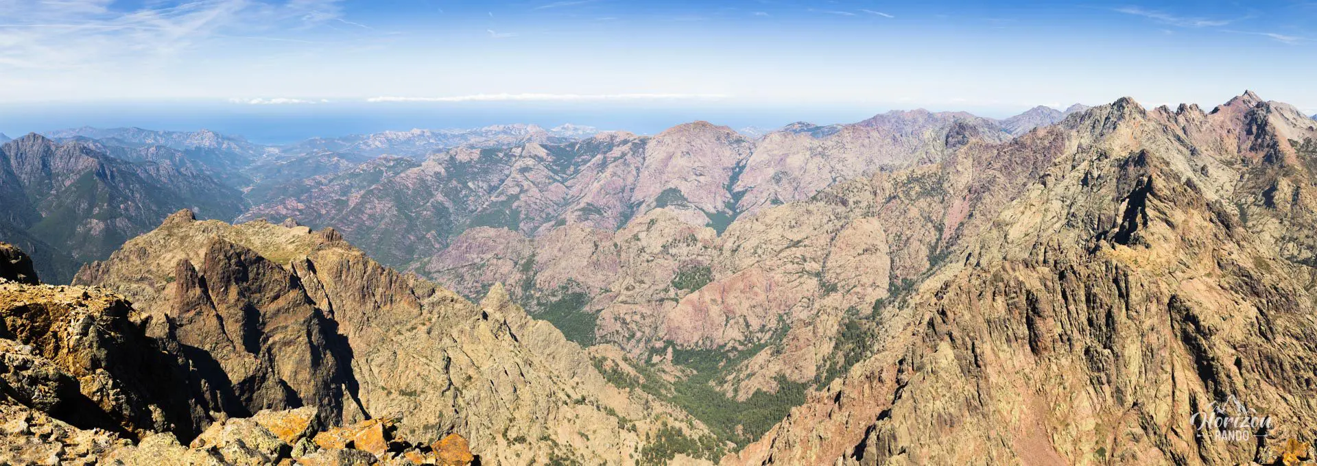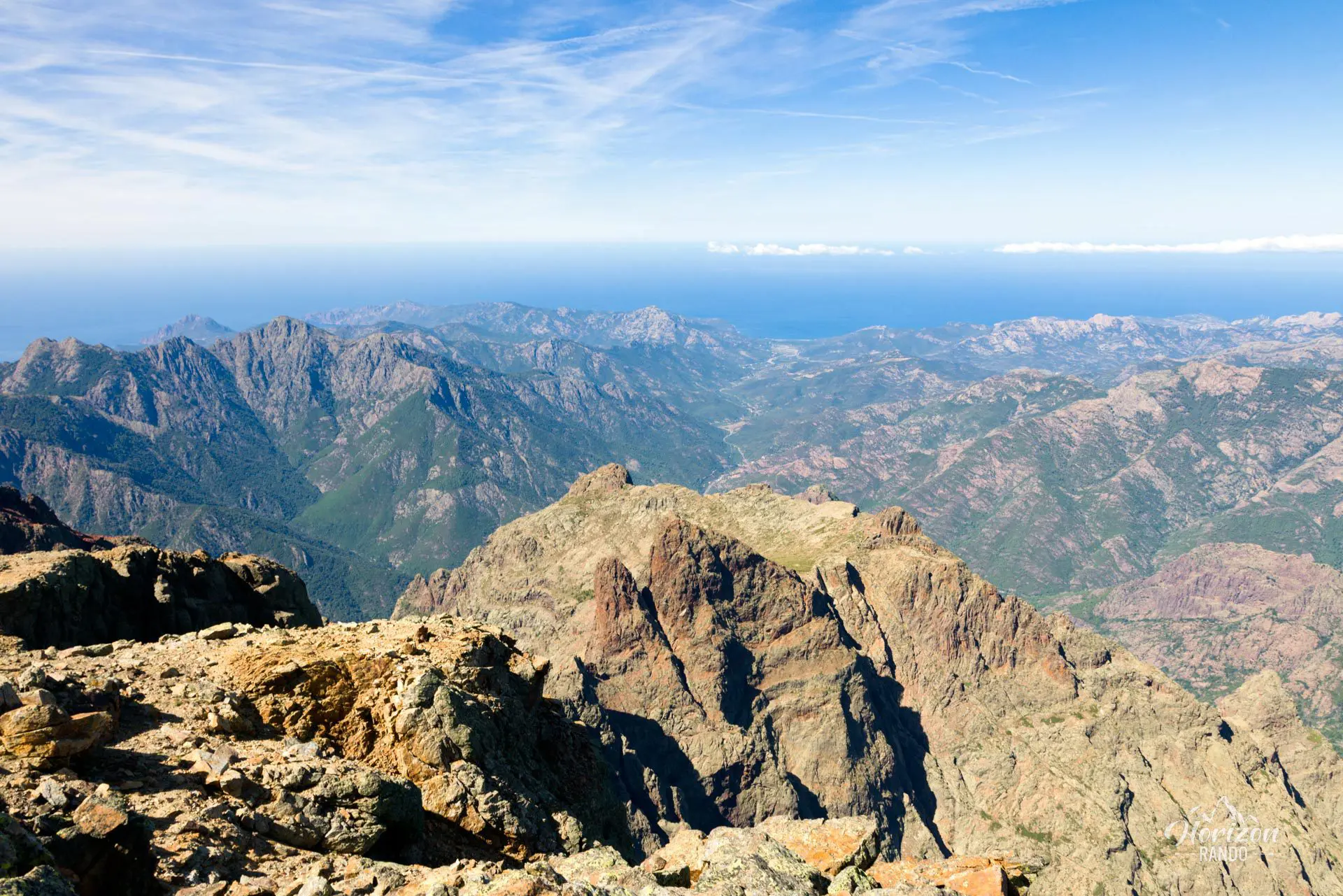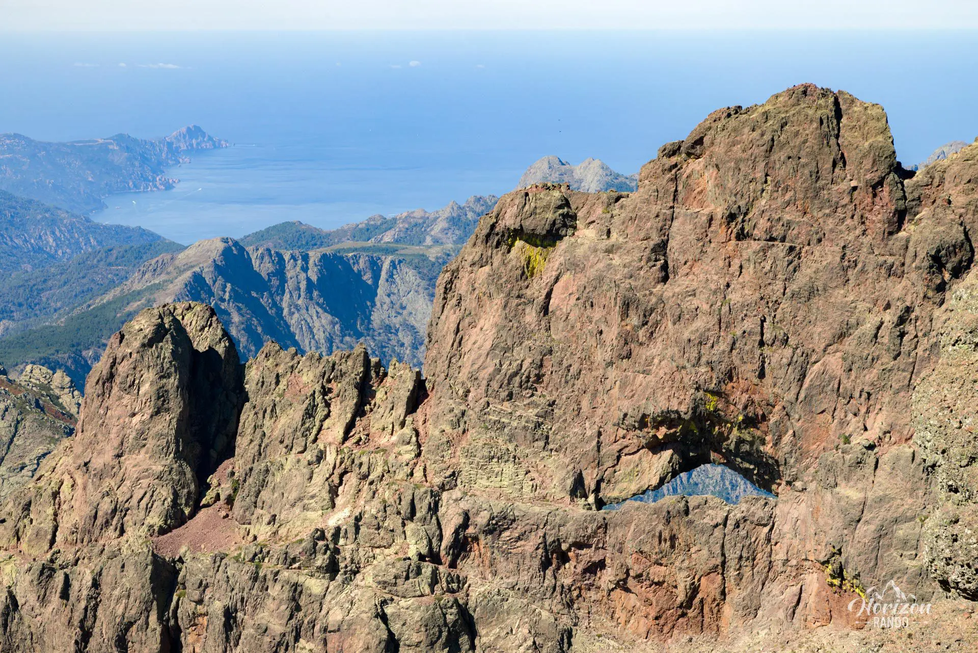 - Le panorama exceptionnel depuis le sommet : vue à 360° sur le massif du Cinto et les plus hauts sommets corses, le golfe de Porto et la Méditerranée, la vallée du Fango et le Capu Tafunatu avec son trou impressionnant.