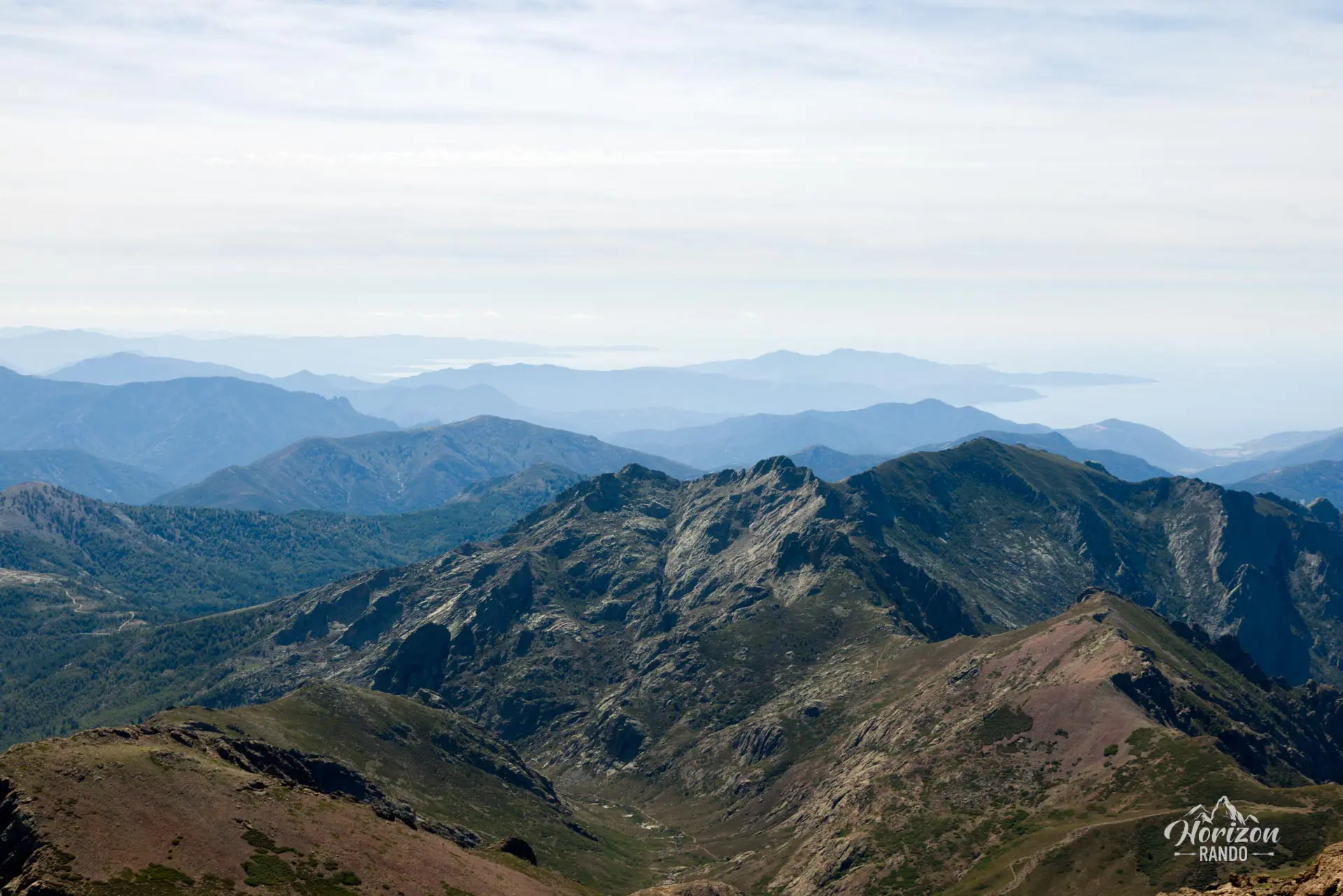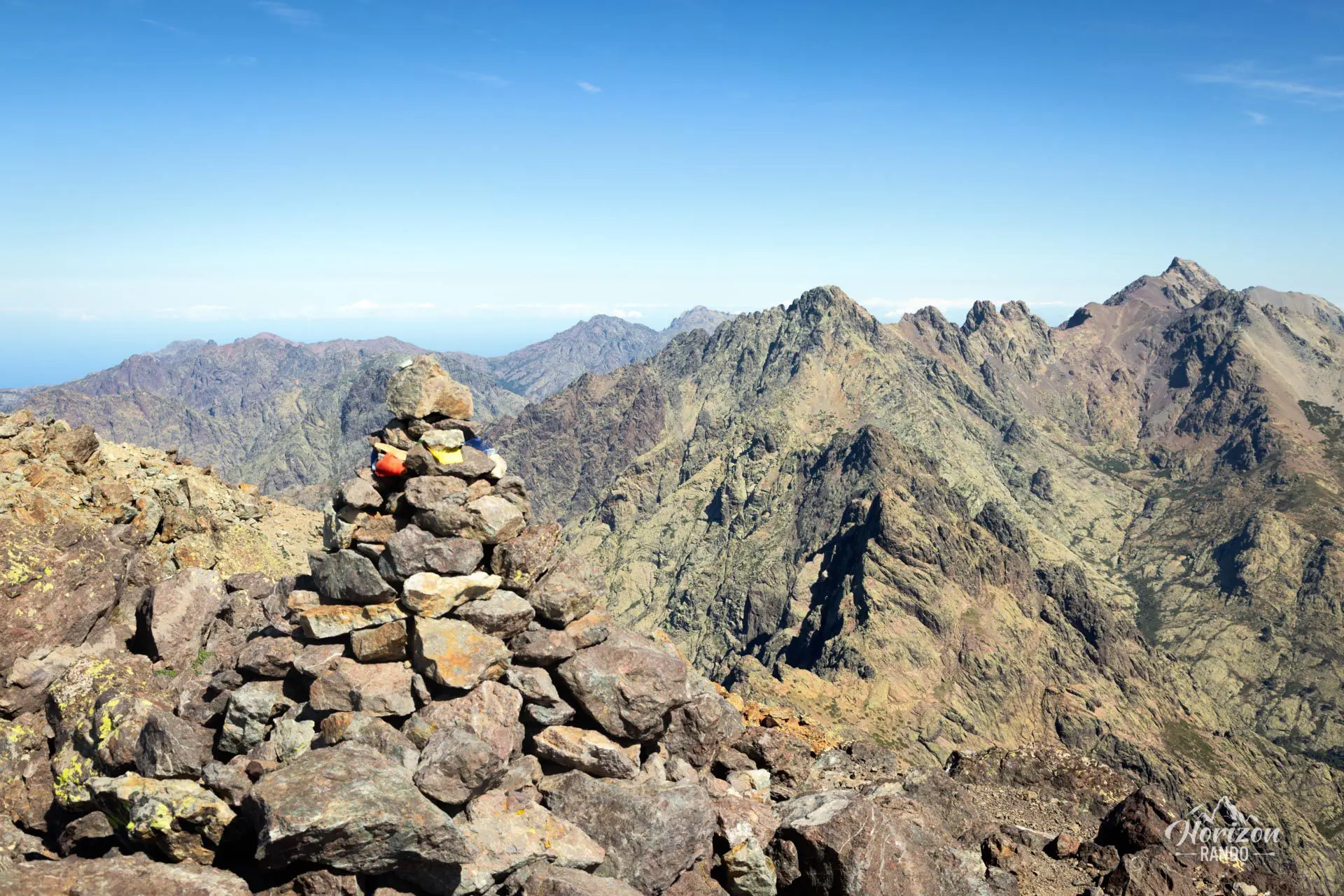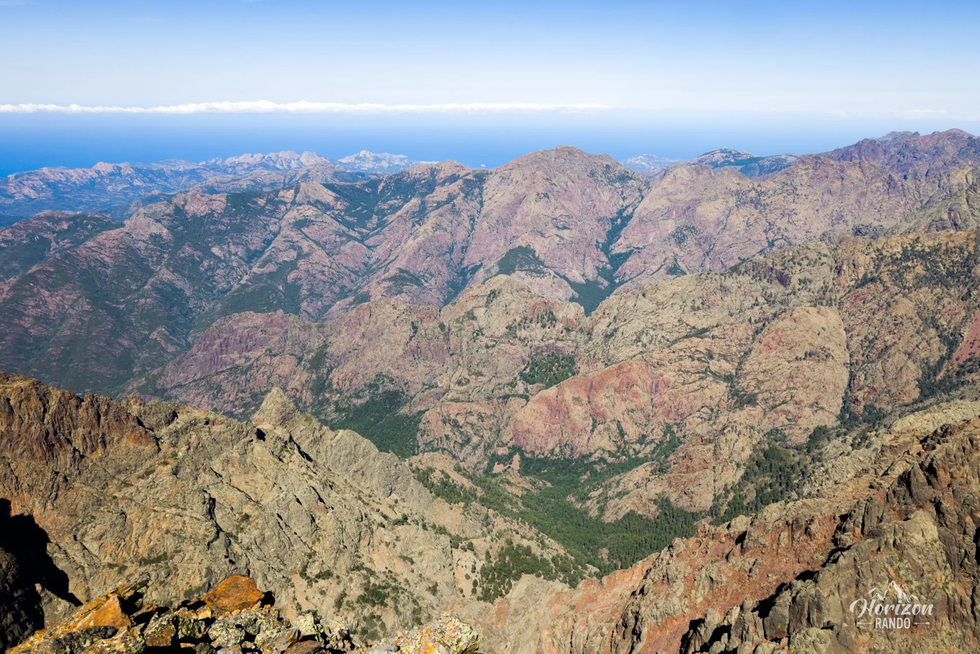 - Le panorama exceptionnel depuis le sommet : vue à 360° sur le massif du Cinto et les plus hauts sommets corses, le golfe de Porto et la Méditerranée, la vallée du Fango et le Capu Tafunatu avec son trou impressionnant.