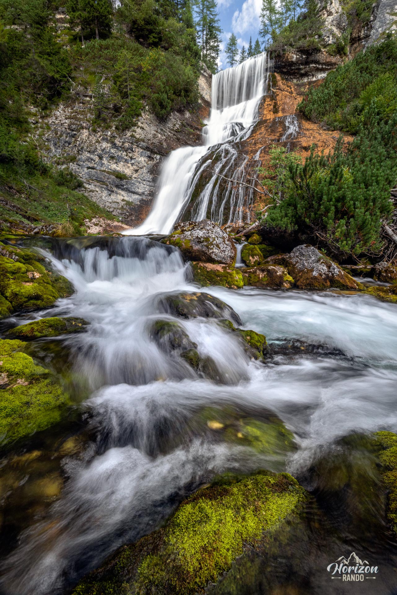 La randonnée des Chutes de Fanes (Cascate di Fanes) est un incontournable de Cortina d'Ampezzo, au cœur du Parc Naturel Régional des Dolomites d'Ampezzo. Cet itinéraire en boucle remonte le cours du Rio Fanes à travers de profondes gorges et une forêt de conifères, dévoilant une succession de cascades dont la principale, haute d'une centaine de mètres, figure parmi les plus spectaculaires des Dolomites.