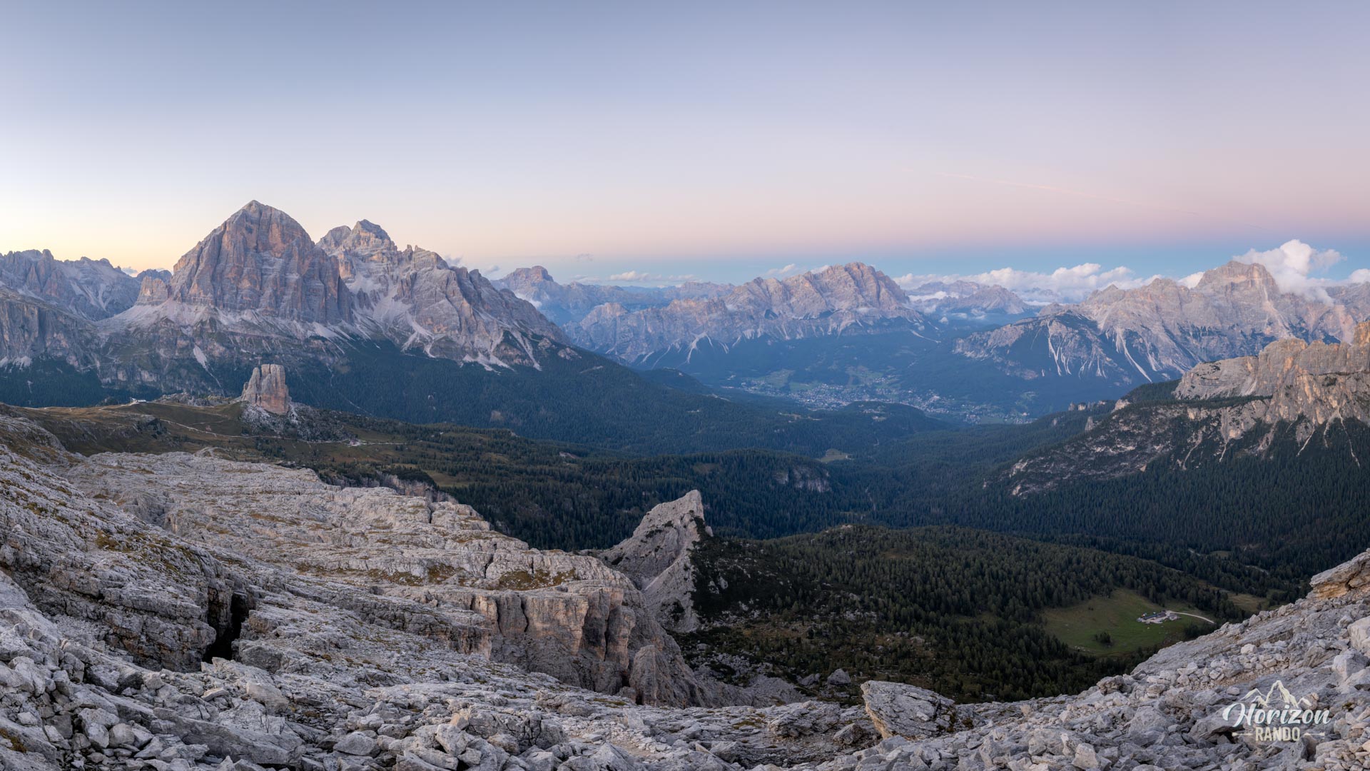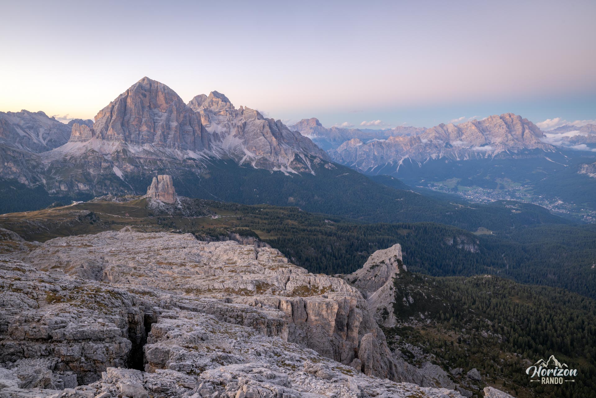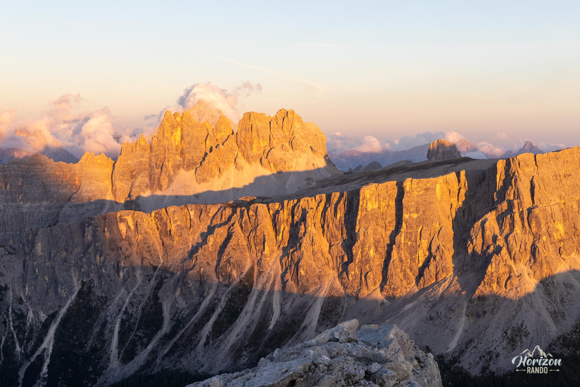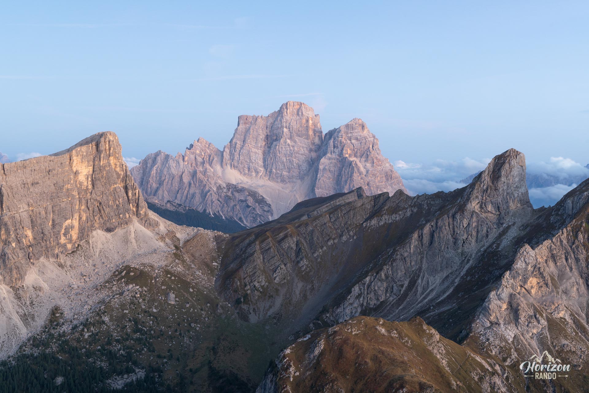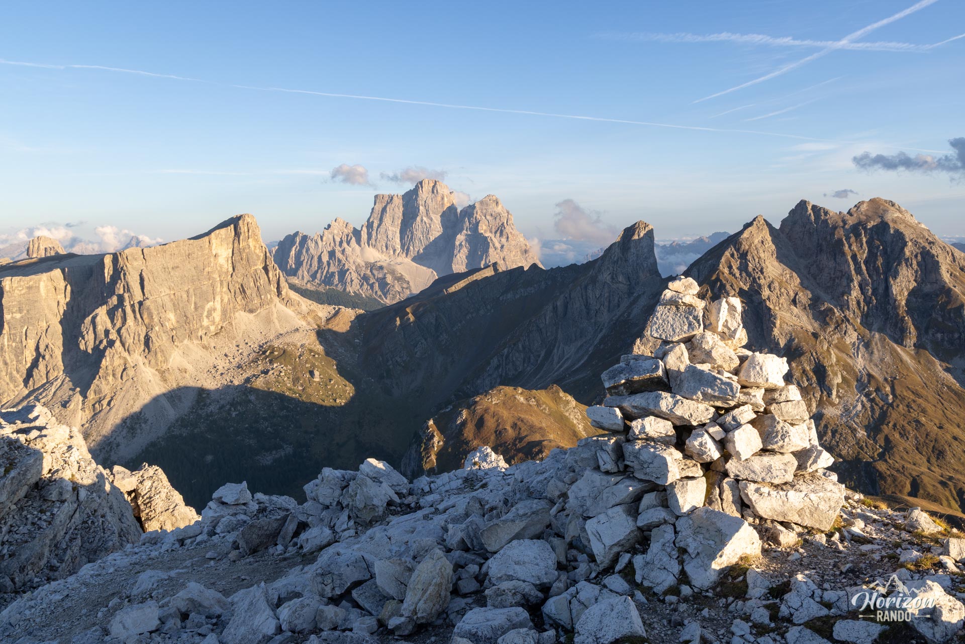 - Le panorama à 360° depuis le sommet de Ra Gusela et le Monte Nuvolau : Cinque Torri, Tofane, Croda da Lago, Marmolada, Civetta — un condensé spectaculaire des grands sommets des Dolomites.
