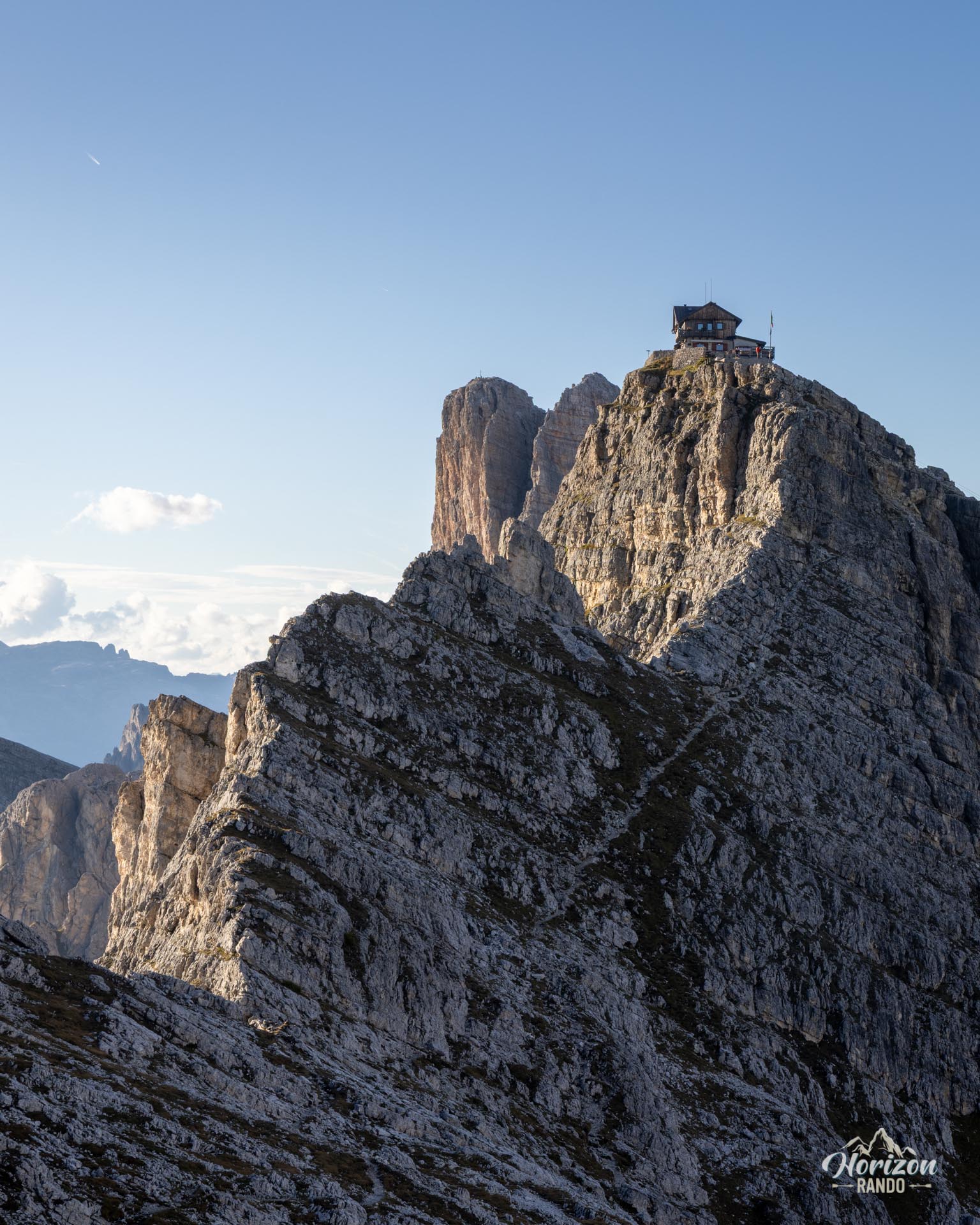 Le refuge, le plus ancien des Dolomites (1883), occupe une position impressionnante, perché au sommet du Monte Nuvolau, au bord du vide. Un circuit court, accessible et spectaculaire, qui concentre en quelques heures le meilleur des Dolomites.