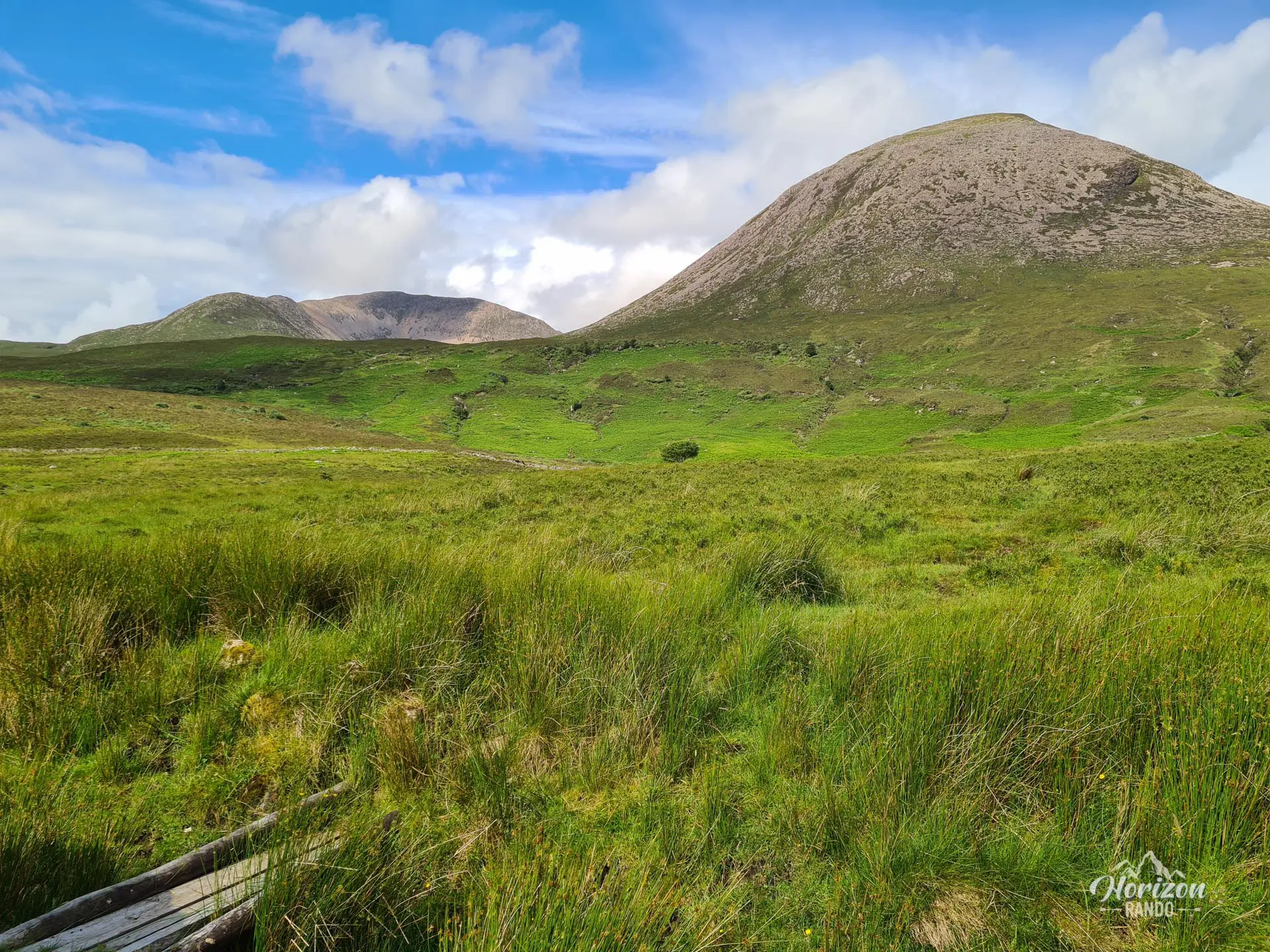 Cet itinéraire difficile se déroule en partie hors sentier et nécessite une bonne condition physique. L'approche débute par une traversée de zones marécageuses avant d'atteindre le pied de la montagne. L'ascension initiale vers Beinn na Caillich est très raide et se fait sur un terrain accidenté, alternant entre herbe, bruyère, éboulis et champs de rochers. L'absence de sentier marqué oblige chacun à tracer sa propre voie dans cette pente soutenue, rendant la progression physiquement exigeante.