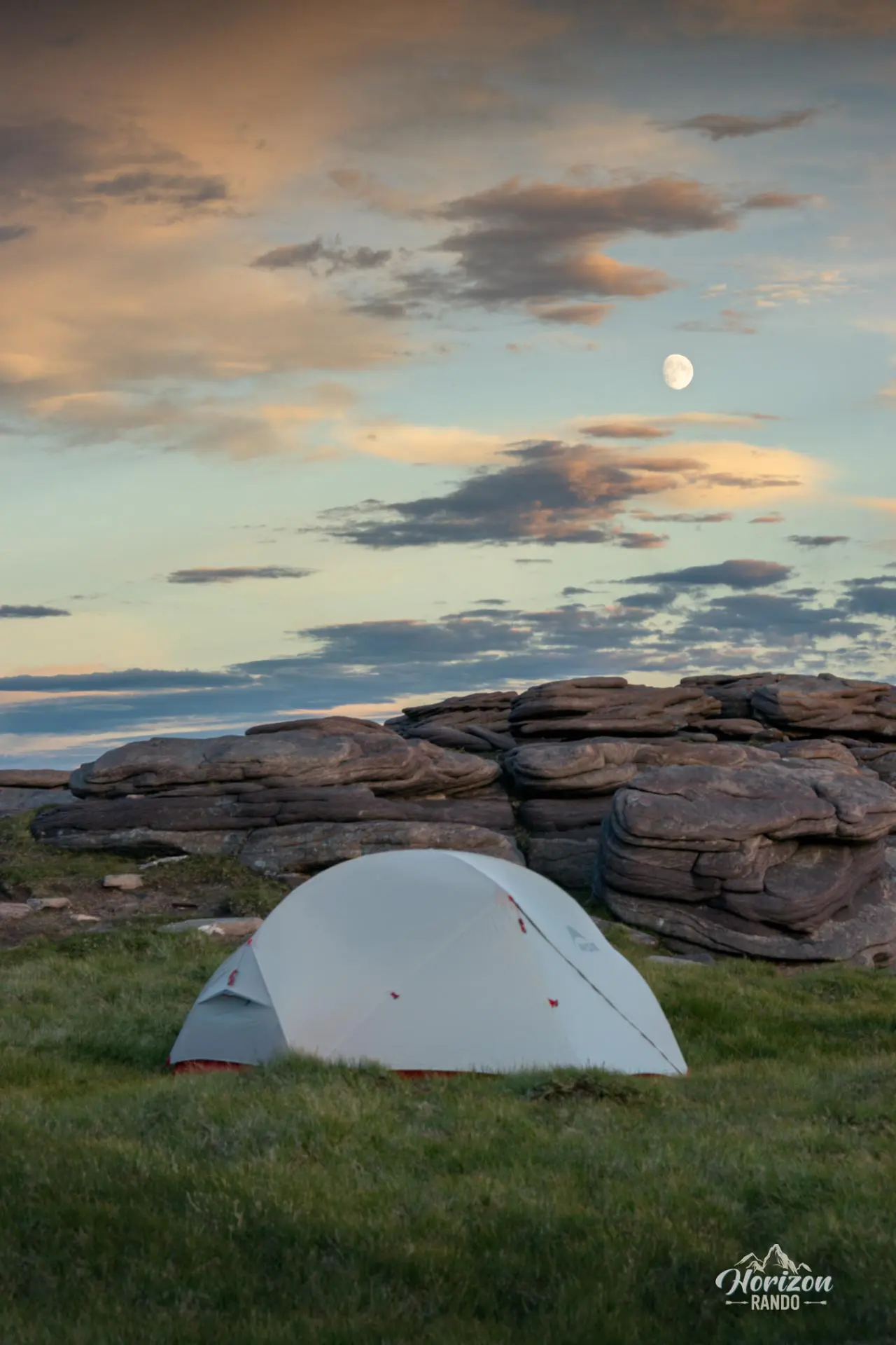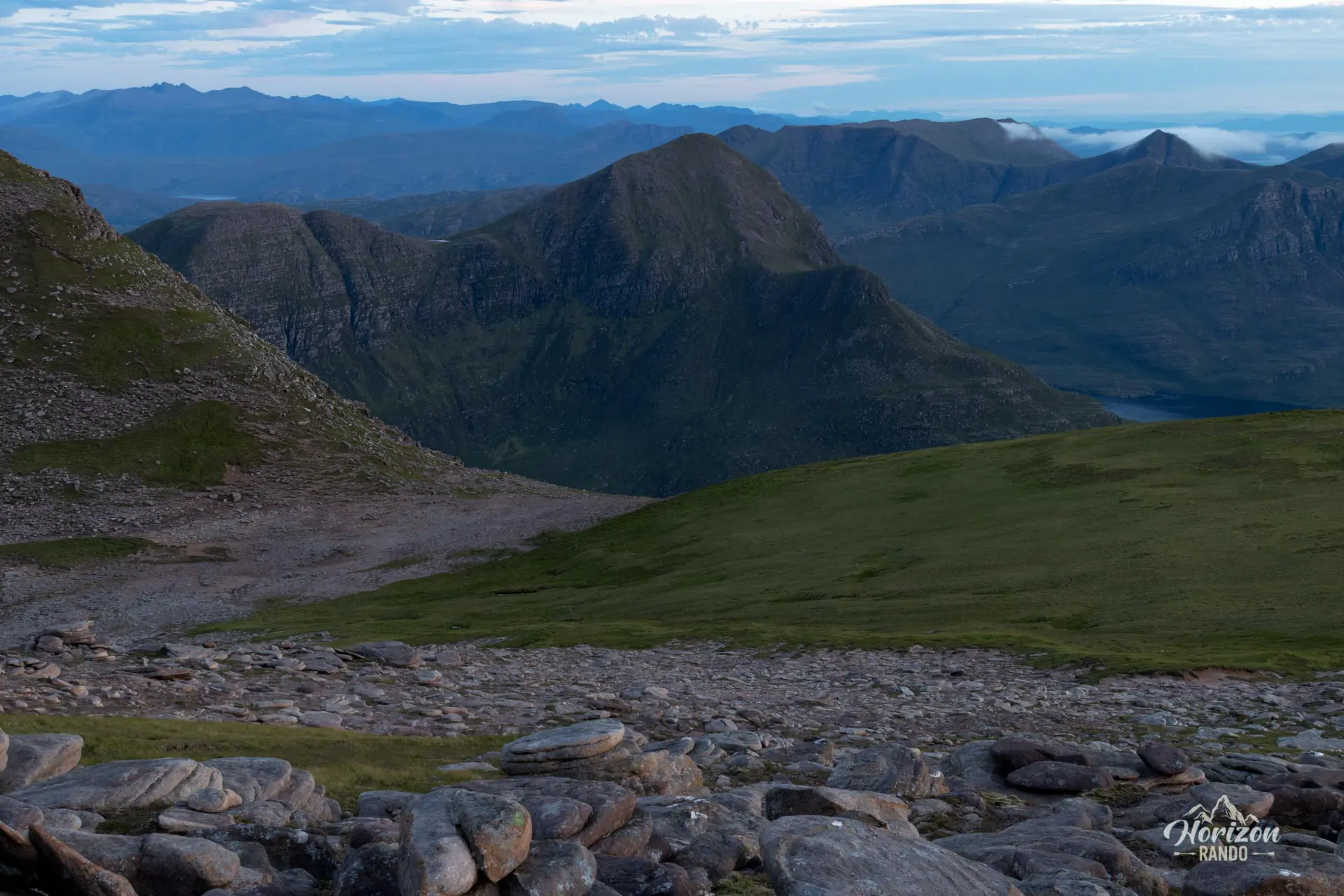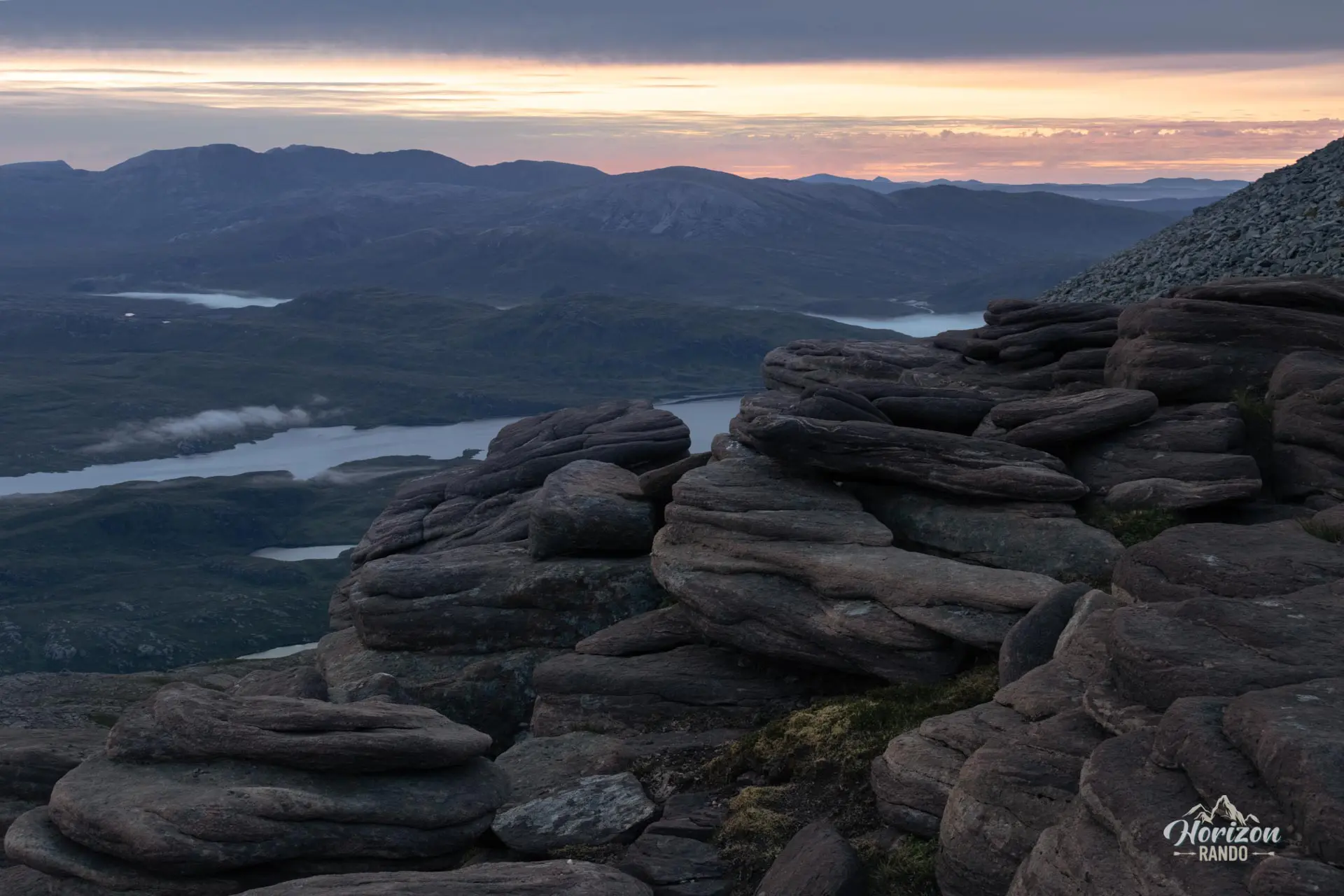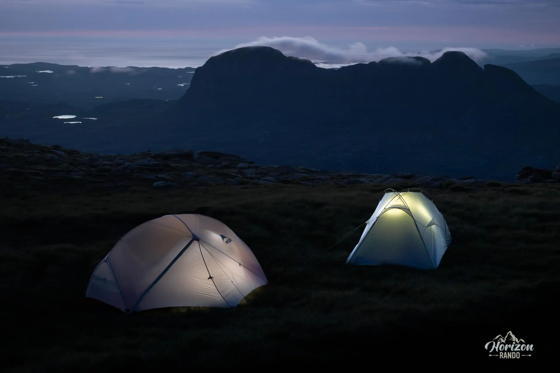 Bivouac : Le plateau sommital de Cùl Mòr offre des emplacements exceptionnels pour passer la nuit et admirer le coucher de soleil.