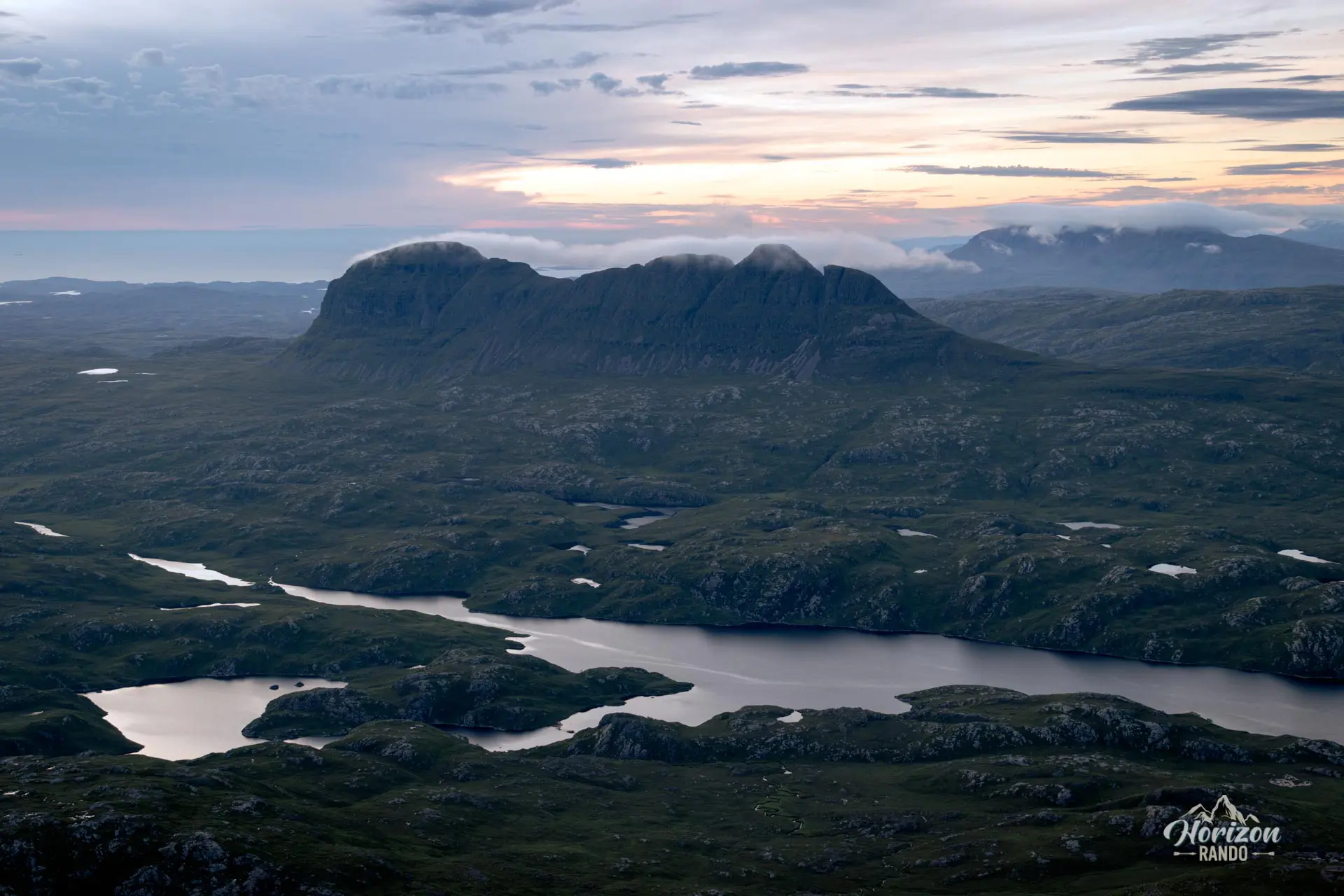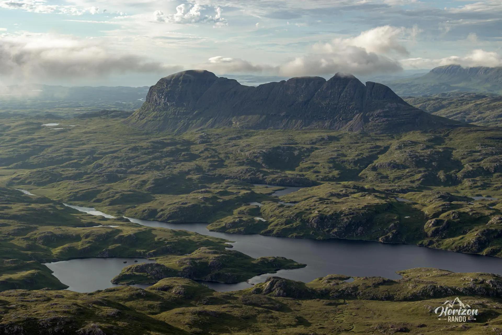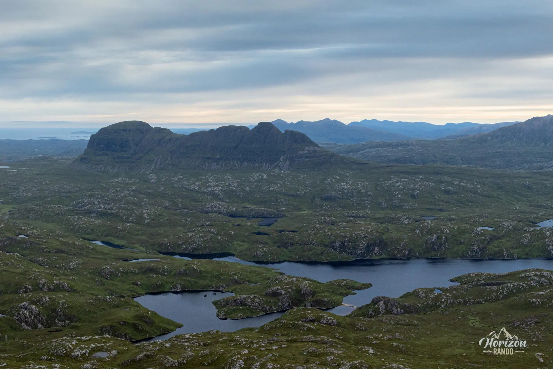 La randonnée de Cùl Mòr vous mène au sommet de l'une des montagnes emblématiques de la région d'Assynt, dans l'extrême nord-ouest de l'Écosse. Dominant à 849 mètres d'altitude un paysage parsemé de lochs et de lochans, ce double sommet offre des panoramas spectaculaires sur les pics isolés environnants tels que Suilven, Stac Pollaidh, Canisp et Cùl Beag.