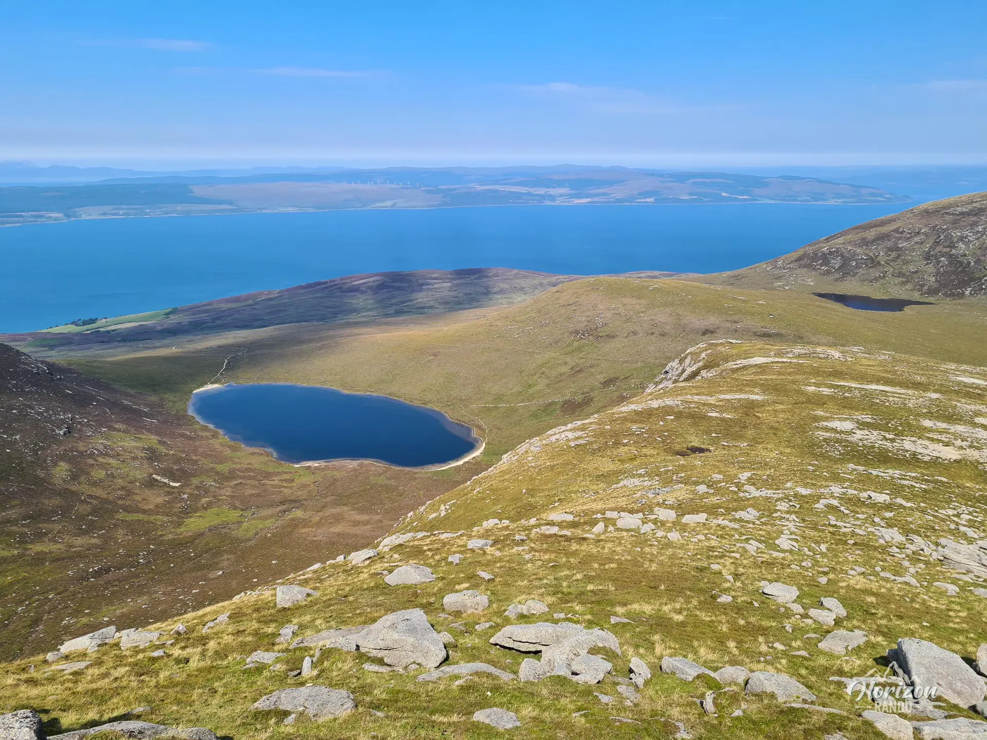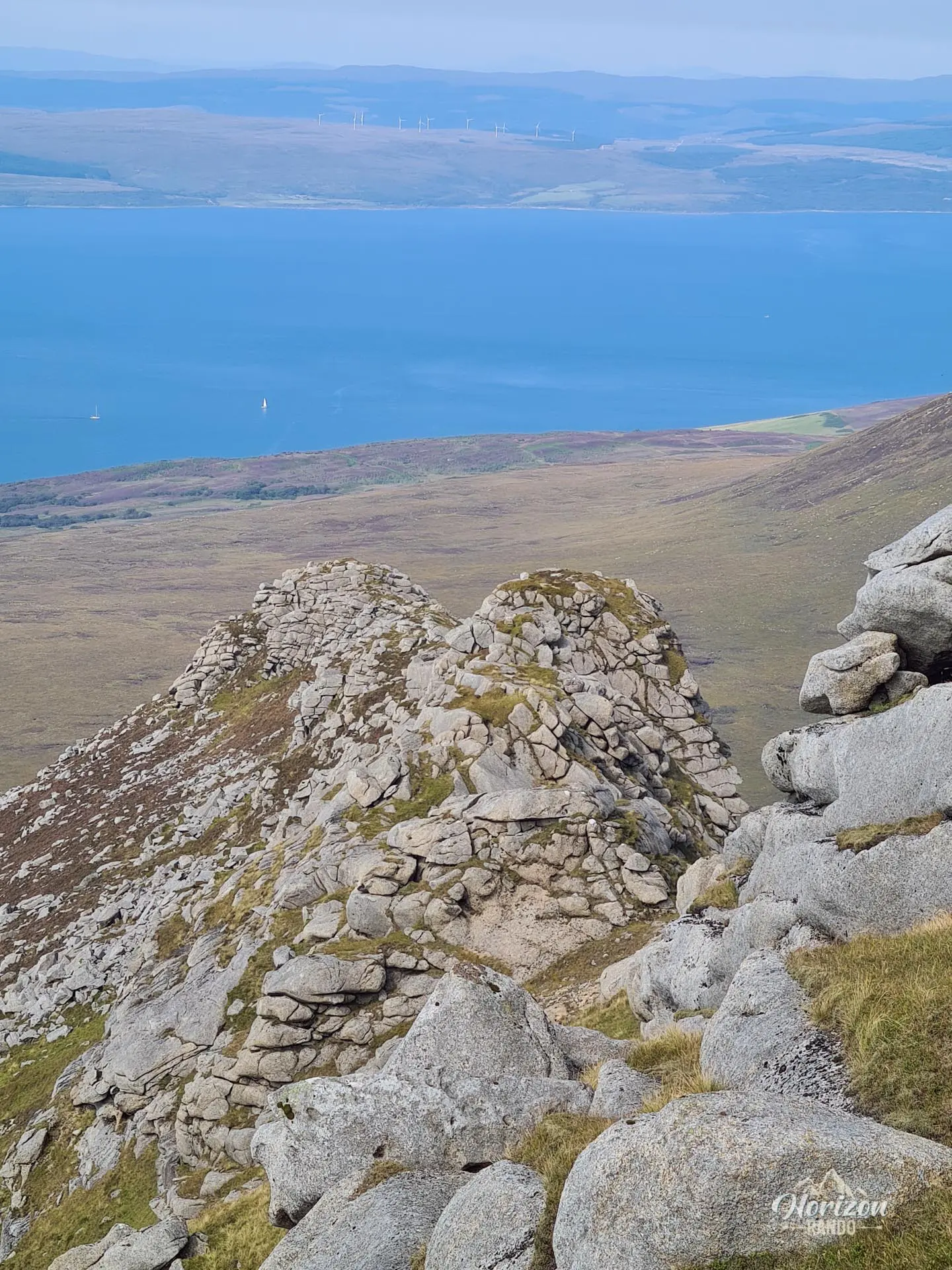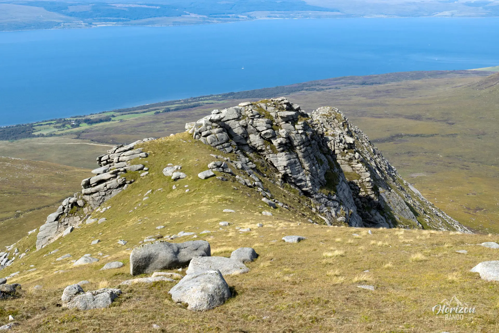 Contrairement aux montagnes escarpées de l'est de l'île qui attirent la majorité des randonneurs, ces reliefs arrondis offrent une expérience authentique, loin des sentiers battus. Les panoramas depuis le sommet récompensent largement l'effort : vers l'ouest, la vue plonge sur le détroit de Kilbrannan et la péninsule du Kintyre ; tandis qu'à l'est se dévoile le spectacle majestueux de la chaîne principale d'Arran.