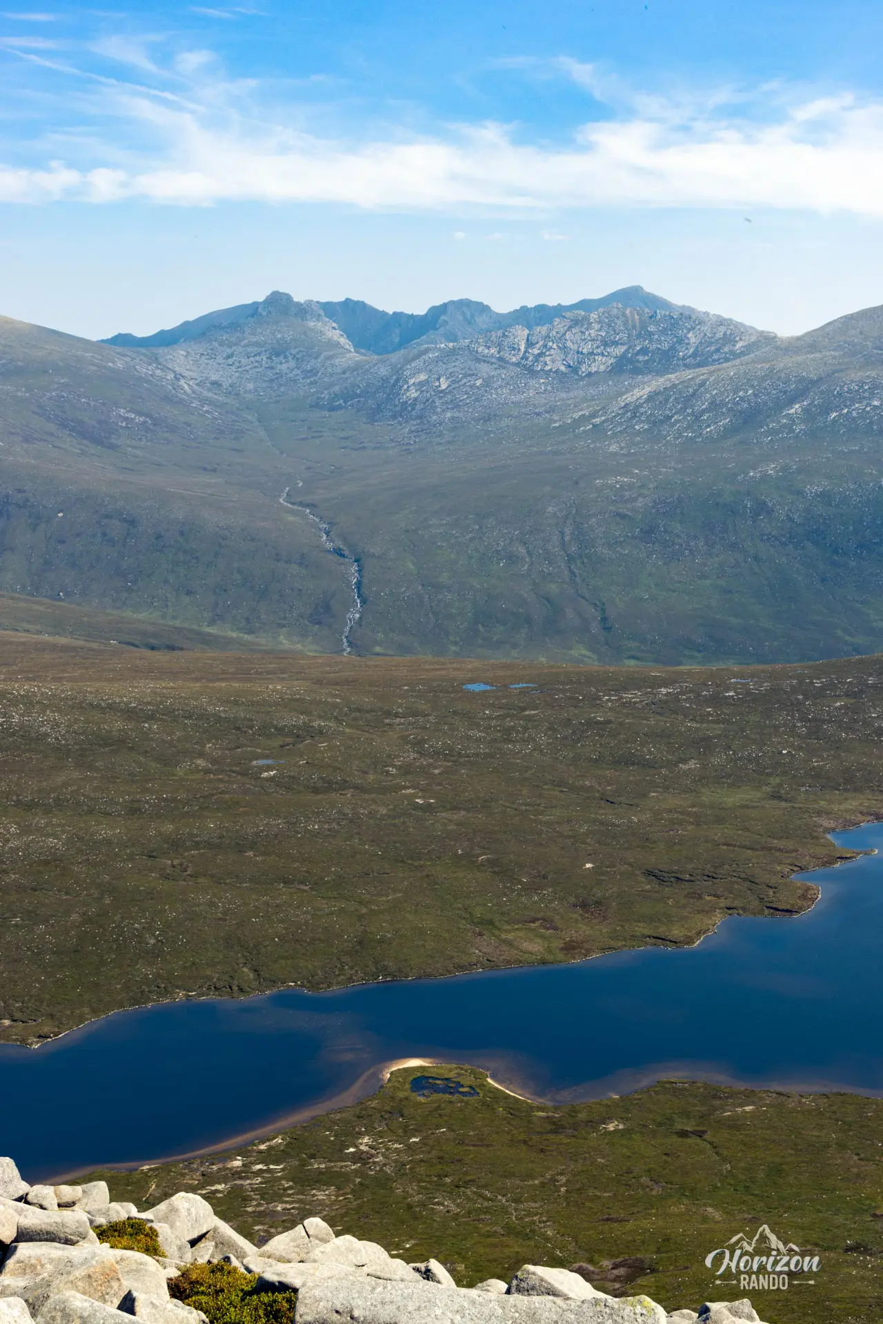 Le parcours se poursuit par une traversée de crête sans difficulté jusqu'au sommet voisin de Beinn Bhreac, avant de redescendre vers le lac de Coire Fhionn. Le retour final s'effectue sur une petite route, sur environ 2 kilomètres.