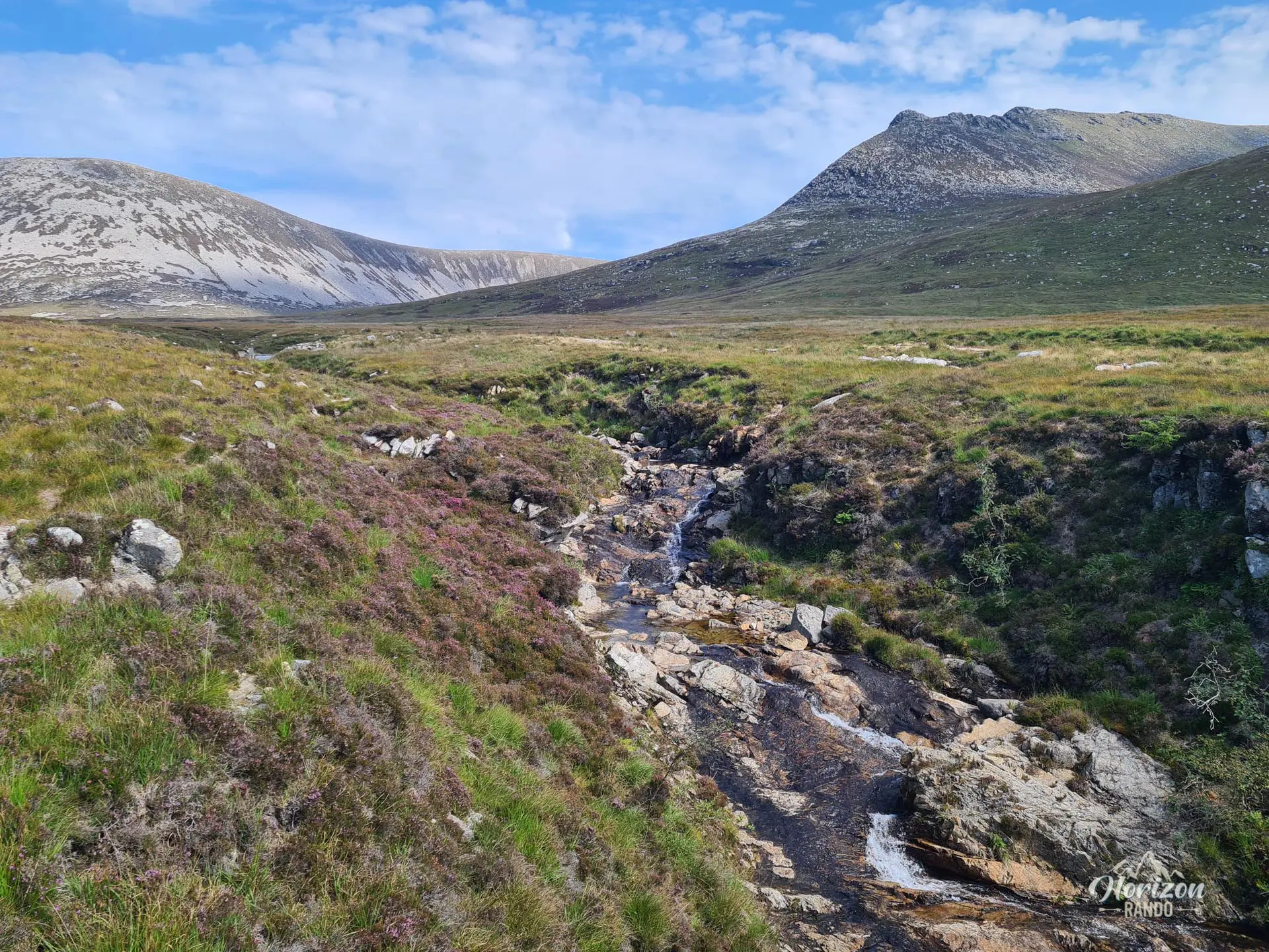 Après avoir longé le ruisseau Allt Gobhlach jusqu'à la cascade, vous atteindrez un plateau légèrement marécageux. La montée finale vers le sommet de Mullach Buidhe s'effectue sur une pente de plus en plus raide, devenant rocheuse dans le haut de l'arête. Deux options s'offrent alors à vous : suivre la crête directement jusqu'au sommet — ce qui nécessitera quelques pas d'escalade facile — ou emprunter un chemin de contournement sur le flanc ouest de la montagne pour éviter la dernière barre rocheuse (le tracé gps prend cette seconde option).