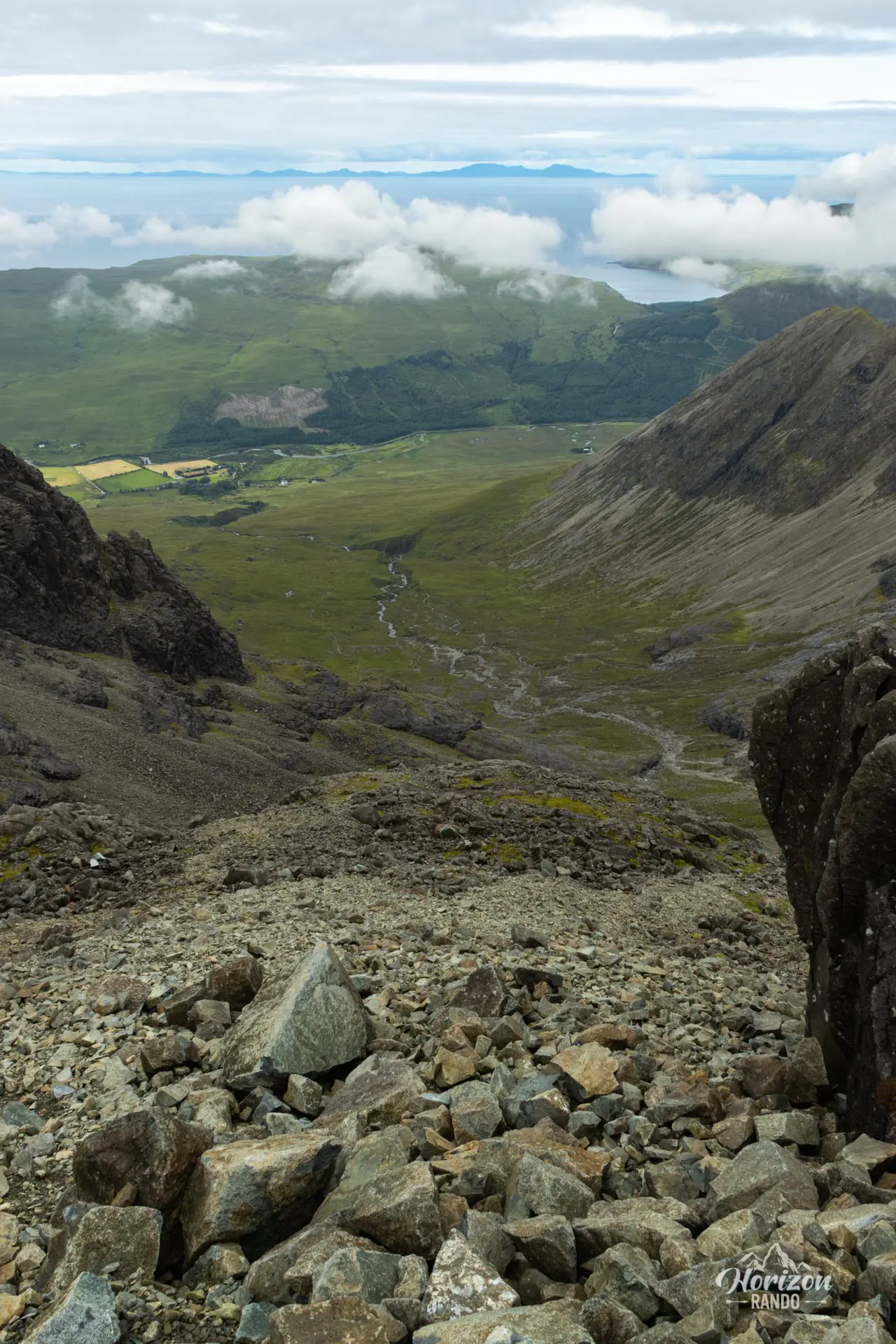 Le terrain est essentiellement rocailleux, avec de nombreux passages nécessitant l'usage des mains. La montée finale vers la crête traverse un long pierrier très pentu et glissant. Sur la crête des Cuillins, plusieurs sections exposées peuvent impressionner les randonneurs sensibles au vertige. Bien que le gabbro des Cuillins offre une excellente adhérence, restez vigilant face aux pierres instables et aux chutes de pierres pouvant être déclenchées par d'autres randonneurs.
