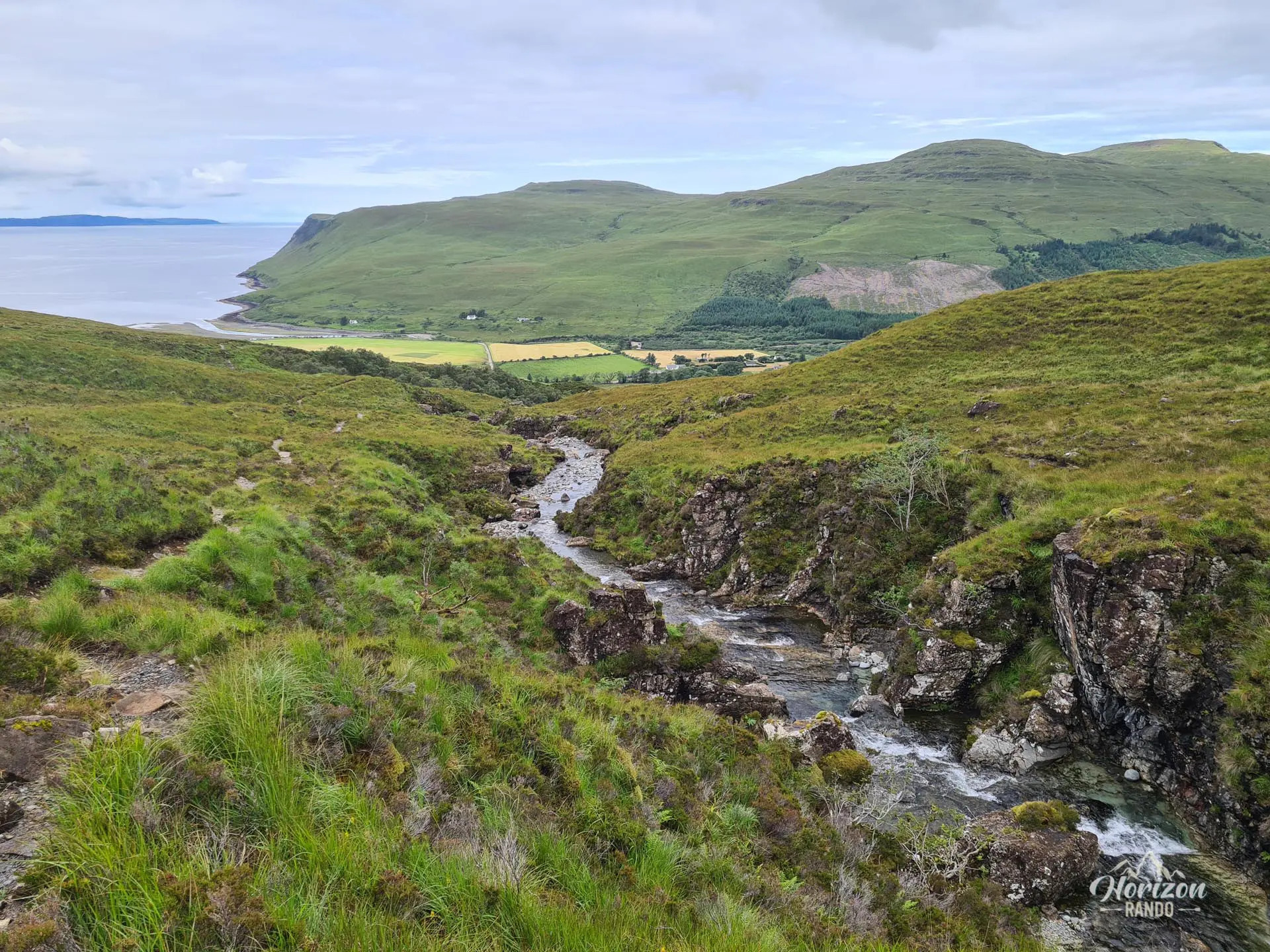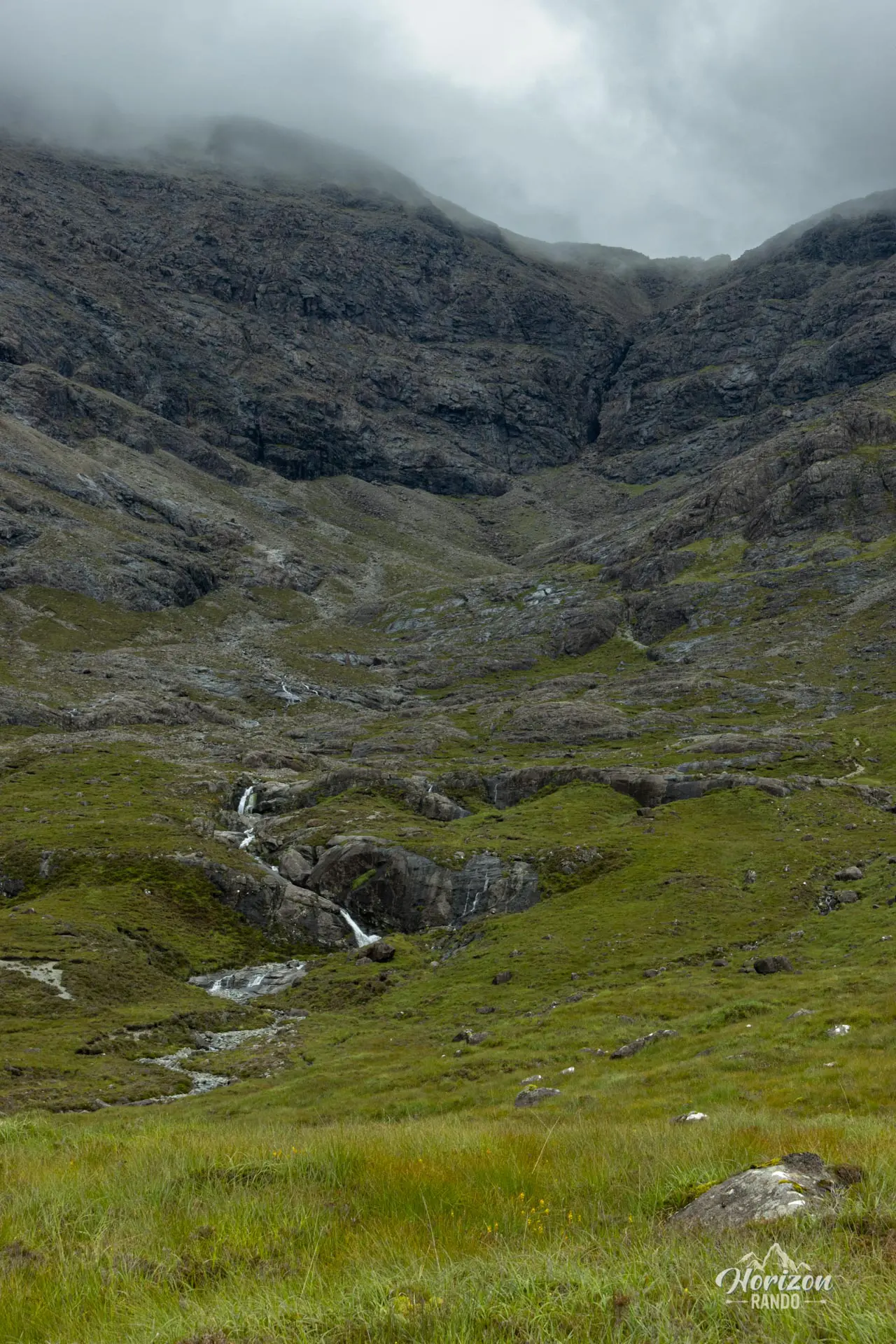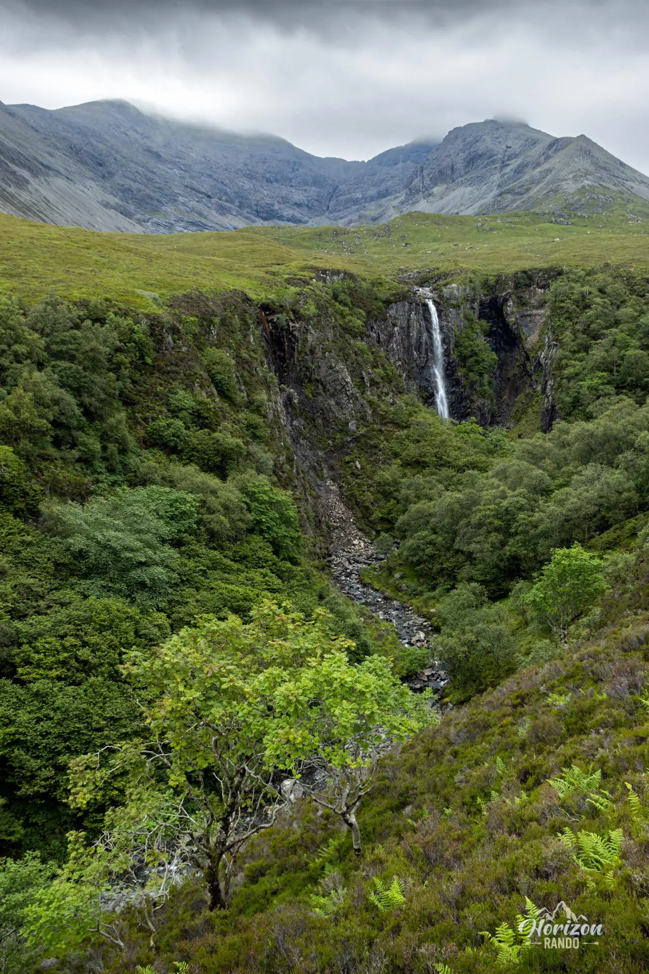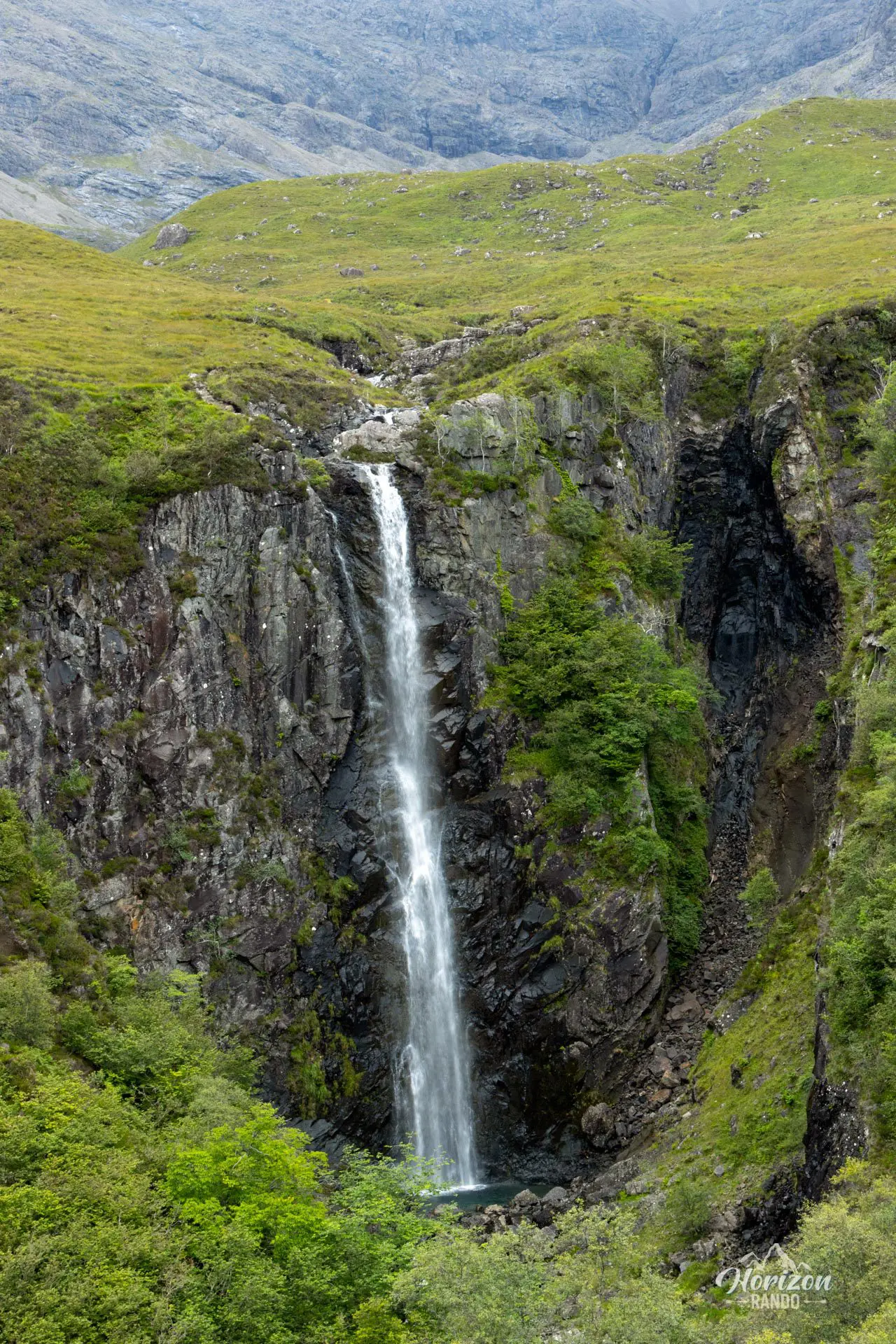 - Les chutes d'eau d'Eas Mòr : lors de l'ascension, vous découvrirez cette cascade impressionnante qui dévale 40 mètres dans une gorge étroite, avec les Black Cuillins en toile de fond.