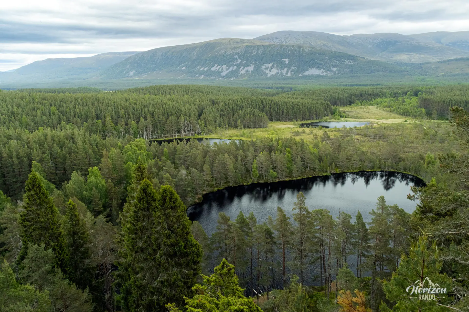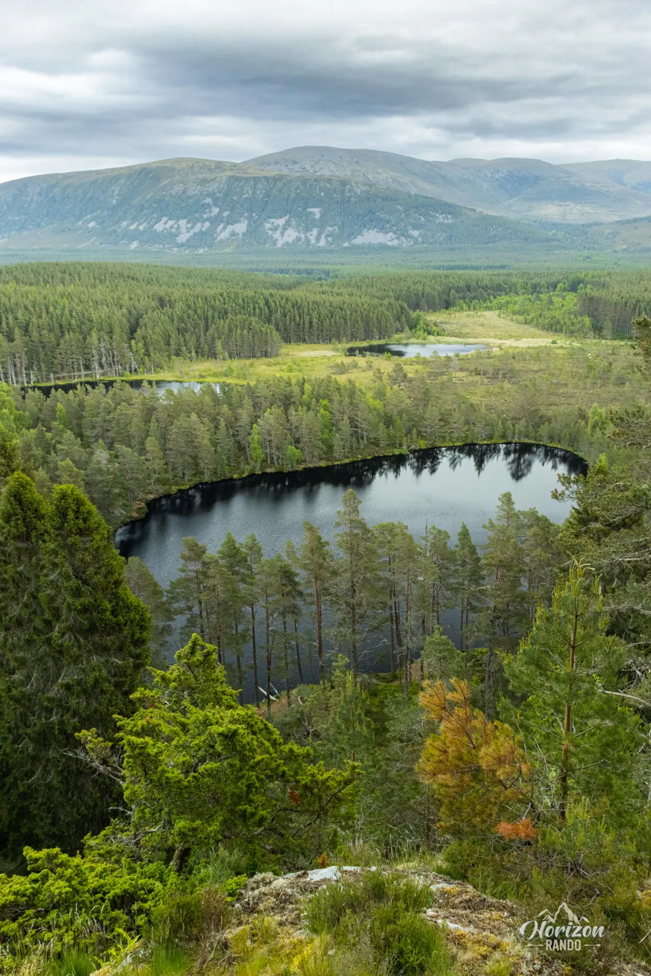 - Les panoramas exceptionnels depuis le Farleitter Crag : une vue plongeante à couper le souffle sur les lochans (petits lochs en gaélique) en contrebas, la forêt de pins à perte de vue et les sommets arrondis de Glen Feshie.