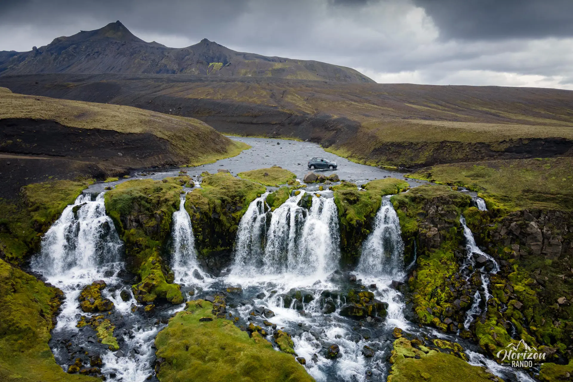 Découvrez Bláfjallafoss, de modestes chutes d'eau d'environ 5 mètres de hauteur, et pourtant parmi les plus emblématiques d'Islande. Située le long de la route F232, cette cascade offre une expérience unique alors que vous passez littéralement à quelques mètres seulement de son bord. Si vous avez déjà vu une photo d'une voiture bravant une rivière islandaise au-dessus d'une chute d'eau, il y a de fortes chances que cela se soit déroulé ici-même. Cependant, il est important de noter que cette vue ne peut être capturée qu'avec un drone, car il n'y a pas de relief en face de la cascade.