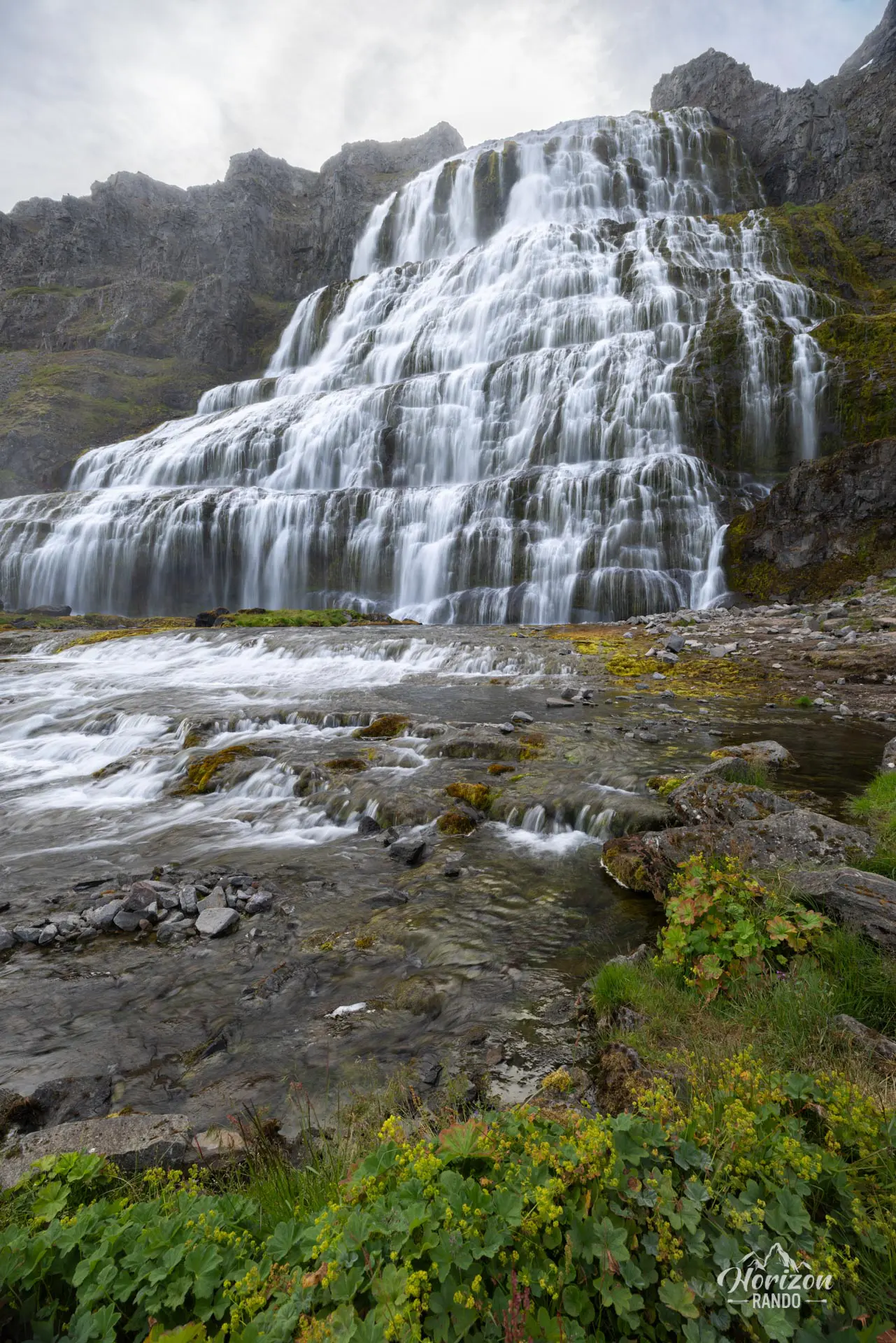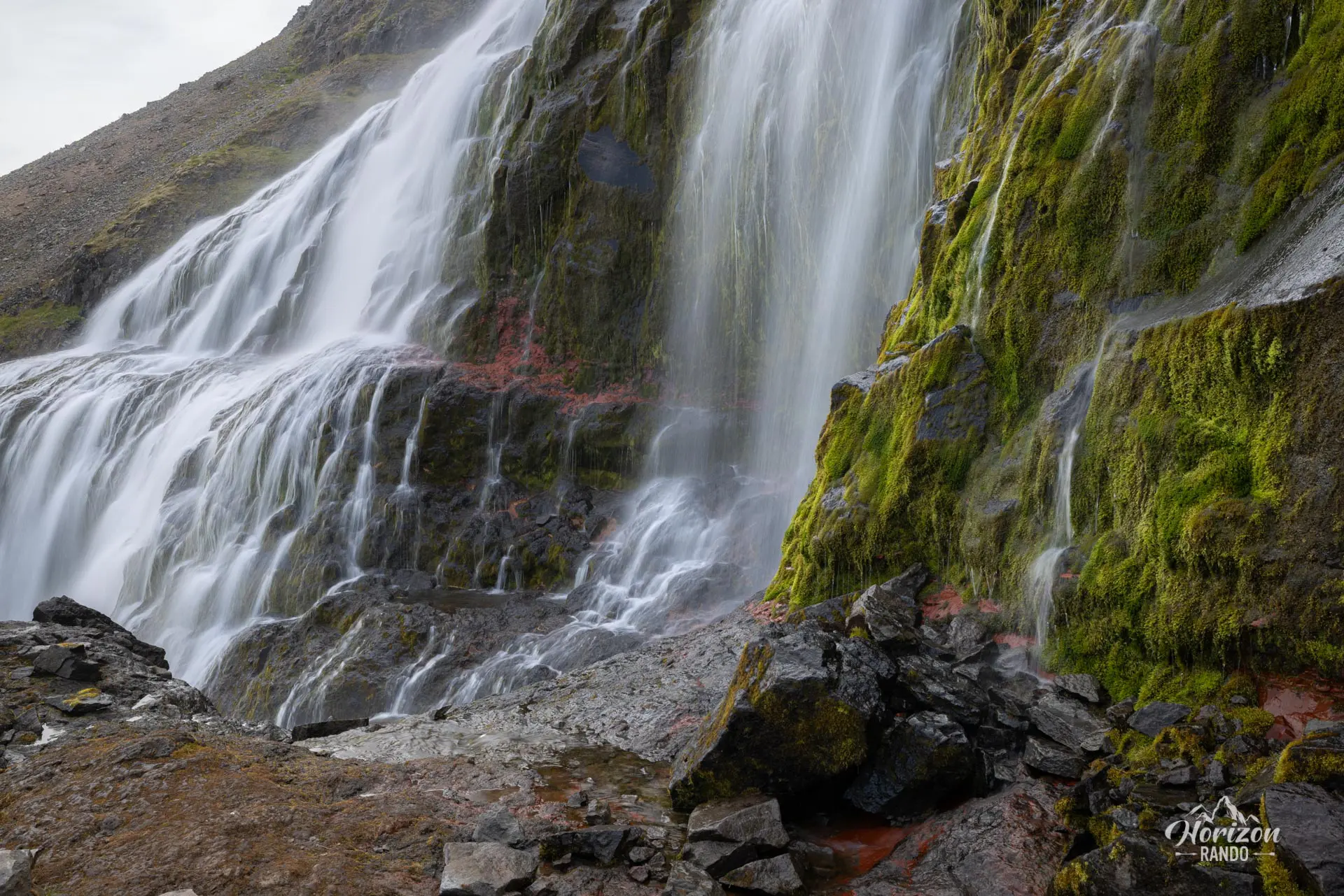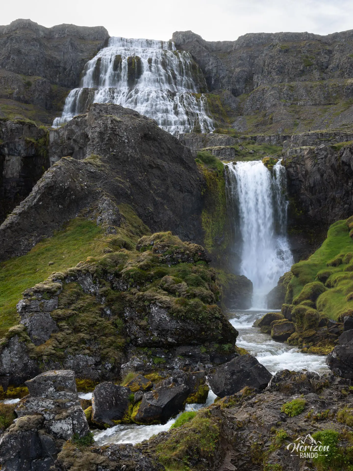 En aval, six autres chutes se déversent en cascade jusqu'à la mer. Le parking est situé tout en bas, et une courte randonnée d'un quart d'heure avec 100 mètres de dénivelé mène à la base de Dynjandi, la principale cascade.