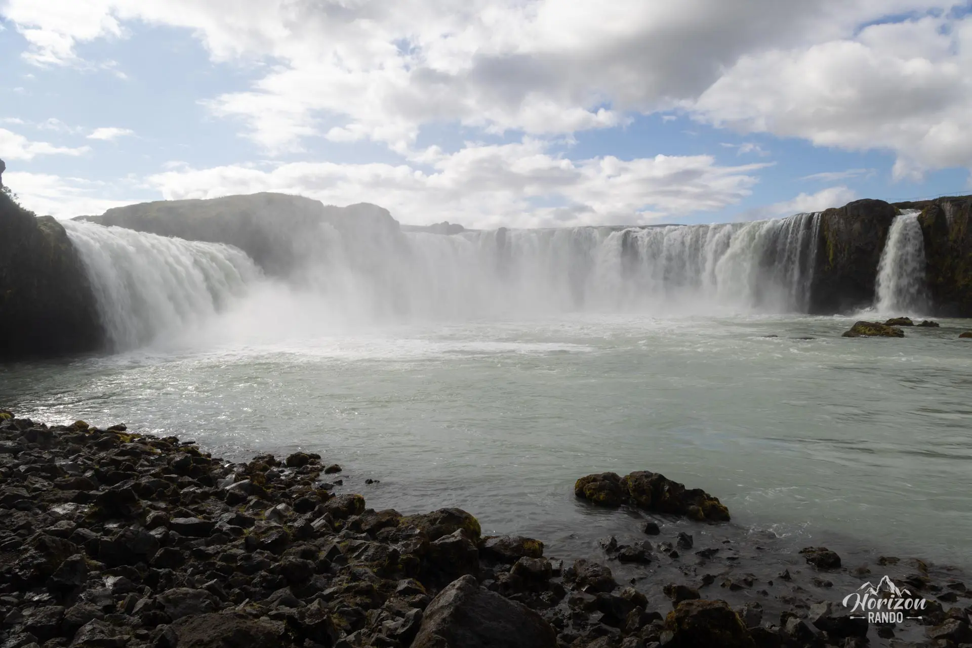 Goðafoss, une majestueuse chute d'eau au débit impressionnant, se situe dans le nord de l'Islande, le long de la route 1, le fameux Cercle d'Or. Les eaux de la rivière Skjálfandafljót chutent d'une hauteur de 12 mètres sur une largeur de 30 mètres, en formant un majestueux arc de cercle.