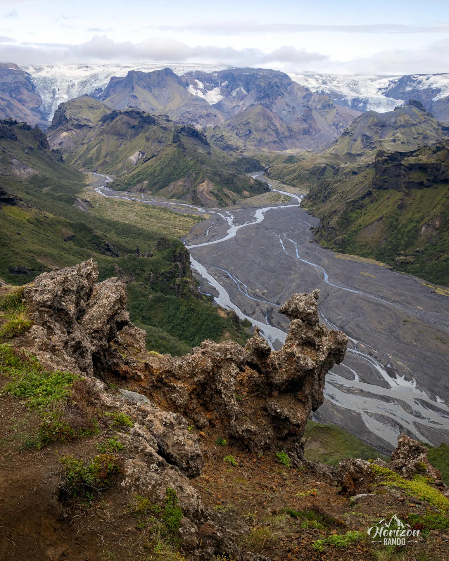 Le circuit de Tindfjöll débute à Thórsmörk, la vallée de Thor en français, en référence au dieu nordique. Enclavée entre les calottes glaciaires de Myrdalsjökull et d'Eyjafallajökull dans les Highlands, cette région sauvage est l'un des endroits préférés des Islandais et un véritable paradis pour les randonneurs. Abritée des vents atlantiques, la vallée bénéficie d'un microclimat étonnamment doux en été qui favorise une végétation luxuriante, notamment de nombreuses forêts de bouleaux. Entourée de montagnes abruptes coiffées de calottes glaciaires, elle offre un contraste saisissant entre les flancs montagneux couverts de mousses et les plaines noires sculptées par les rivières glaciaires.