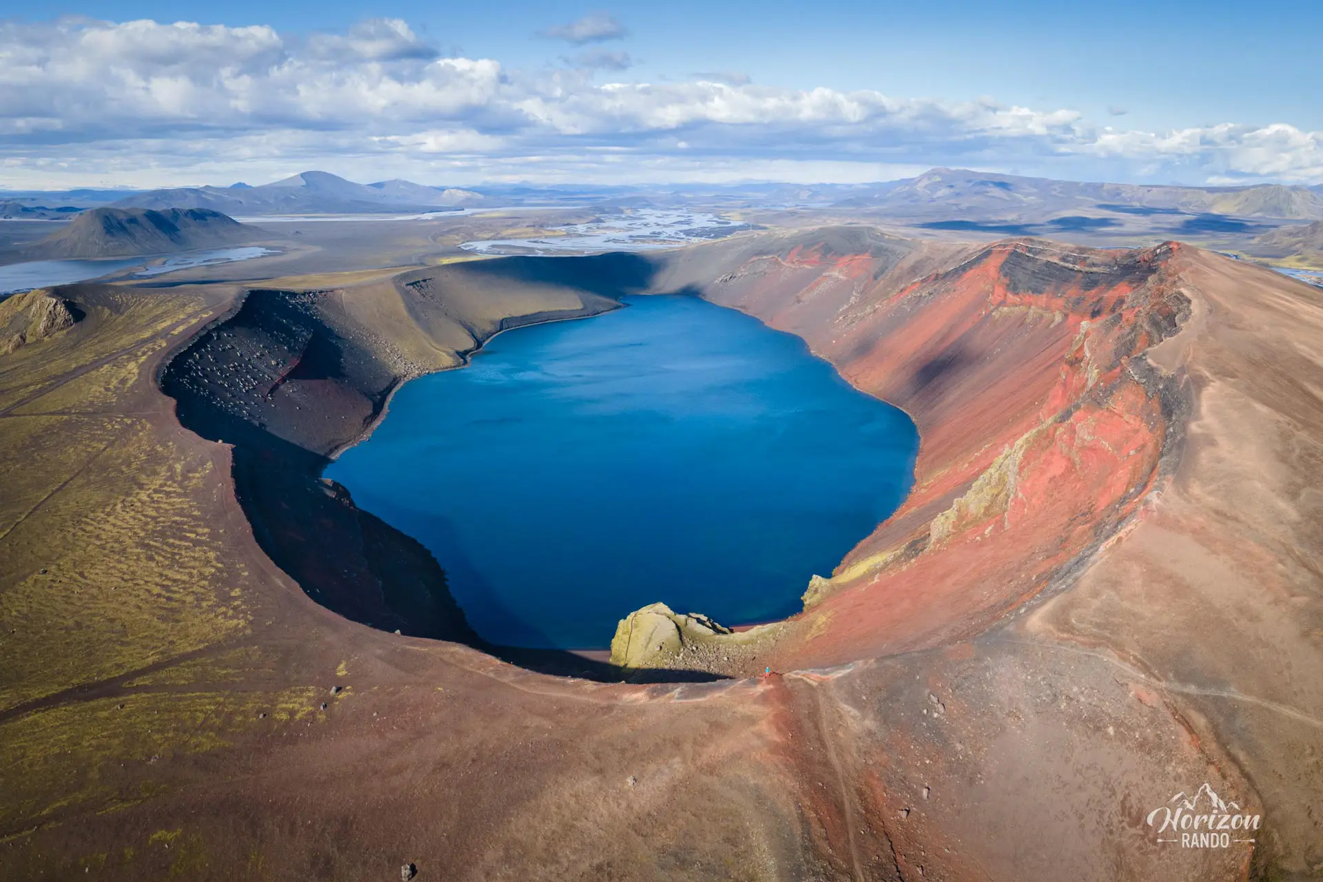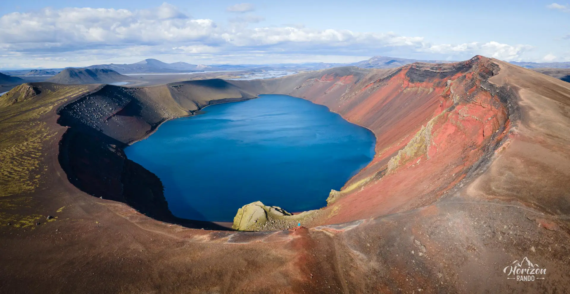Découvrez le cratère et le lac de Ljótipollur, véritables joyaux cachés de la région de Landmannalaugar, en Islande. Souvent ignoré des touristes, son nom qui signifie vilaine mare de boue n'est absolument pas mérité ! Le lac d'un bleu profond offre un contraste saisissant avec les flancs rouge vif du cratère.