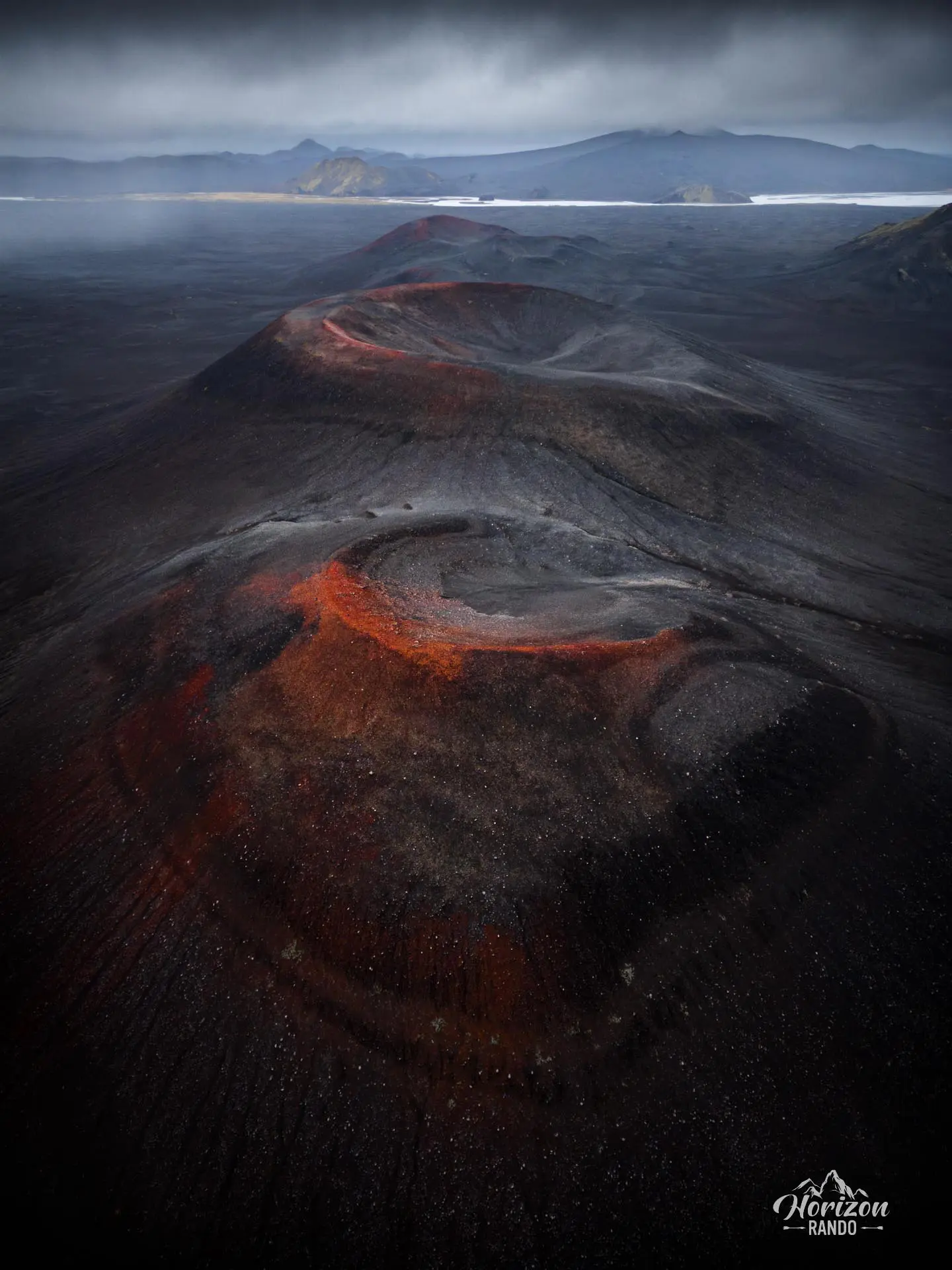 Découvrez depuis les airs une série de cratères aux teintes rouges qui contrastent magnifiquement avec les nuances sombres de la lave. L'ambiance sera encore plus captivante lors d'une journée où le ciel est menaçant.