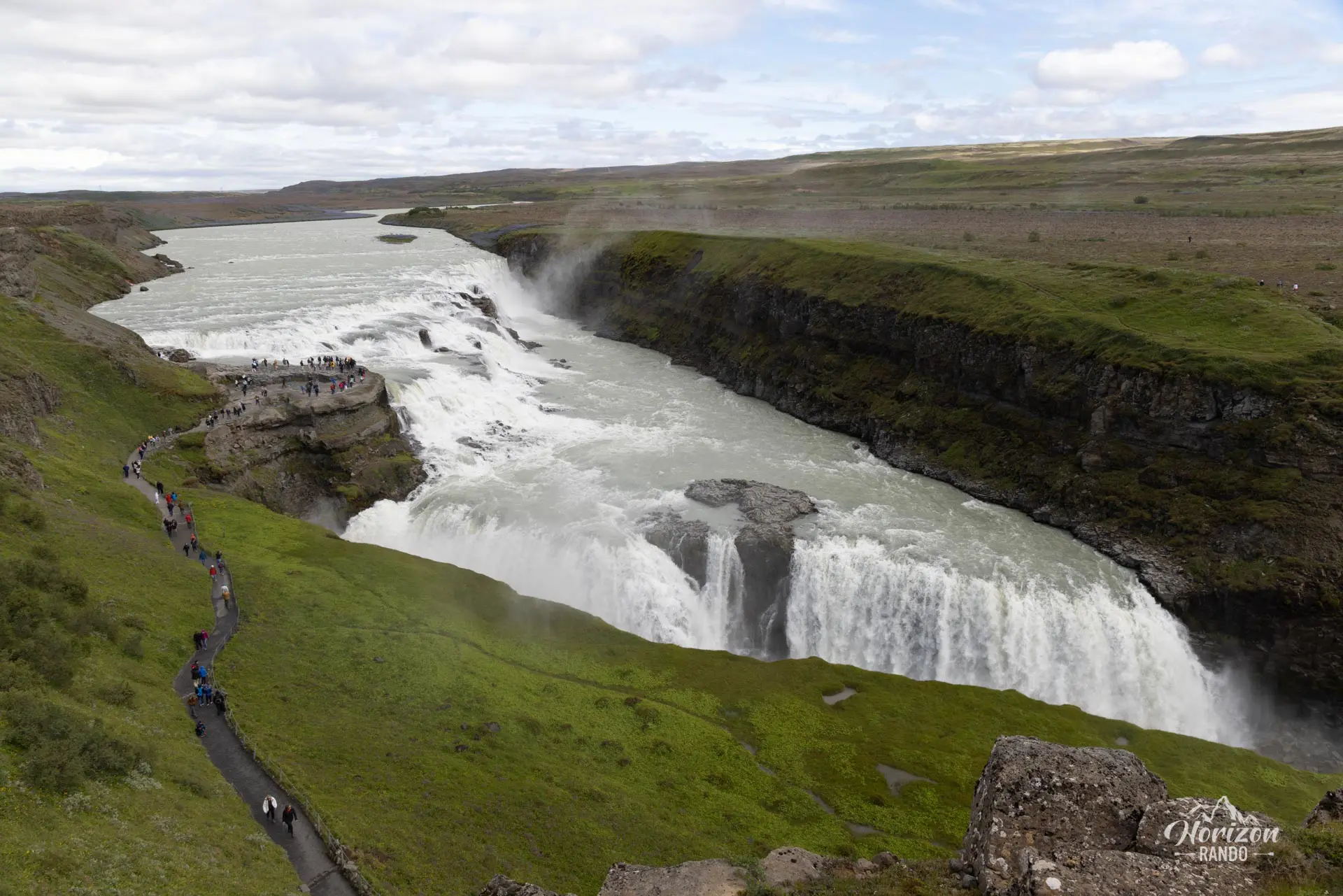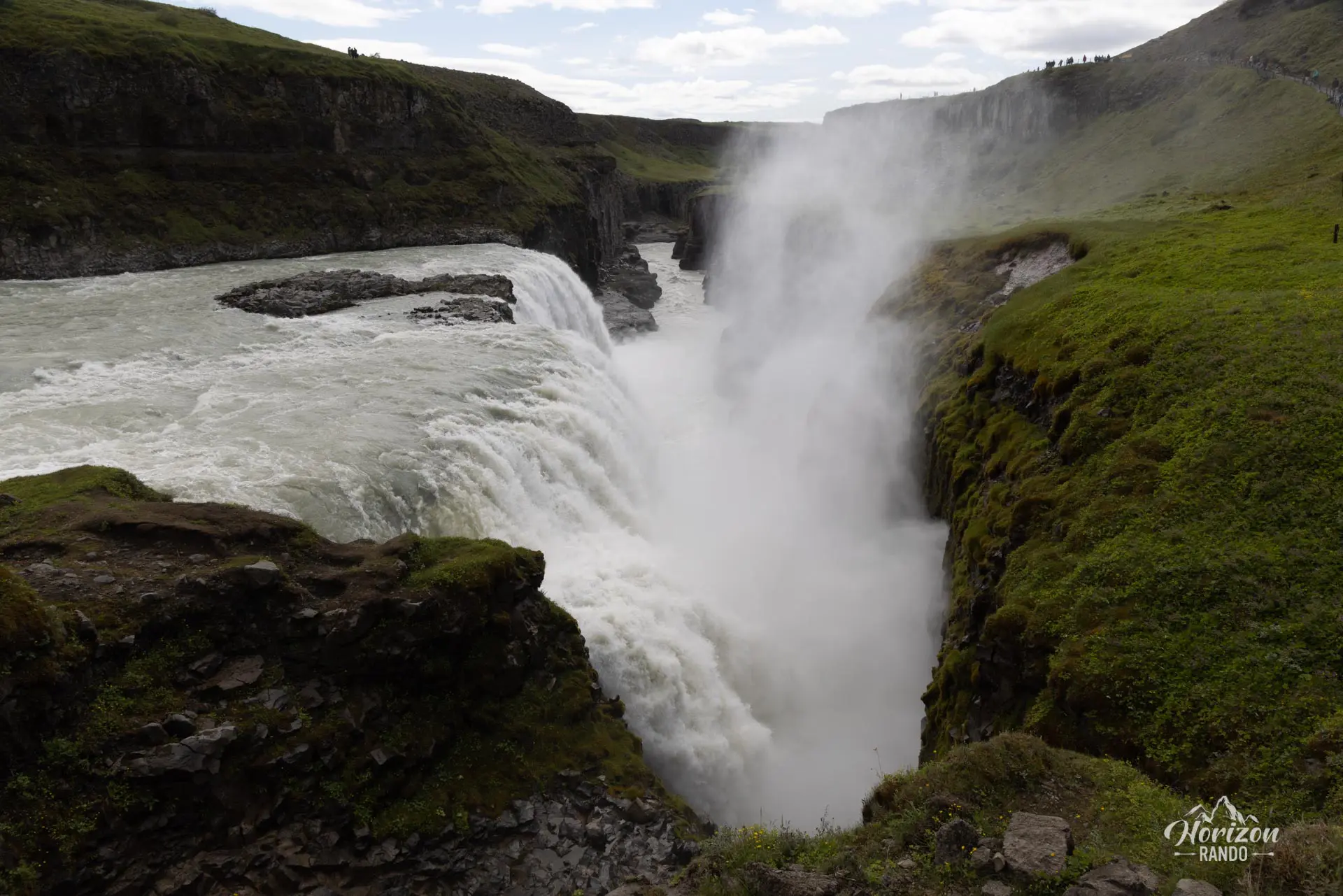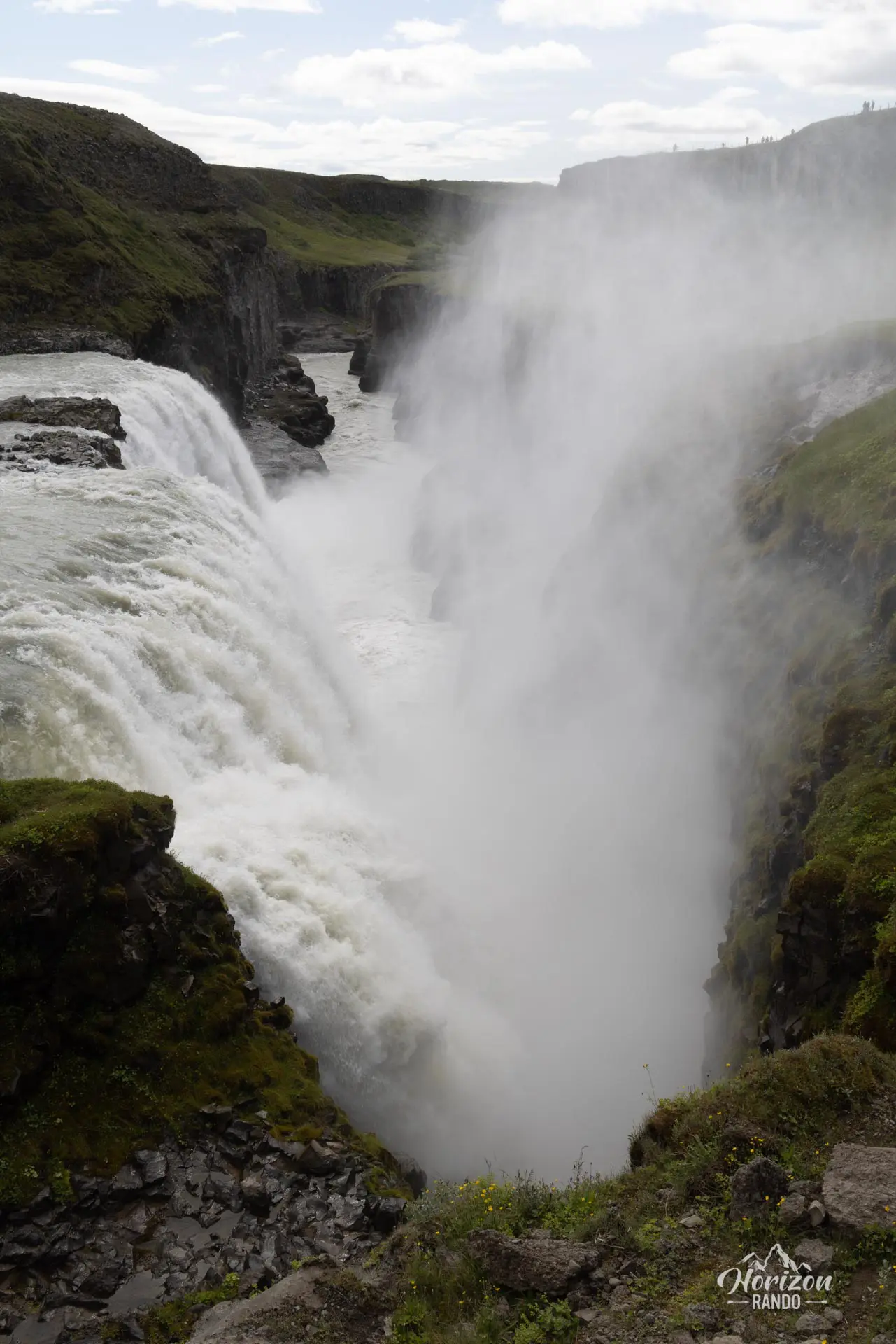 Gullfoss se compose de deux cascades successives en palier : la première chute mesure 11 mètres de haut, tandis que la seconde atteint 21 mètres, avant de plonger dans une gorge étroite. Avec un débit impressionnant d'environ 140 m³/s en été, le fracas assourdissant de l'eau se répercute dans tout le canyon, créant une ambiance à couper le souffle.