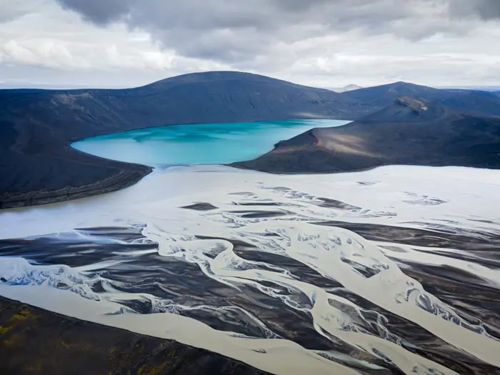 Le lac Skyggnisvatn est le plus à l'ouest de tous les lacs de la région appelée Veiðivötn. La rivière Tungnaá se jette librement dans le lac, offrant un contraste de couleur surprenant.