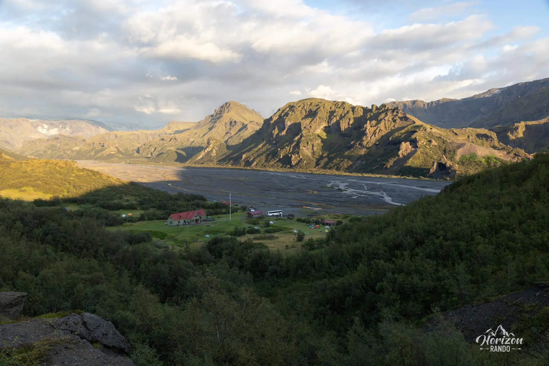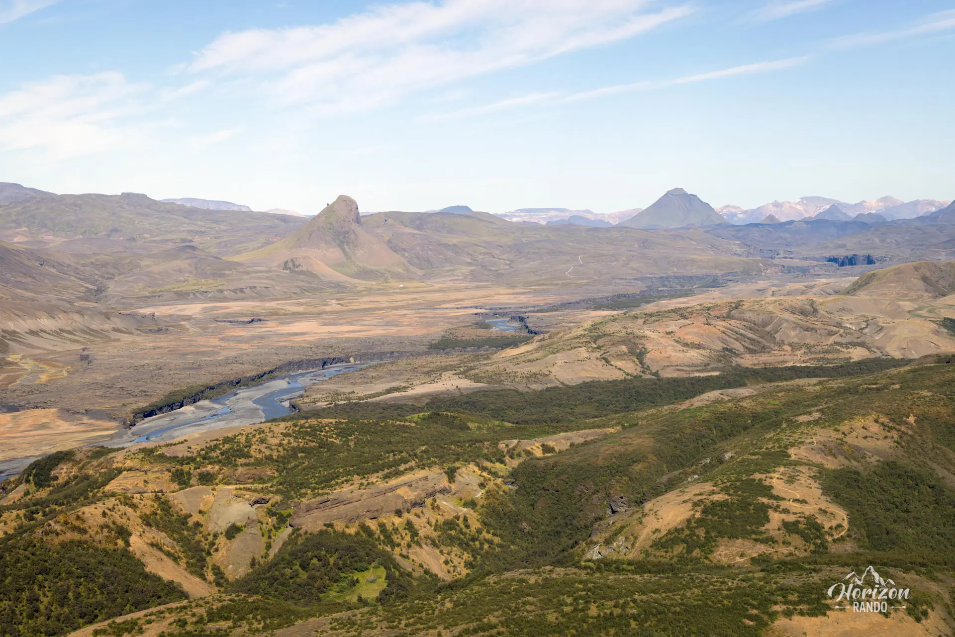 La randonnée vers le sommet de Valahnúkur débute à Thórsmörk, la vallée de Thor en français, en référence au dieu nordique. Enclavée entre les calottes glaciaires de Myrdalsjökull et d'Eyjafallajökull dans les highlands, cette région sauvage est l'un des endroits préférés des Islandais et un véritable paradis pour les randonneurs. Abritée des vents atlantiques, la vallée bénéficie d'un microclimat étonnamment doux en été qui favorise une végétation luxuriante, notamment de nombreuses forêts de bouleaux.