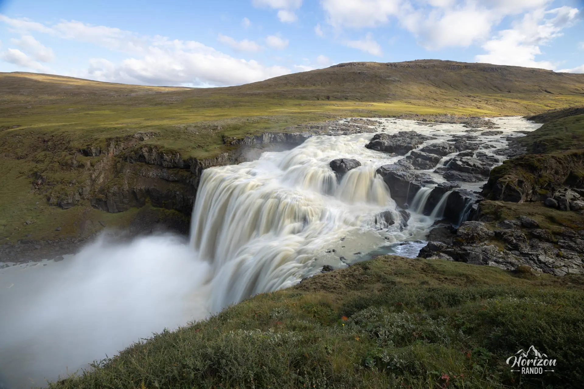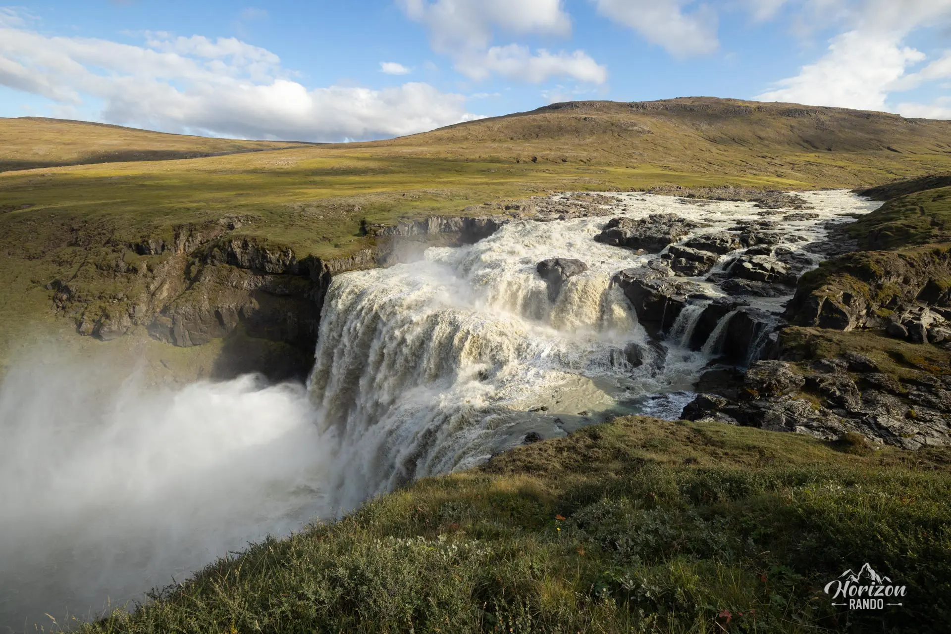 Le Waterfall Circle, ou Boucle des Cascades, vous emmène depuis Laugarfell au cœur des magnifiques Hautes Terres de l'est de l'Islande. Peu fréquentée, cette boucle vous dévoile un canyon majestueux et cinq cascades principales parmi les plus puissantes de la région. Vous y admirerez notamment Kirkjufoss, Faxi et Stuðlafoss, cette dernière étant entourée de colonnes de basalte spectaculaires.