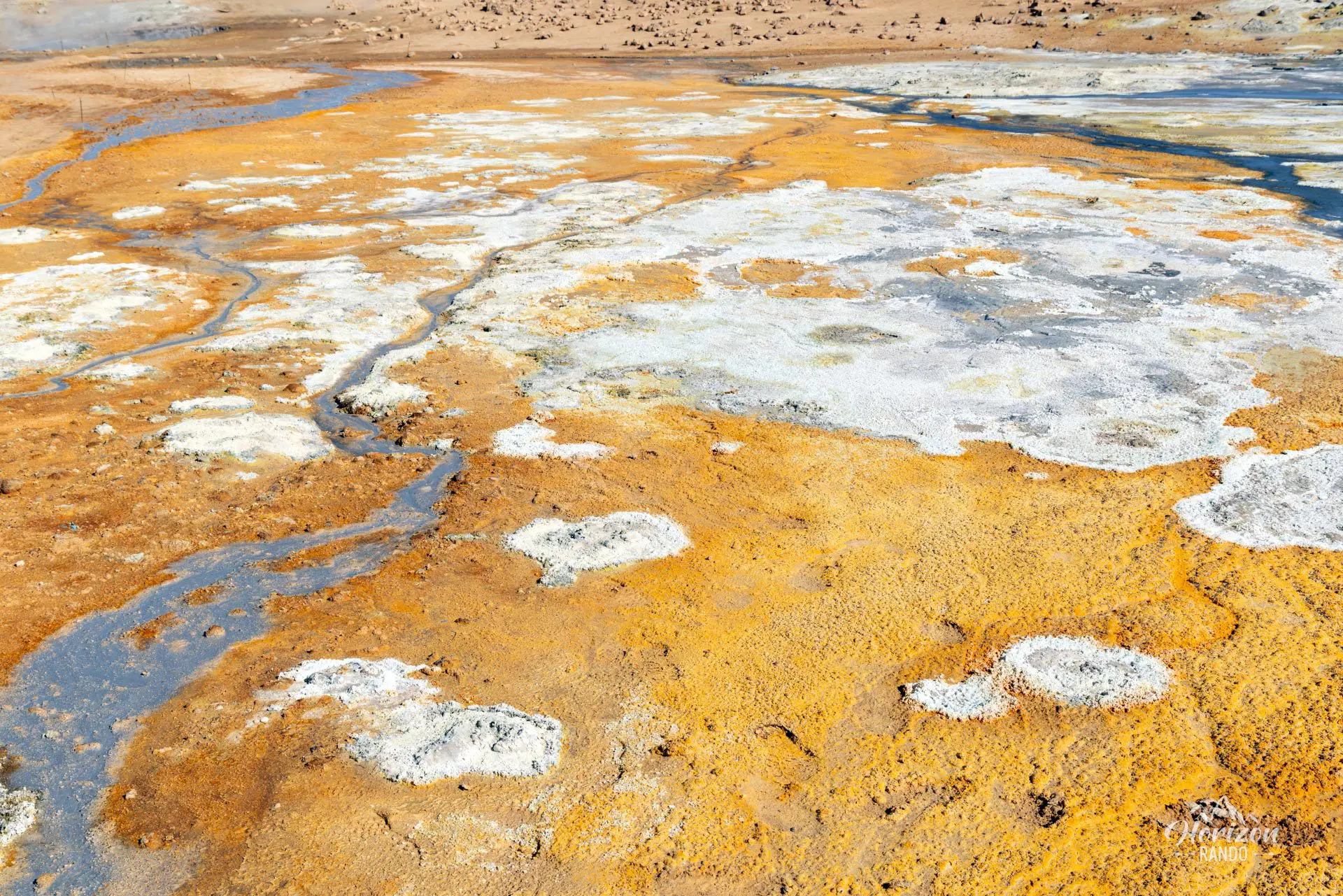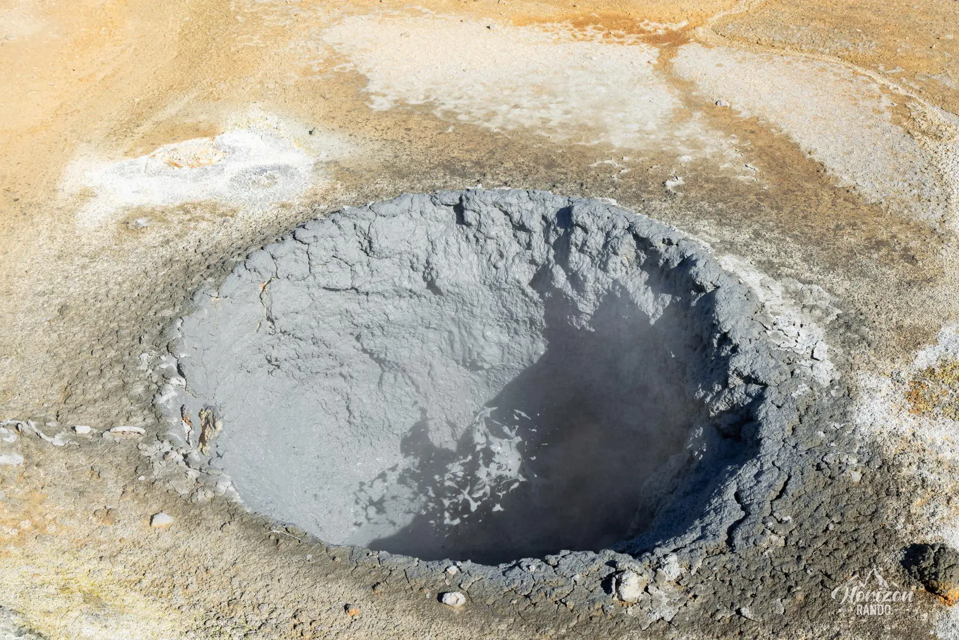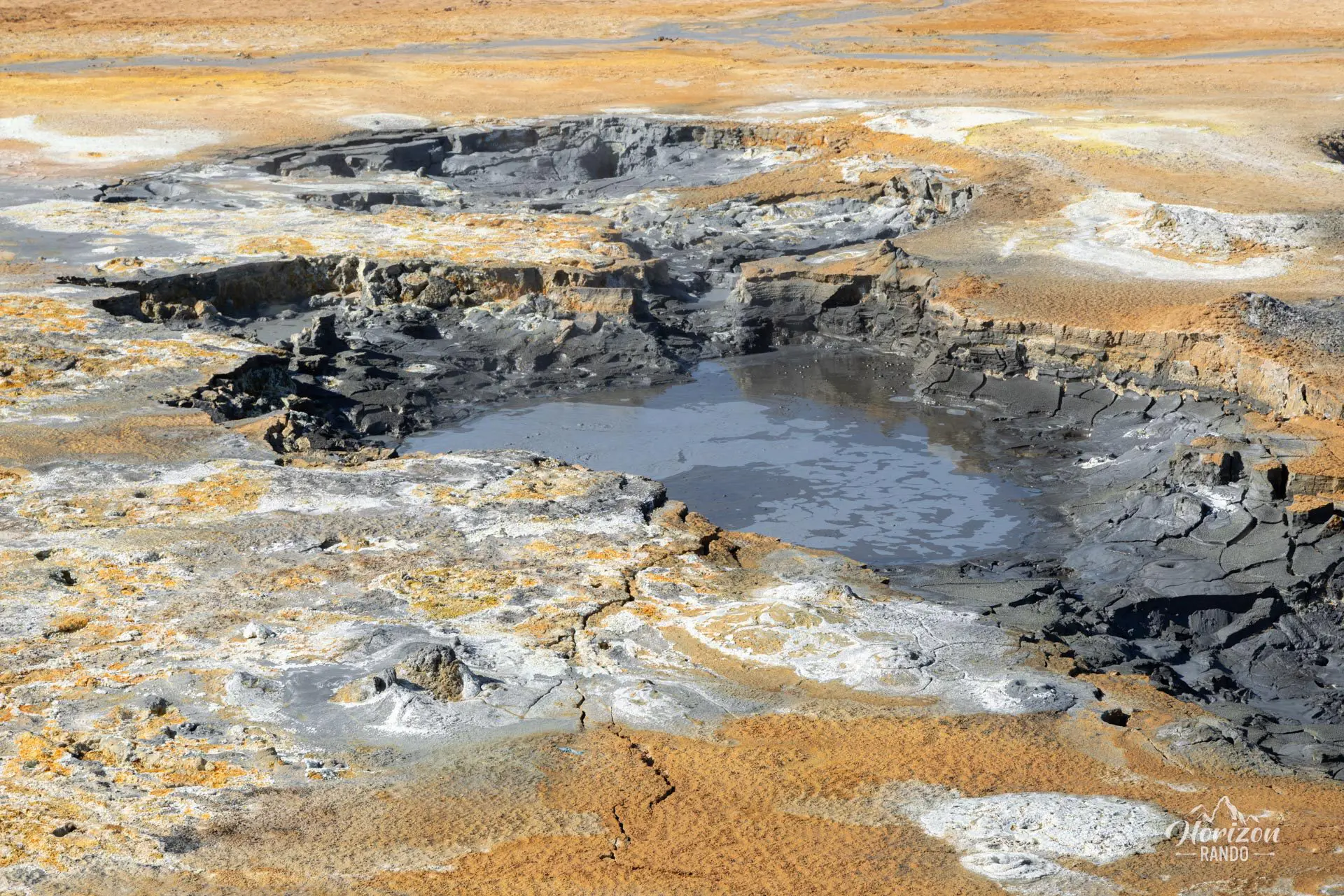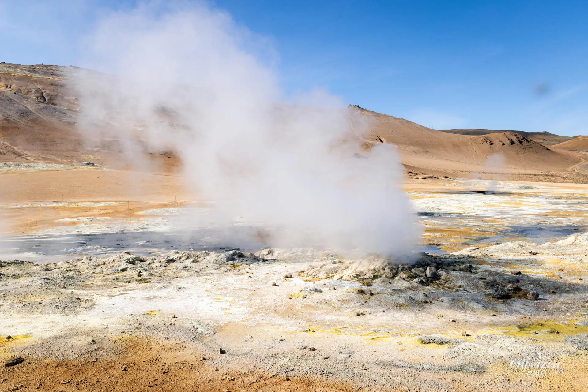 Attendez-vous à être enveloppé par une odeur de soufre particulièrement forte. Cela s'explique par le niveau élevé d'activité sous vos pieds, la chambre magmatique de ce système se trouvant à seulement quelques kilomètres en dessous du site de Hverir. Vous pourrez y observer presque tous les phénomènes typiques des paysages volcaniques : mares de boue en ébullition, des fumerolles sifflantes, des cheminées de vapeur, le tout dans un paysage lunaire aux teintes orangées.