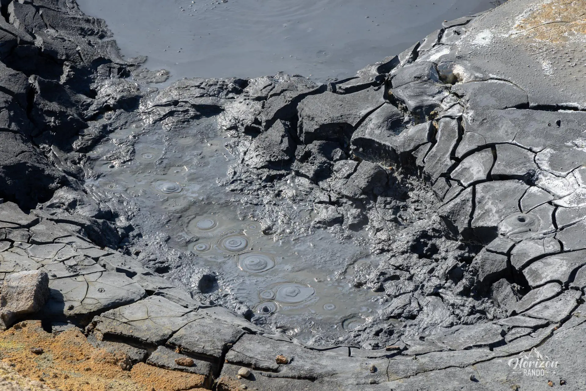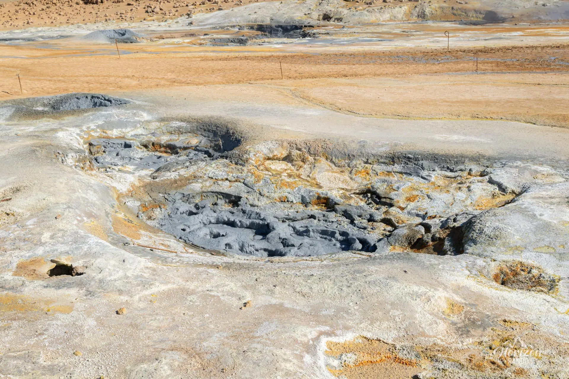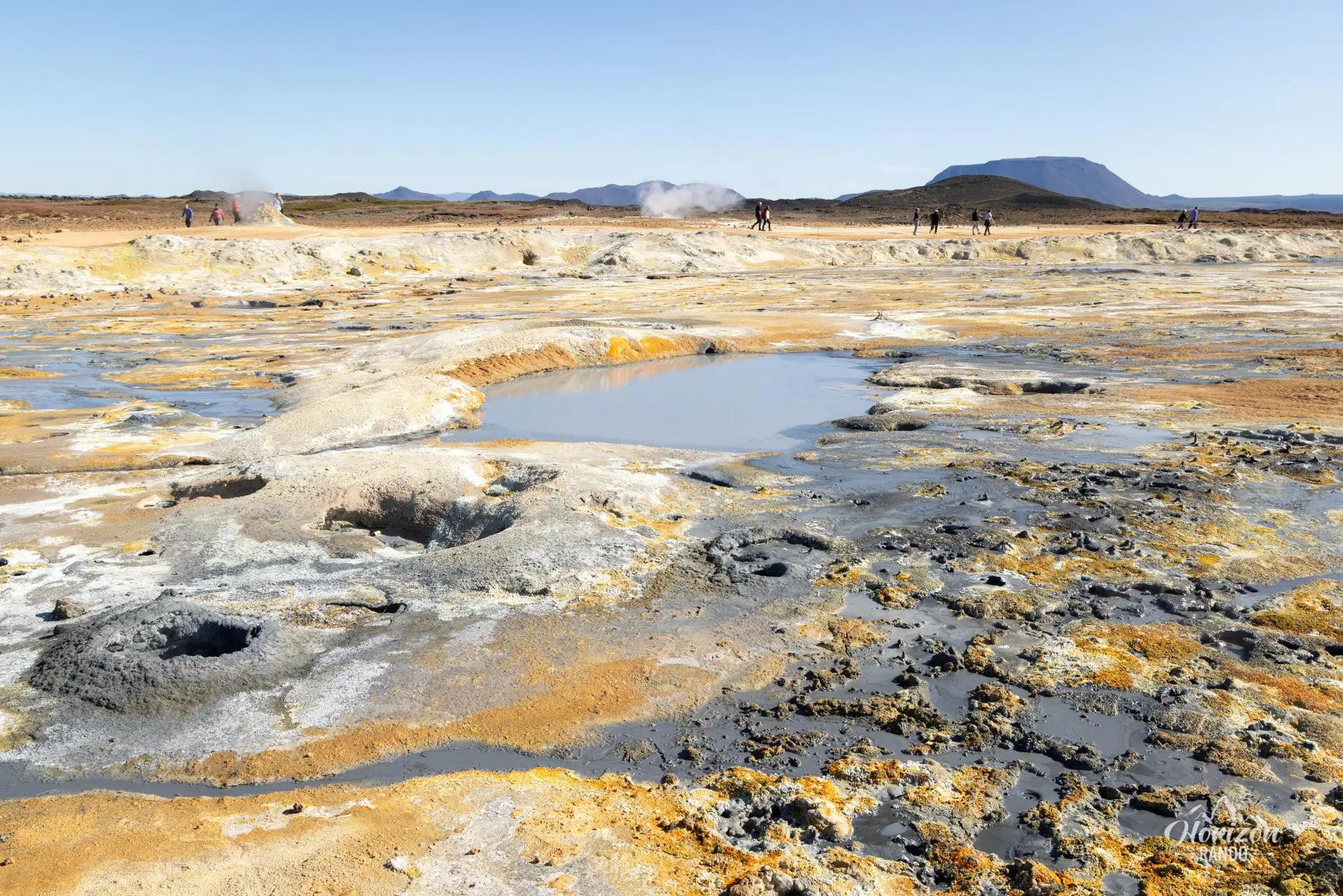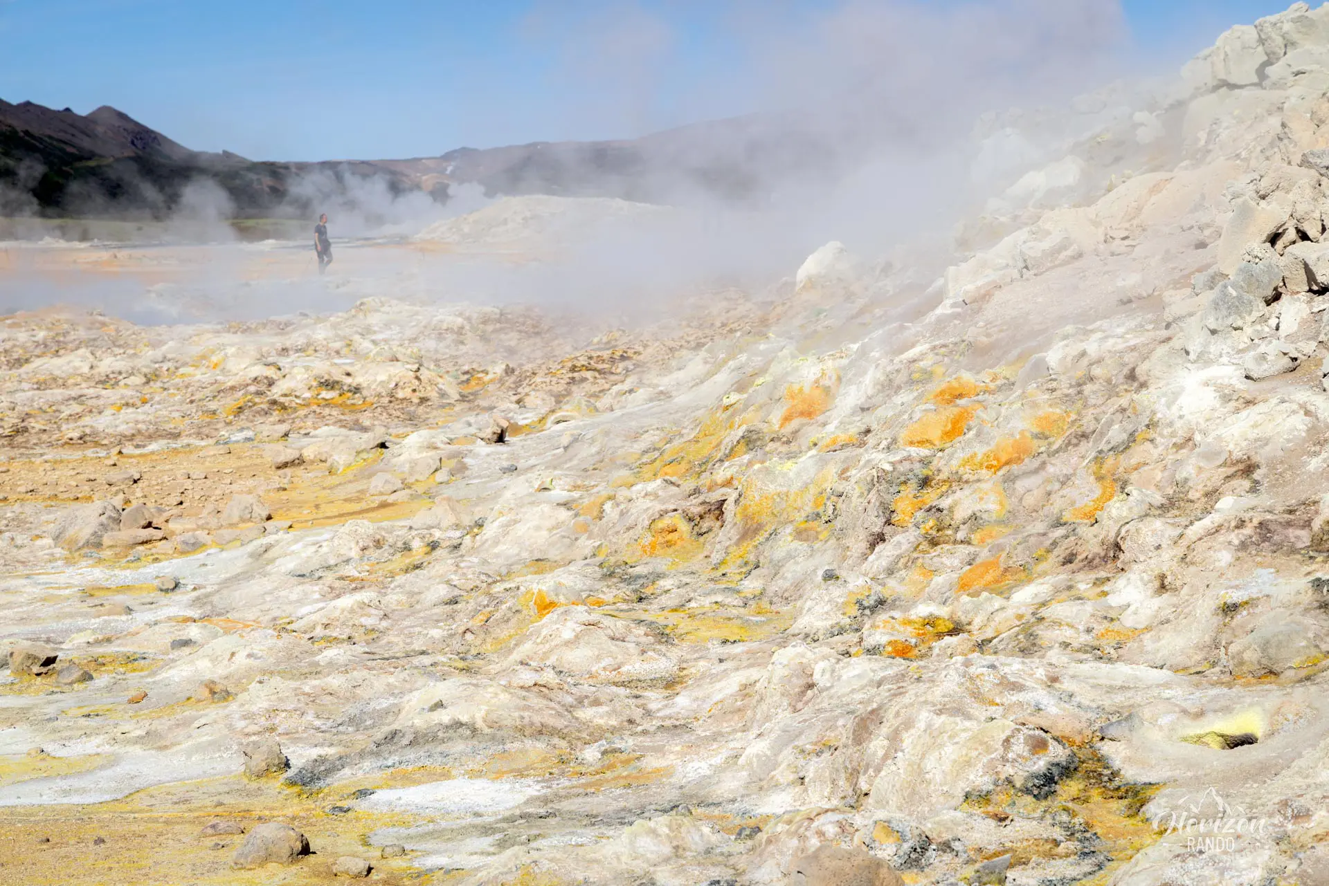 Attendez-vous à être enveloppé par une odeur de soufre particulièrement forte. Cela s'explique par le niveau élevé d'activité sous vos pieds, la chambre magmatique de ce système se trouvant à seulement quelques kilomètres en dessous du site de Hverir. Vous pourrez y observer presque tous les phénomènes typiques des paysages volcaniques : mares de boue en ébullition, des fumerolles sifflantes, des cheminées de vapeur, le tout dans un paysage lunaire aux teintes orangées.