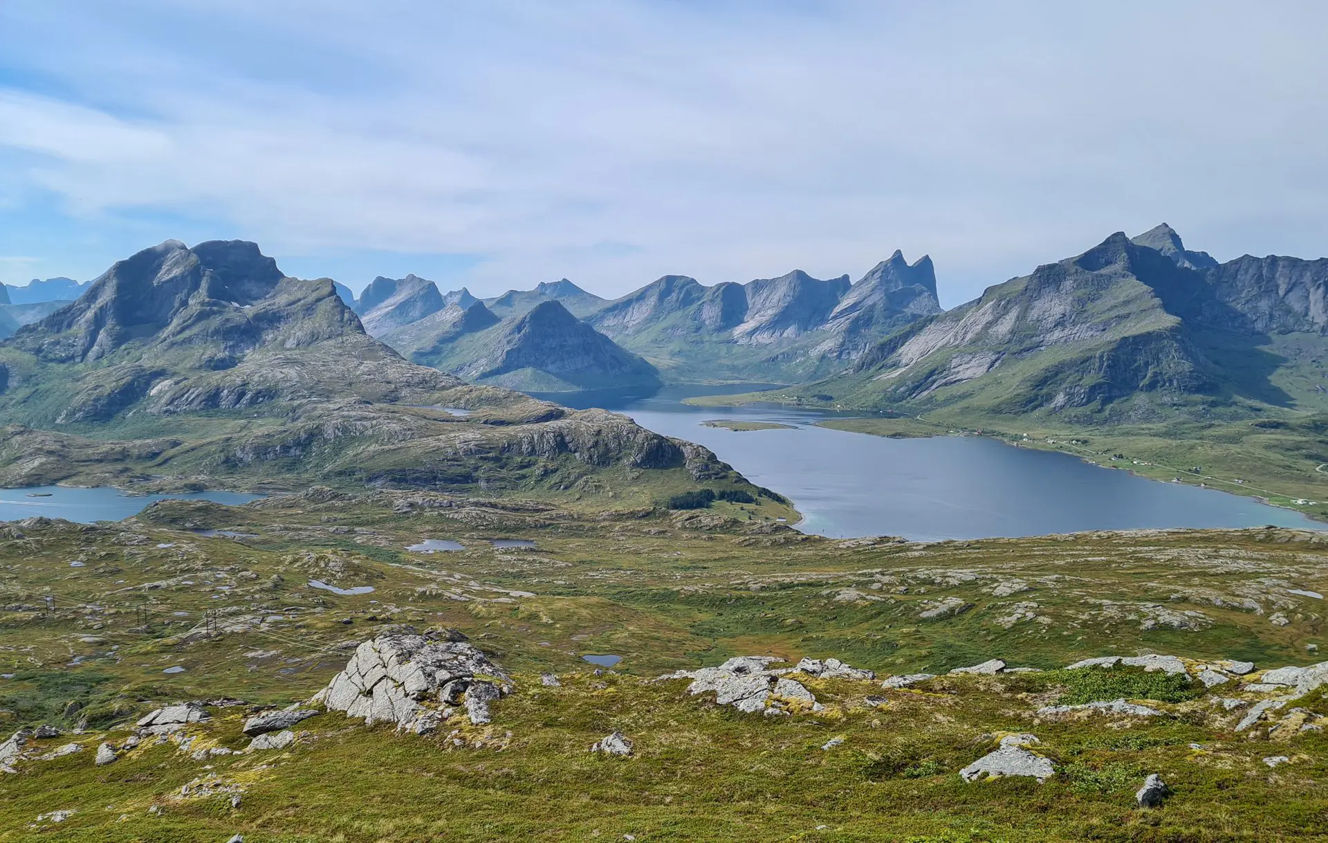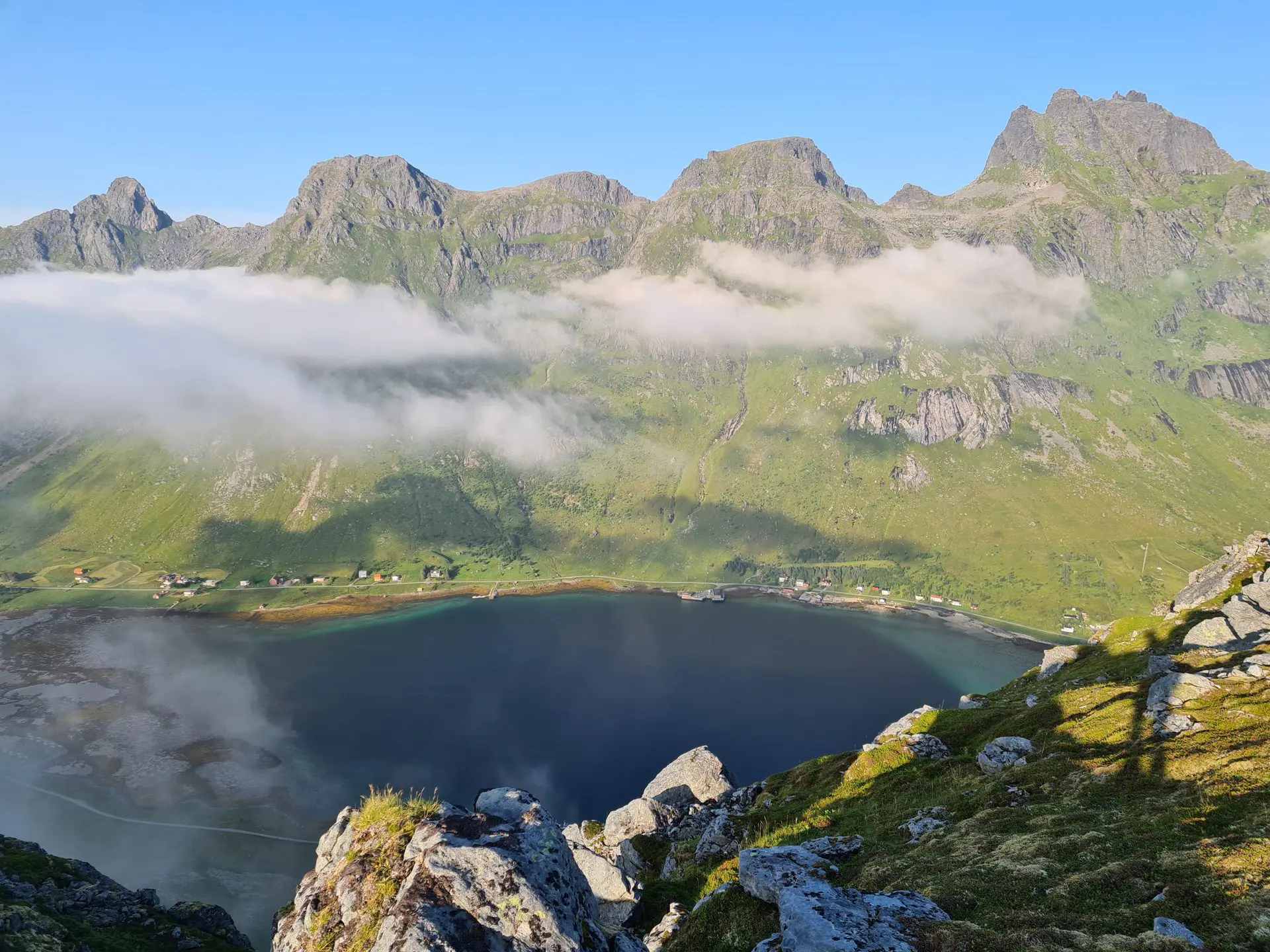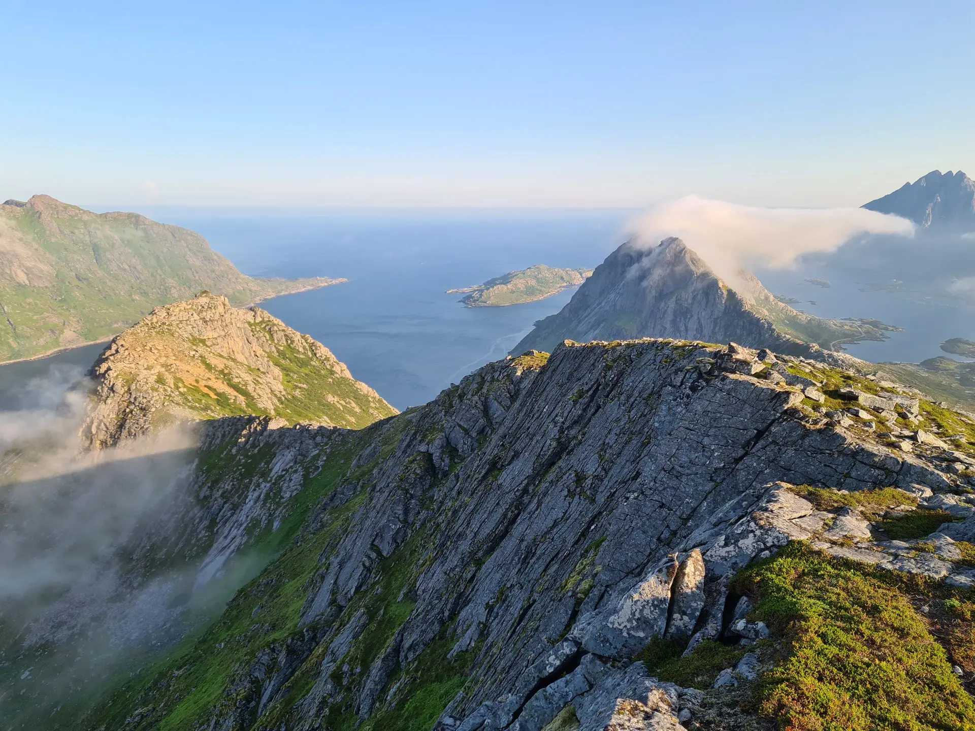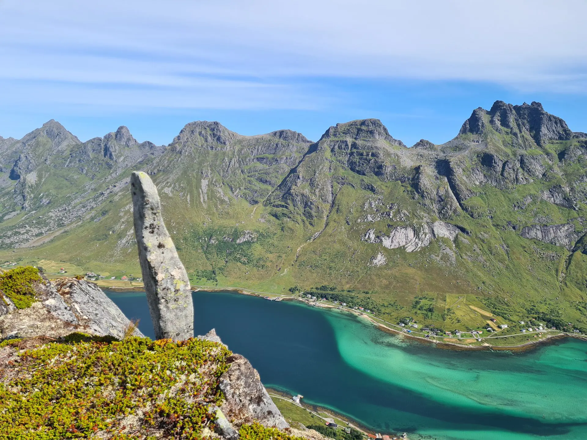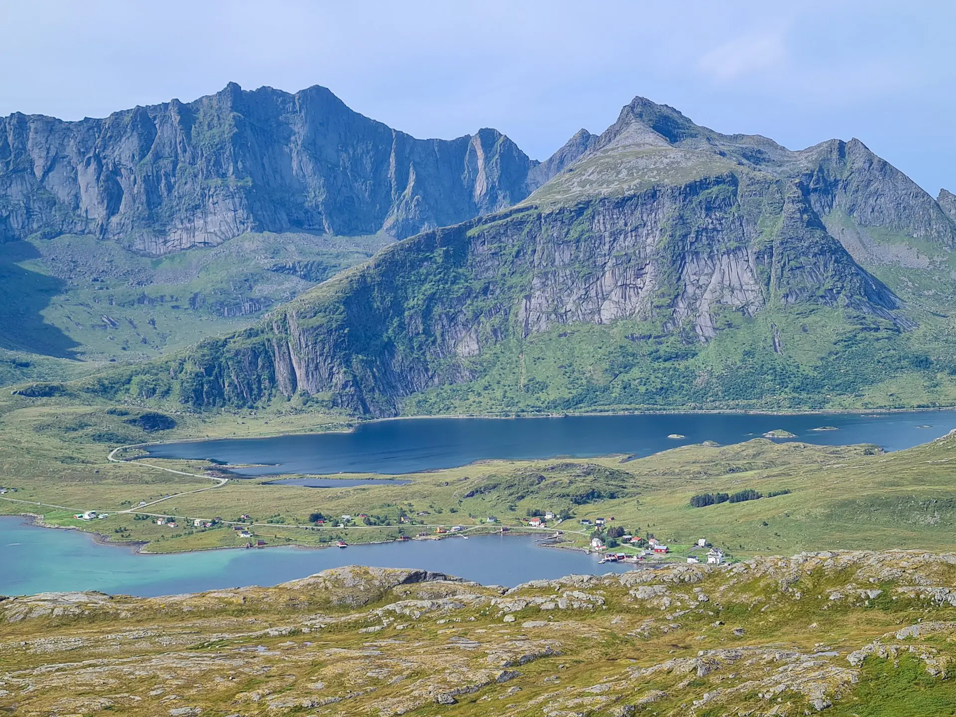 - Le magnifique panorama sur le fjord de Skjelfjorden et les sommets de Flakstadøya depuis le sommet.