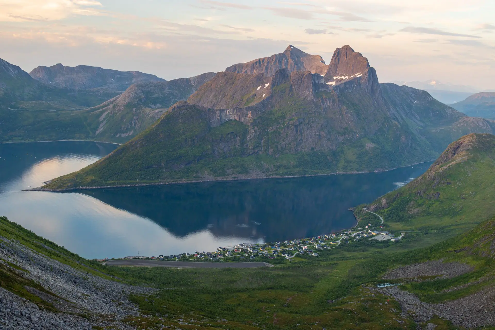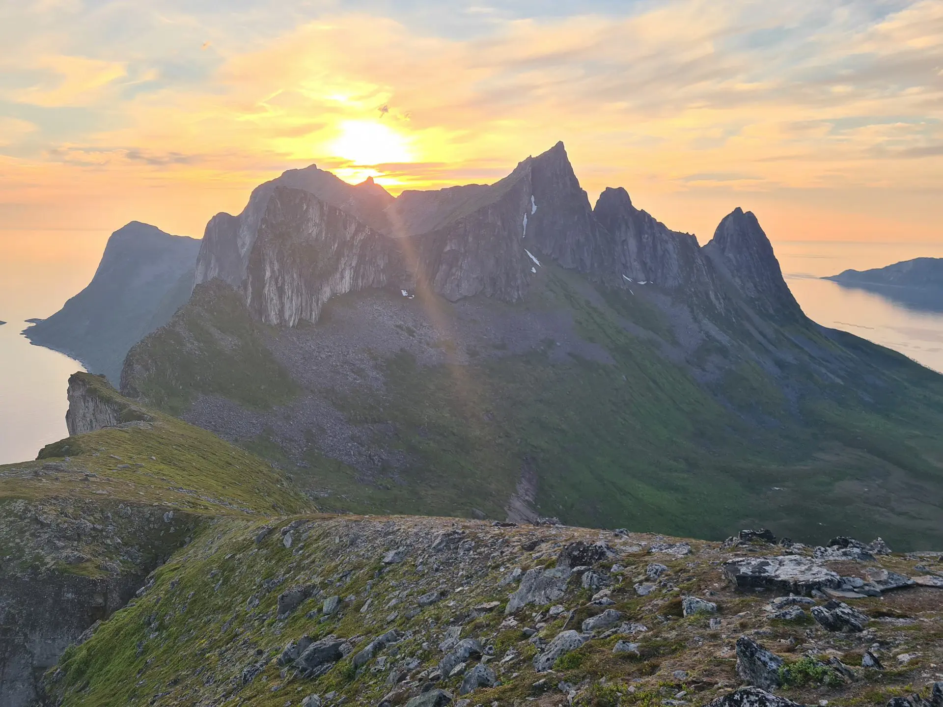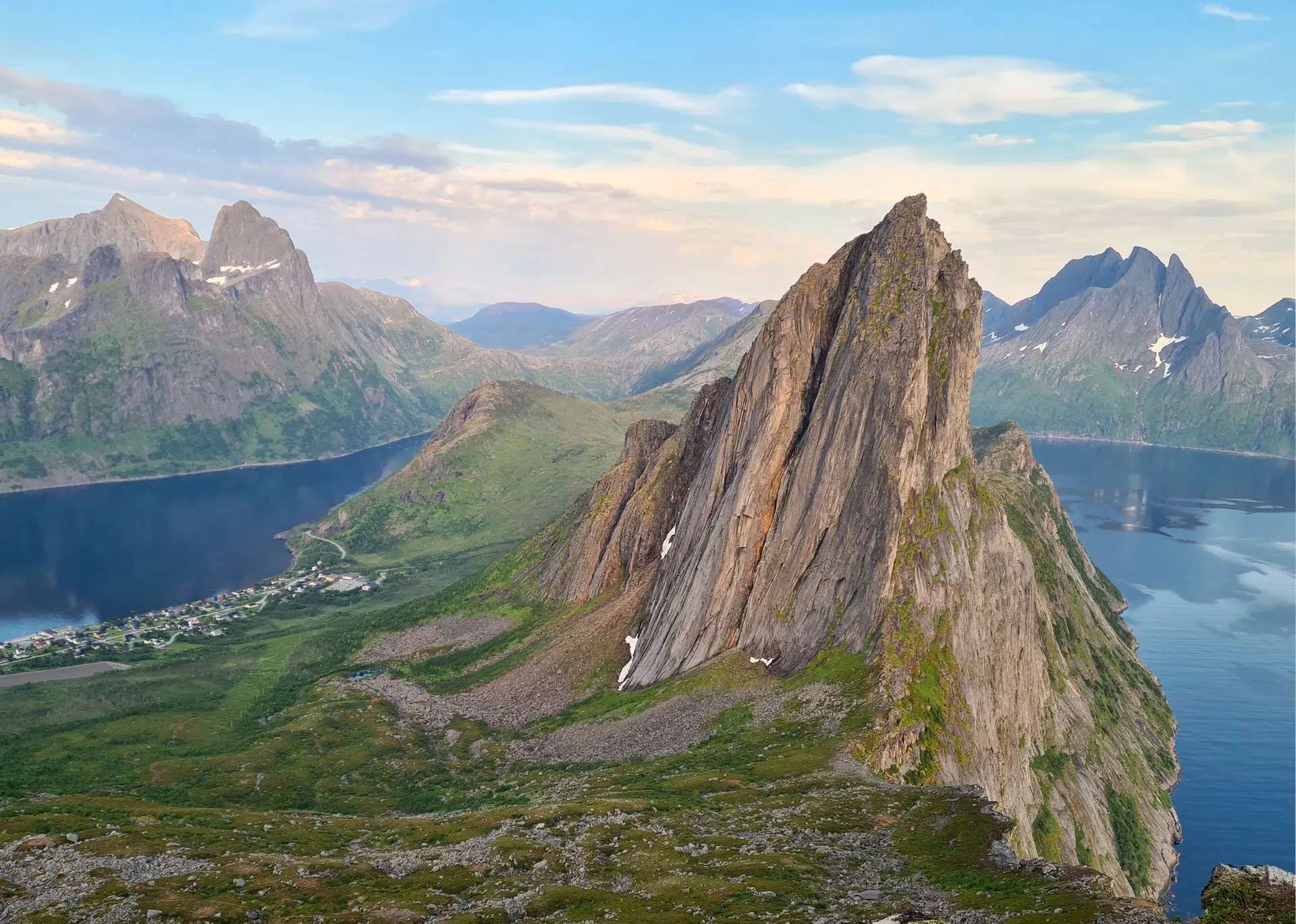 Cette randonnée courte mais intense vous récompense par des vues spectaculaires de chaque côté : Segla, bien sûr, mais aussi les fjords de Mefjorden et d'Oyfjorden, ainsi que sur la chaîne de Kongen au nord.