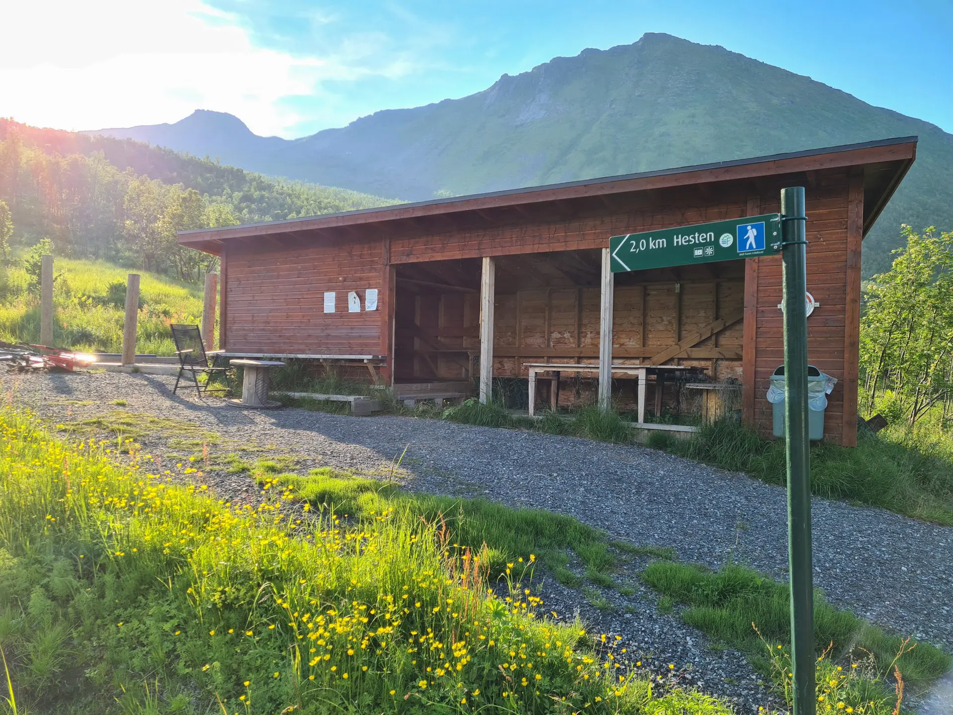 Parking : Il n'y a qu'un seul grand parking (payant) à Fjordgård, celui dédié à la randonnée de Segla. Pour accéder au départ du sentier menant à Hesten, suivez la route en direction du fjord. Prenez ensuite la première rue à gauche et continuez jusqu'au point le plus élevé de cette route, près d'un virage à droite. Vous verrez alors un abri en bois ainsi que des panneaux indiquant le chemin menant à Hesten.