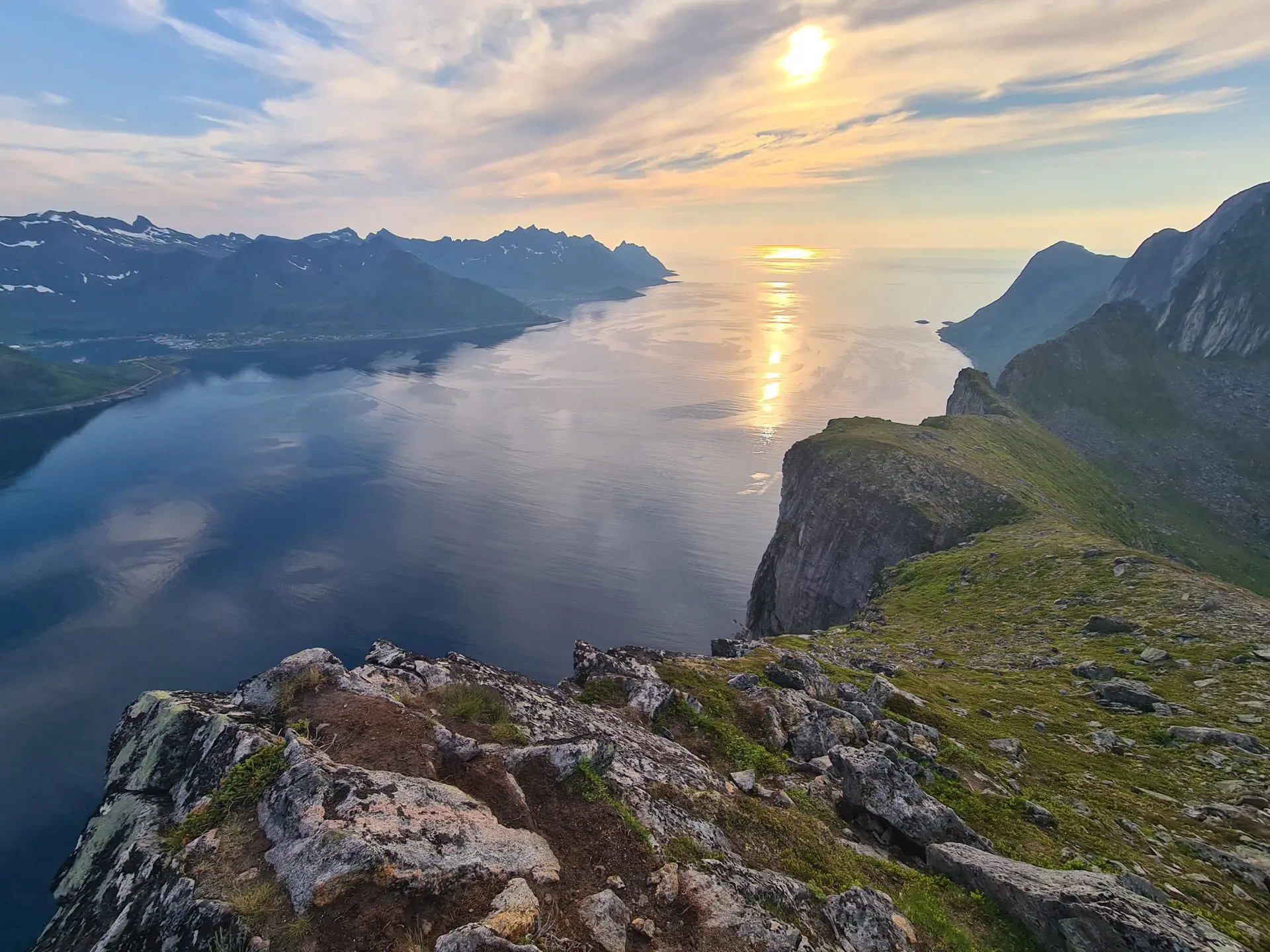 - Le panorama époustouflant à 360 degrés qui porte sur de nombreux sommets de l'île de Senja et des fjords d'un bleu intense (Øyfjorden et Mefjorden).