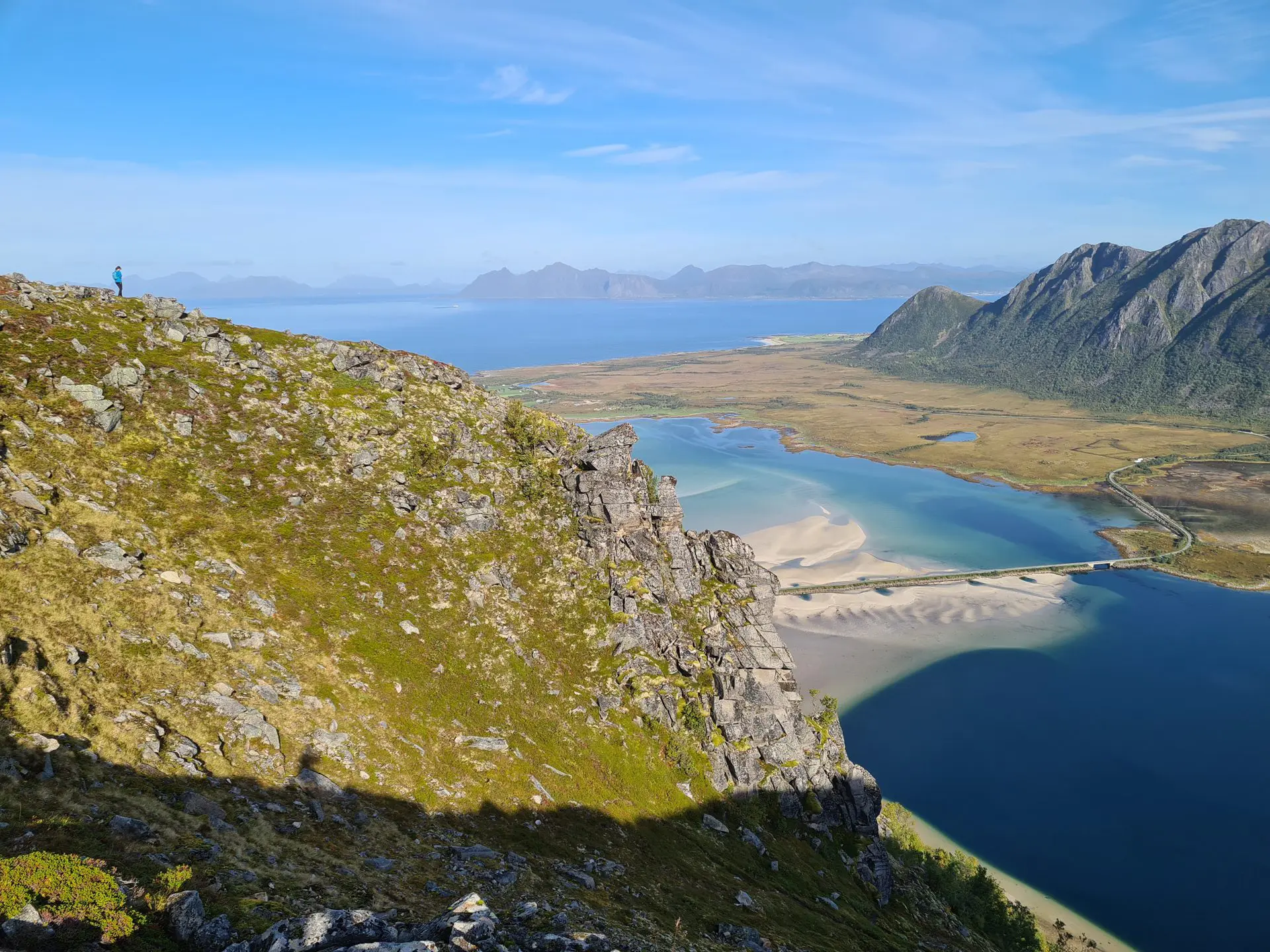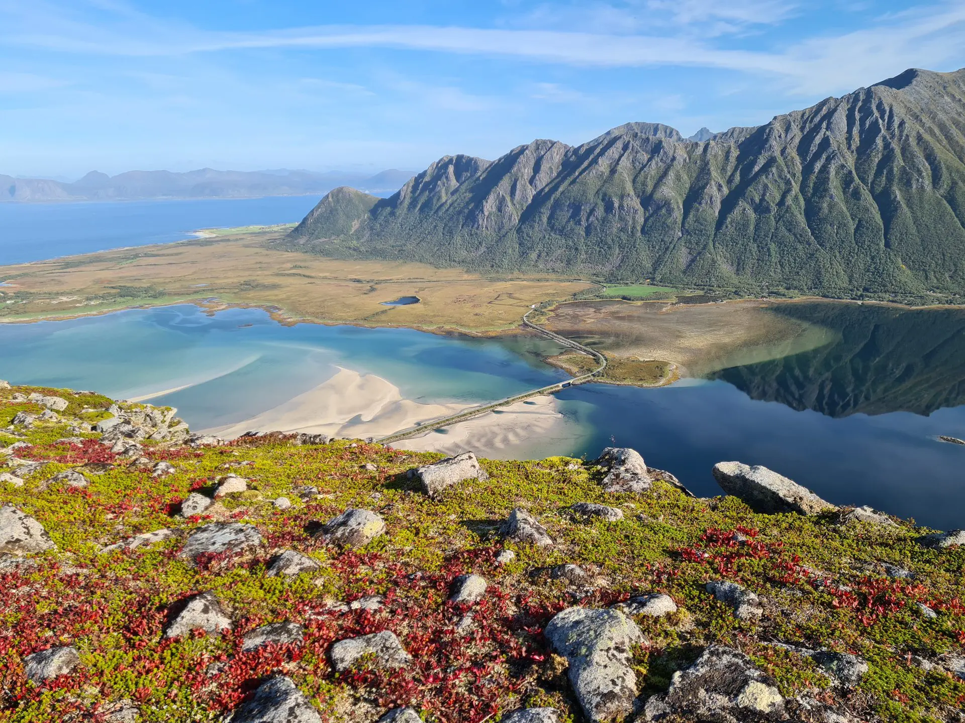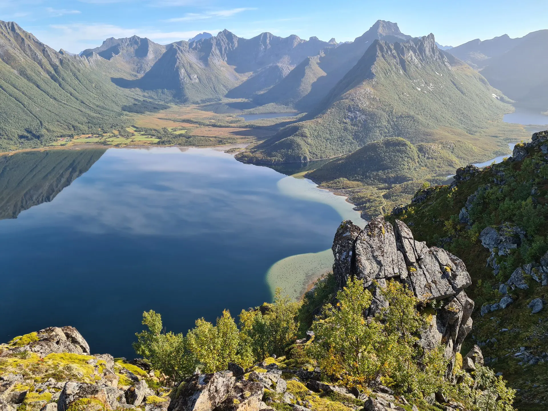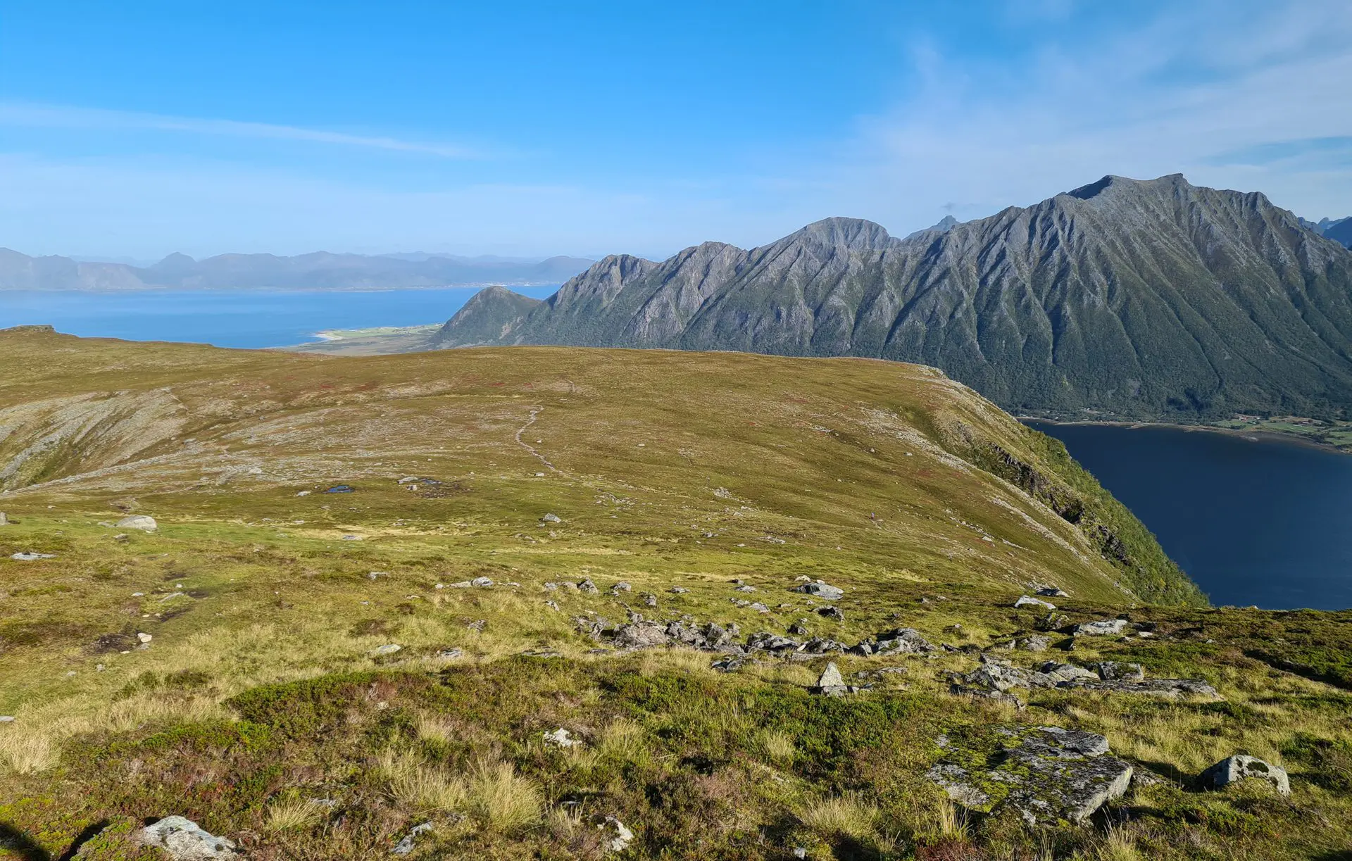 - Le panorama exceptionnel depuis le plateau intermédiaire sur le fjord de Grunnførfjorden et les massifs environnants.