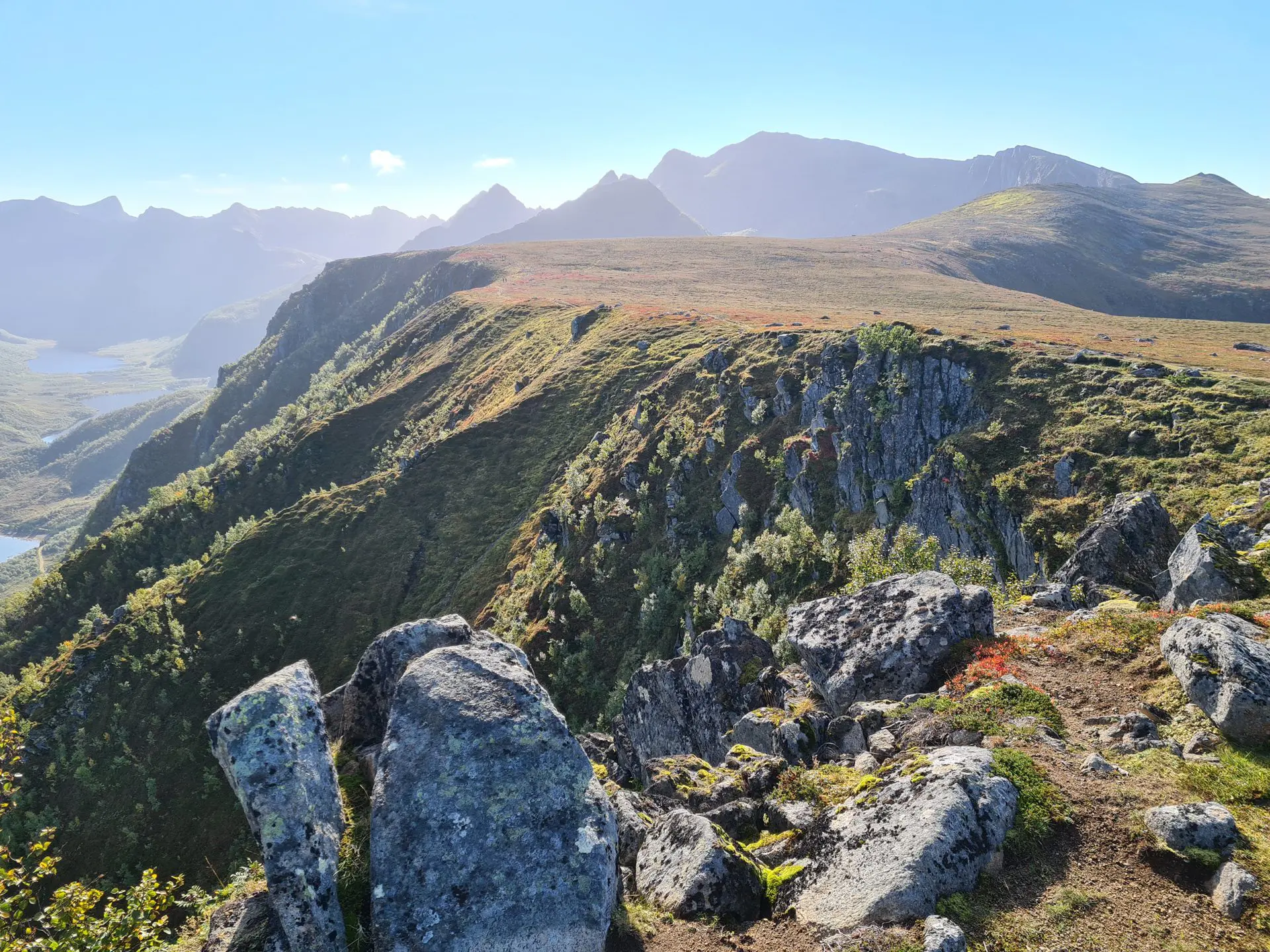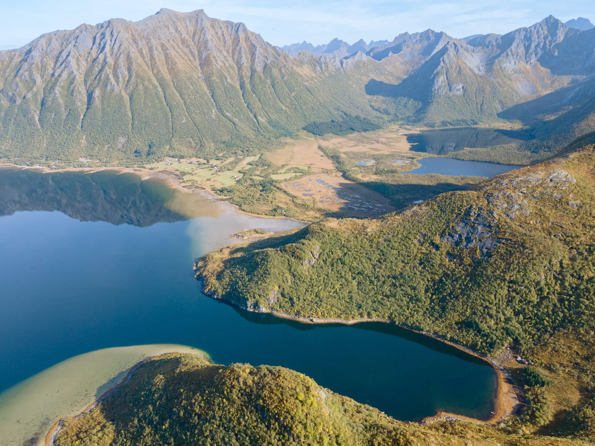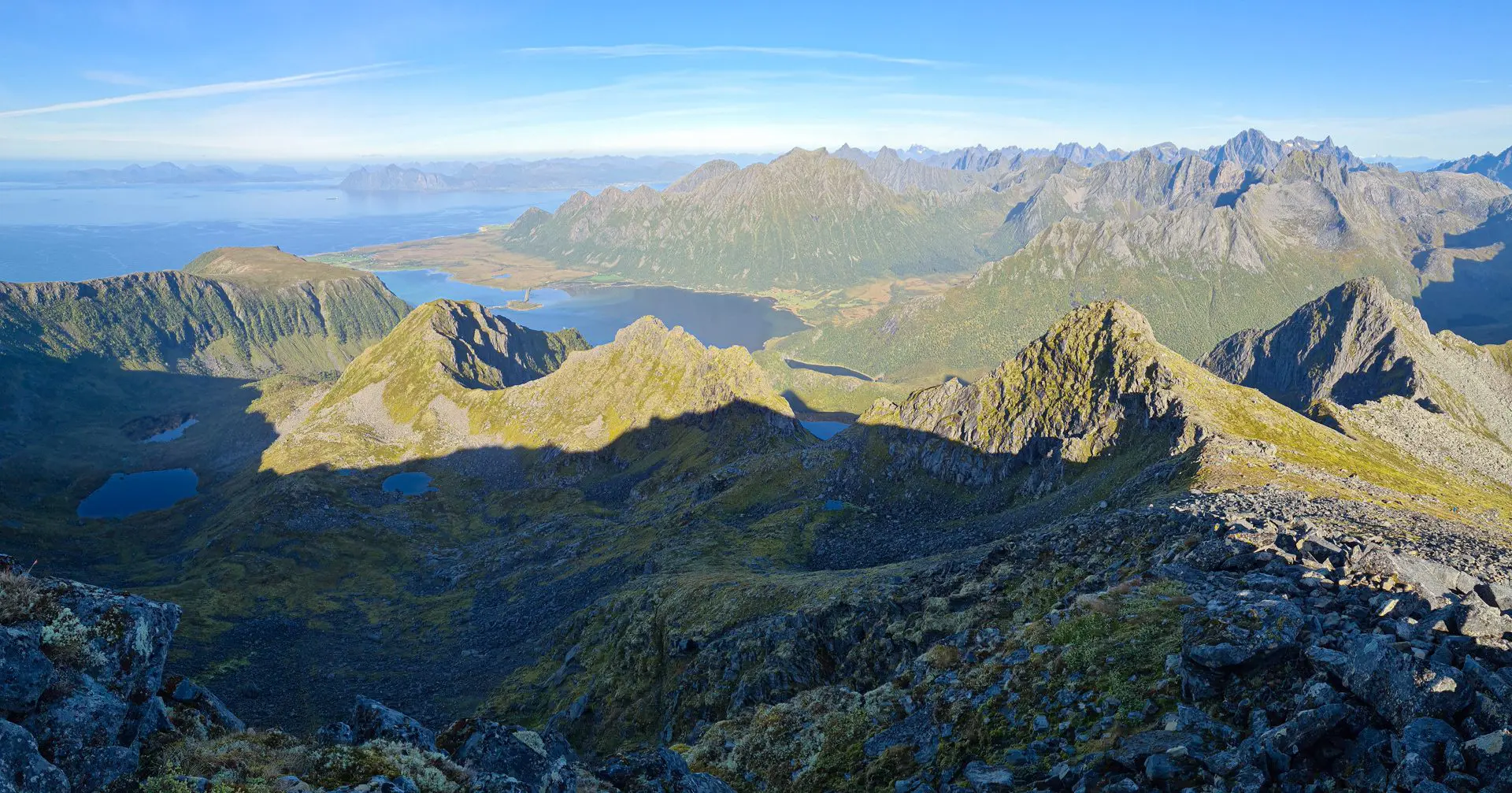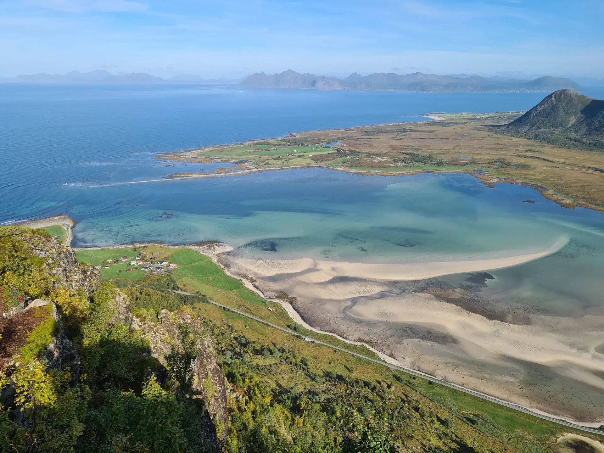 - Le panorama exceptionnel depuis le plateau intermédiaire sur le fjord de Grunnførfjorden et les massifs environnants.