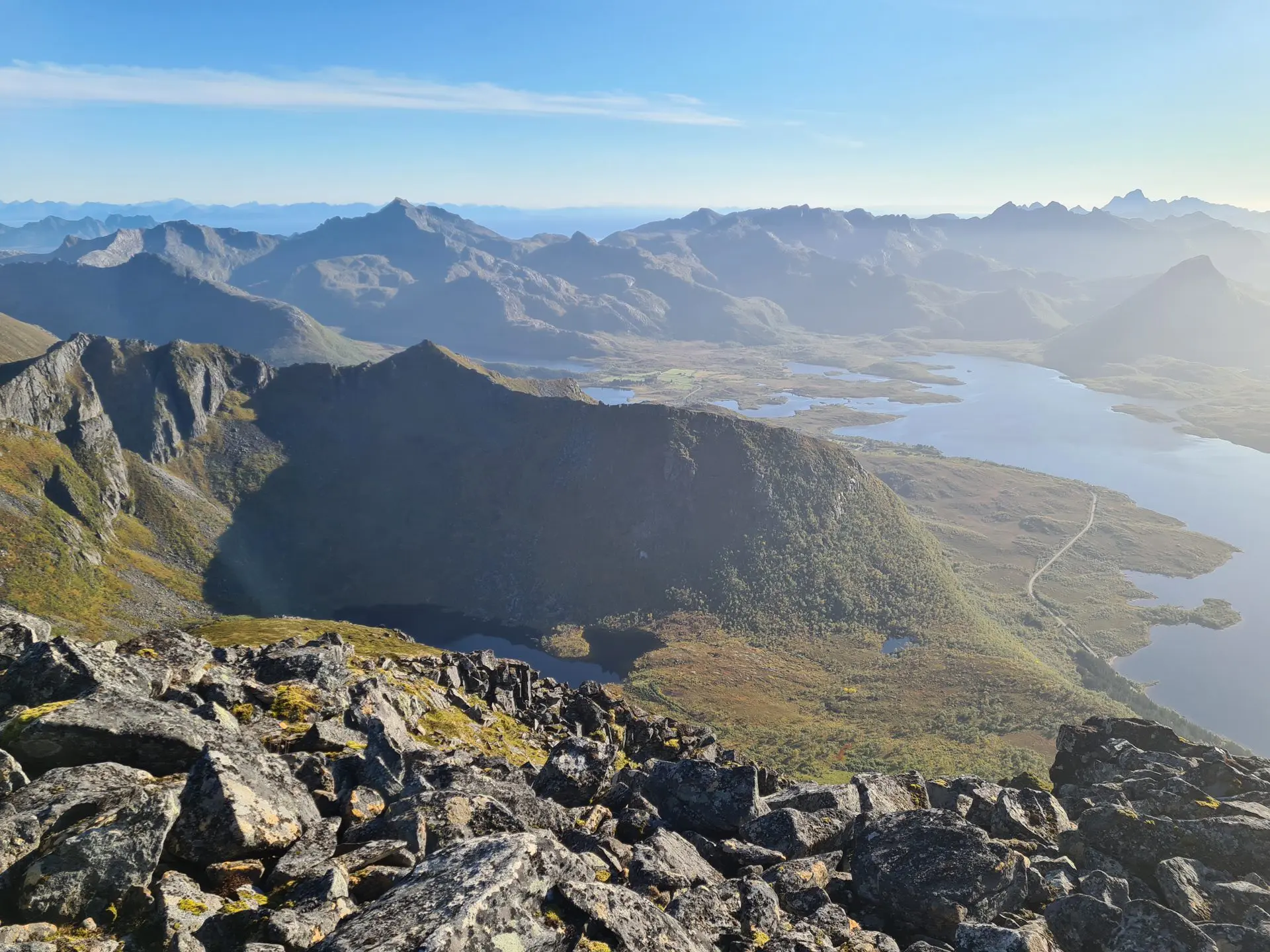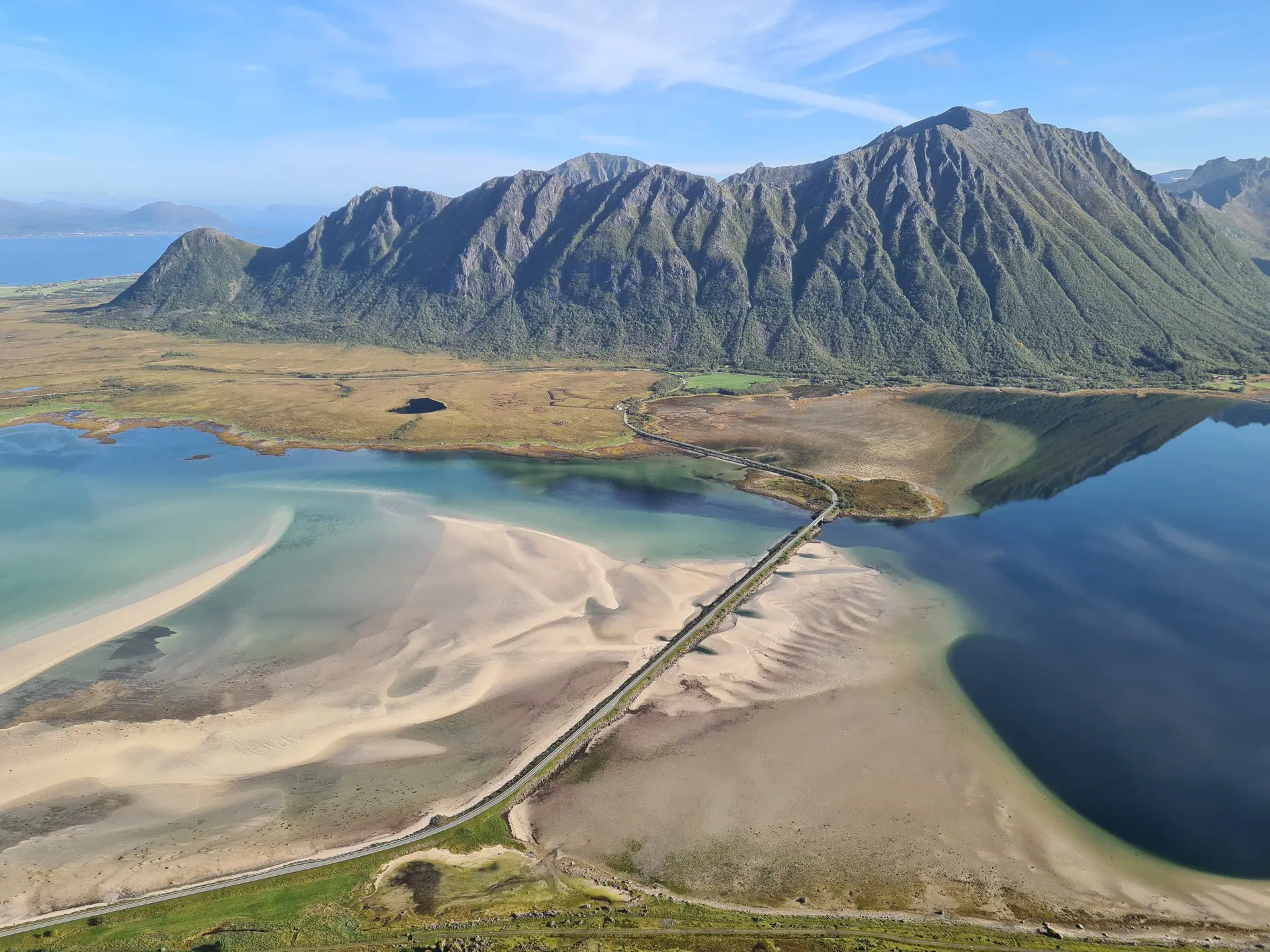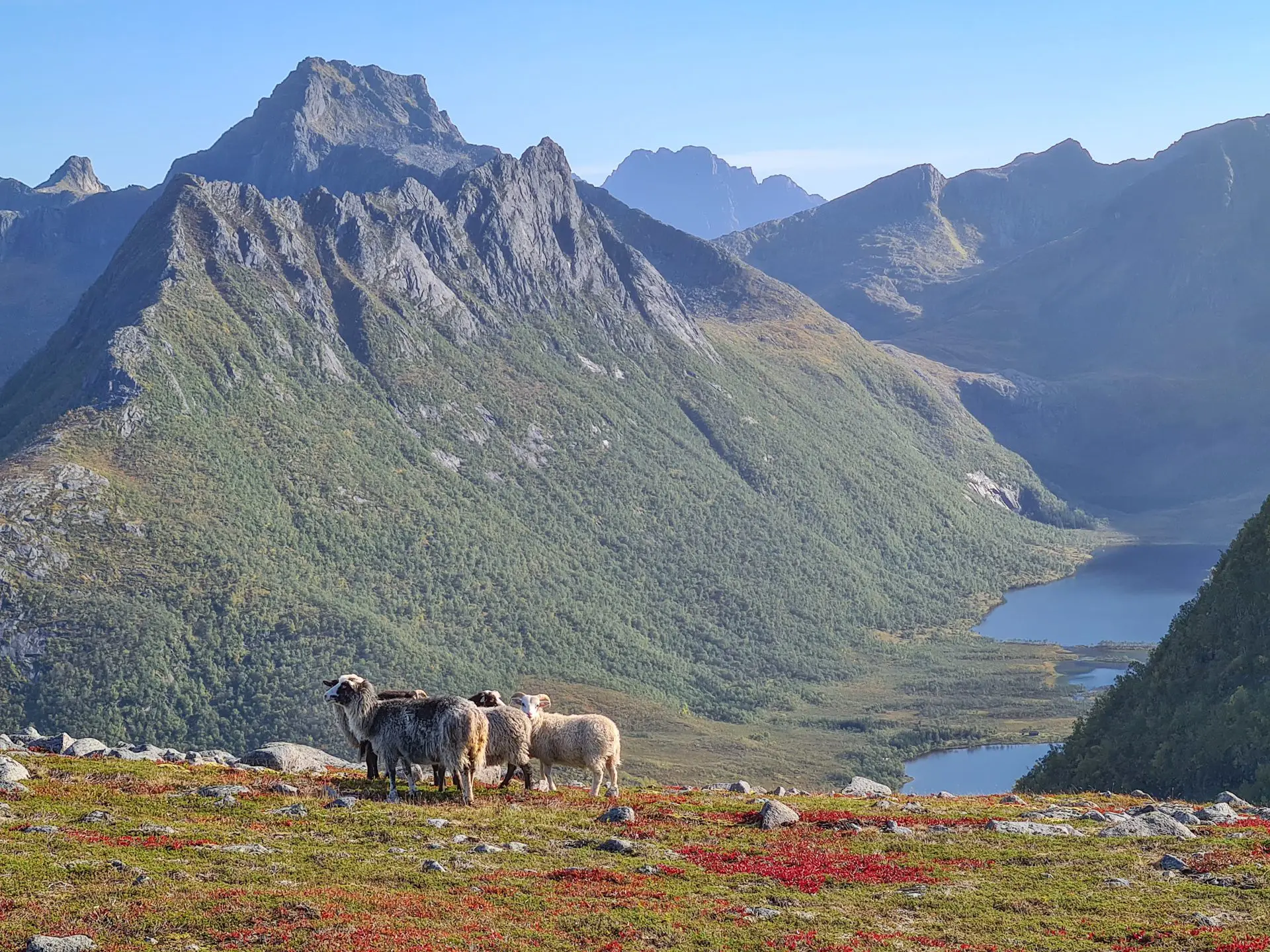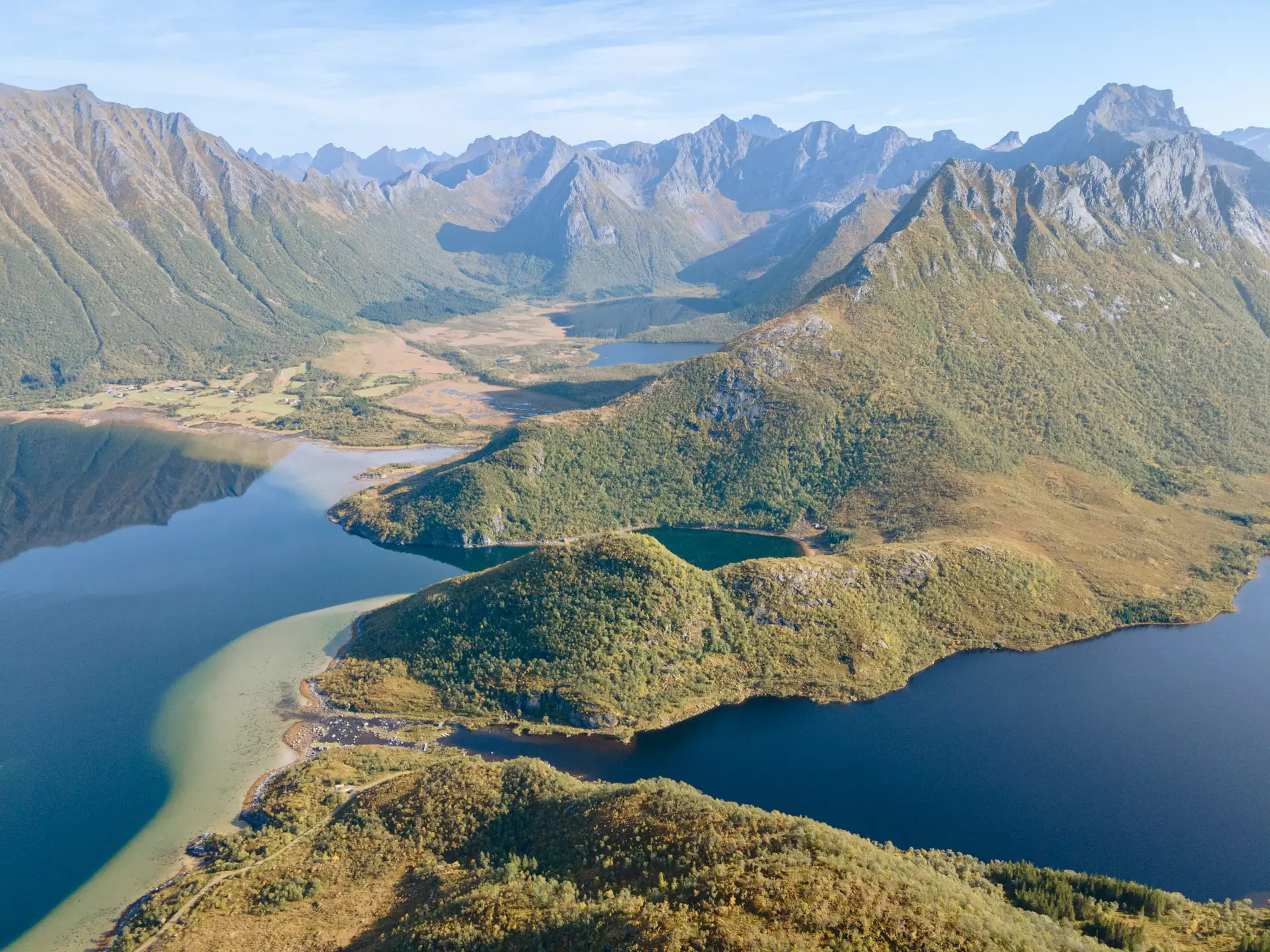 - Le panorama exceptionnel depuis le plateau intermédiaire sur le fjord de Grunnførfjorden et les massifs environnants.