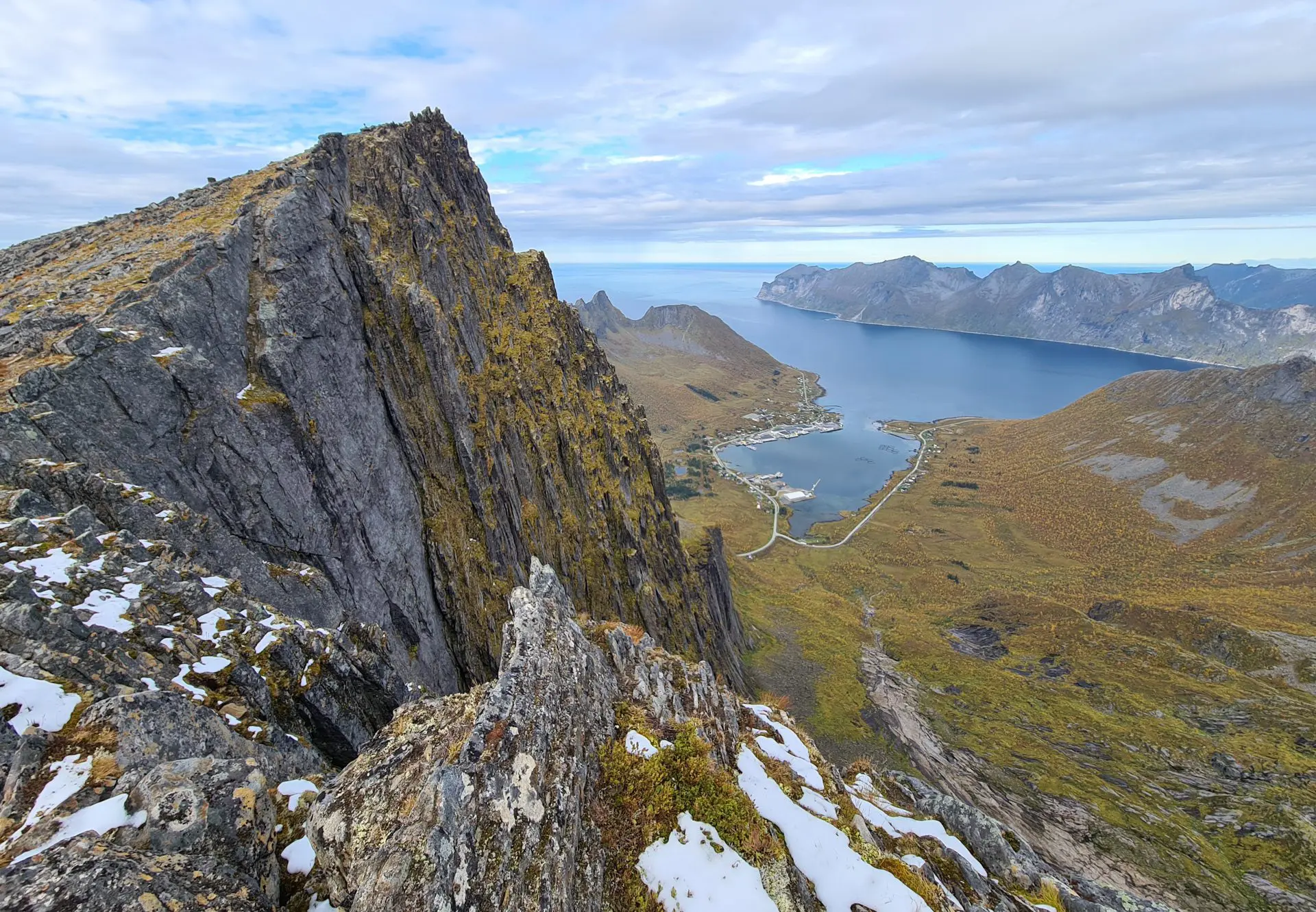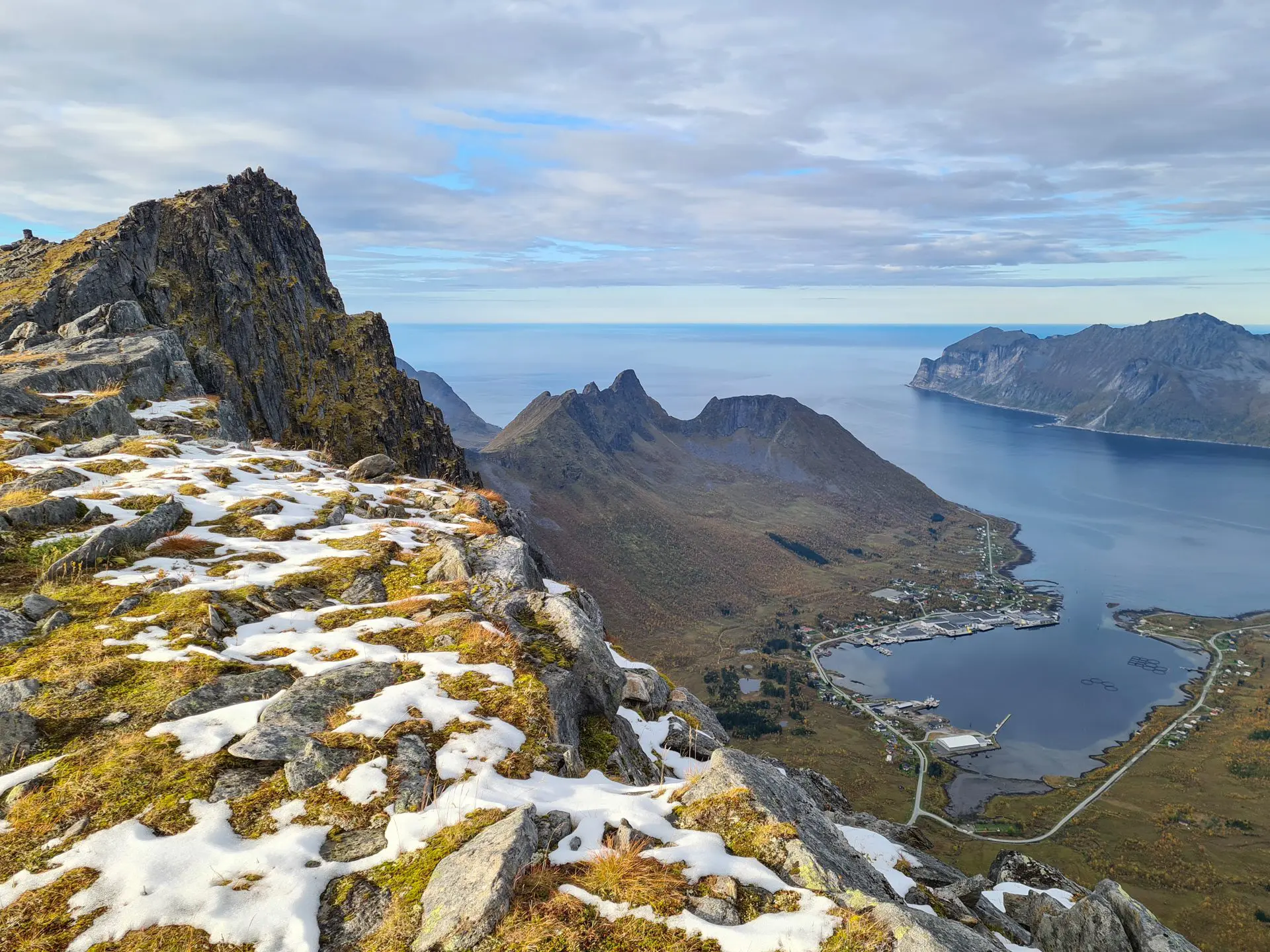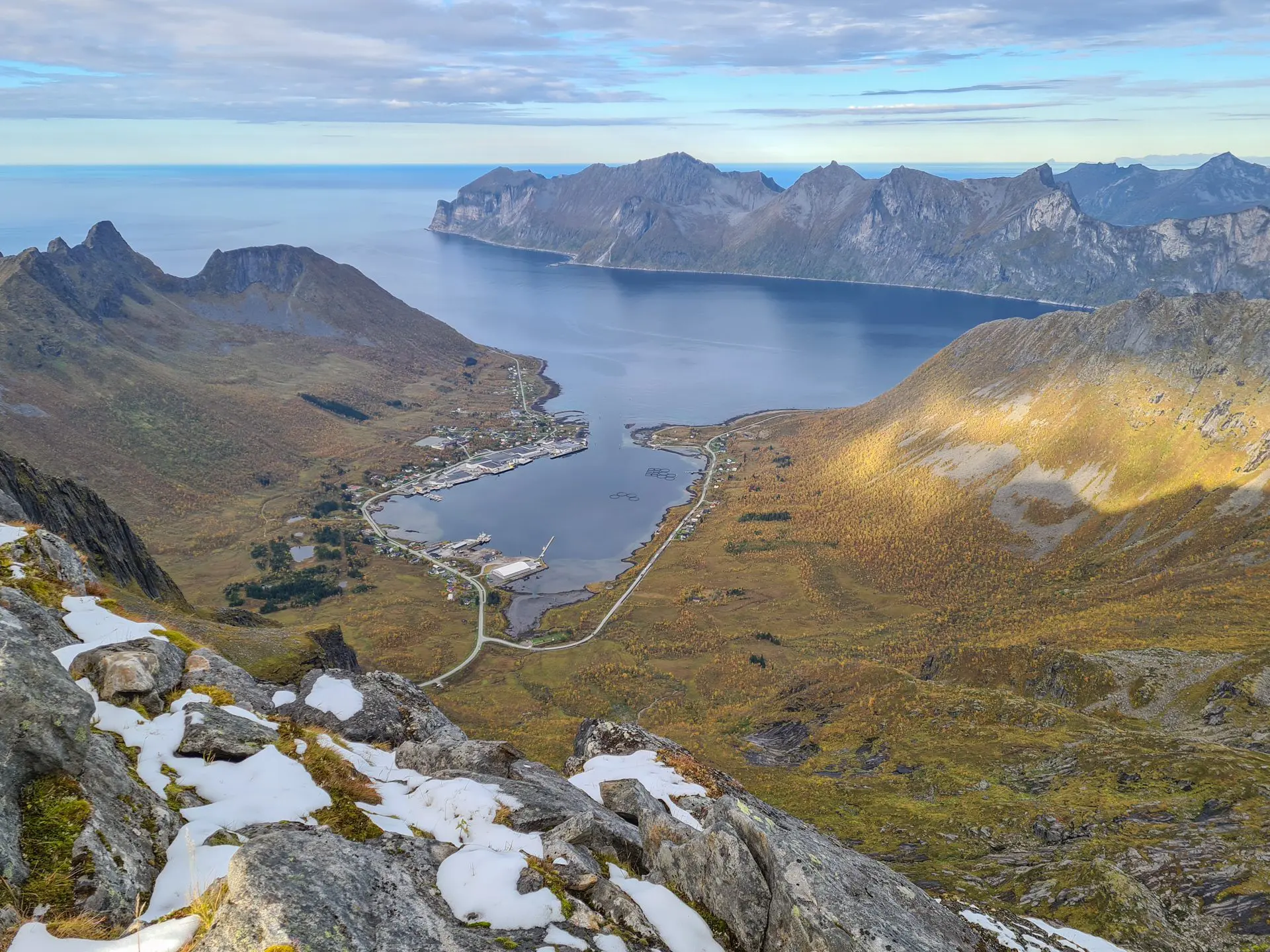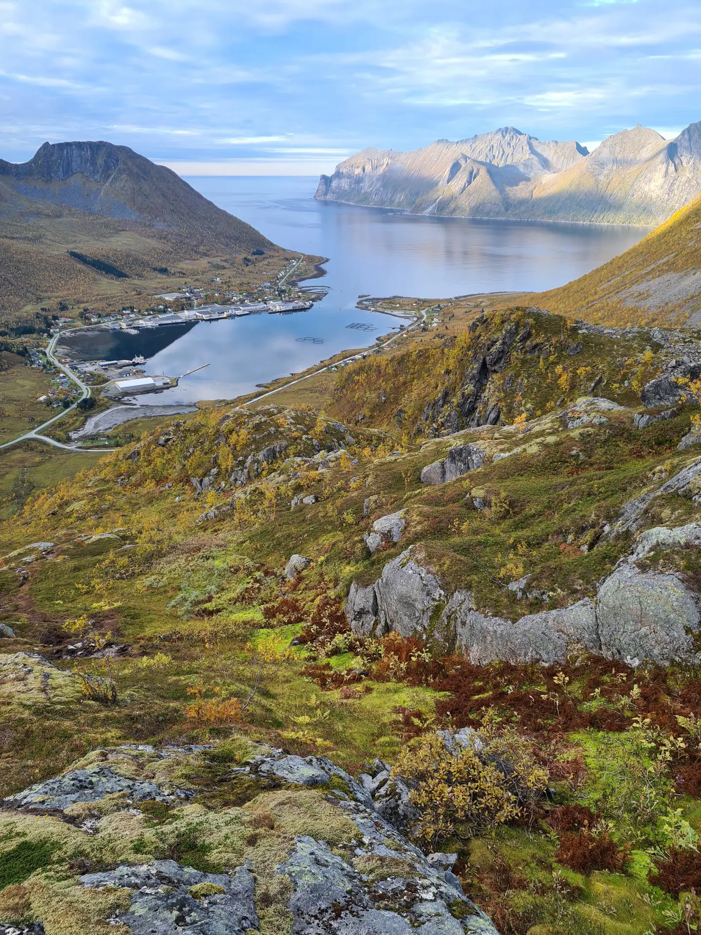 - Panorama exceptionnel depuis le sommet : vues à 360° sur les montagnes escarpées et le littoral spectaculaire de Senja, avec les fjords d'Ersfjorden et de Medfjorden de part et d'autre.