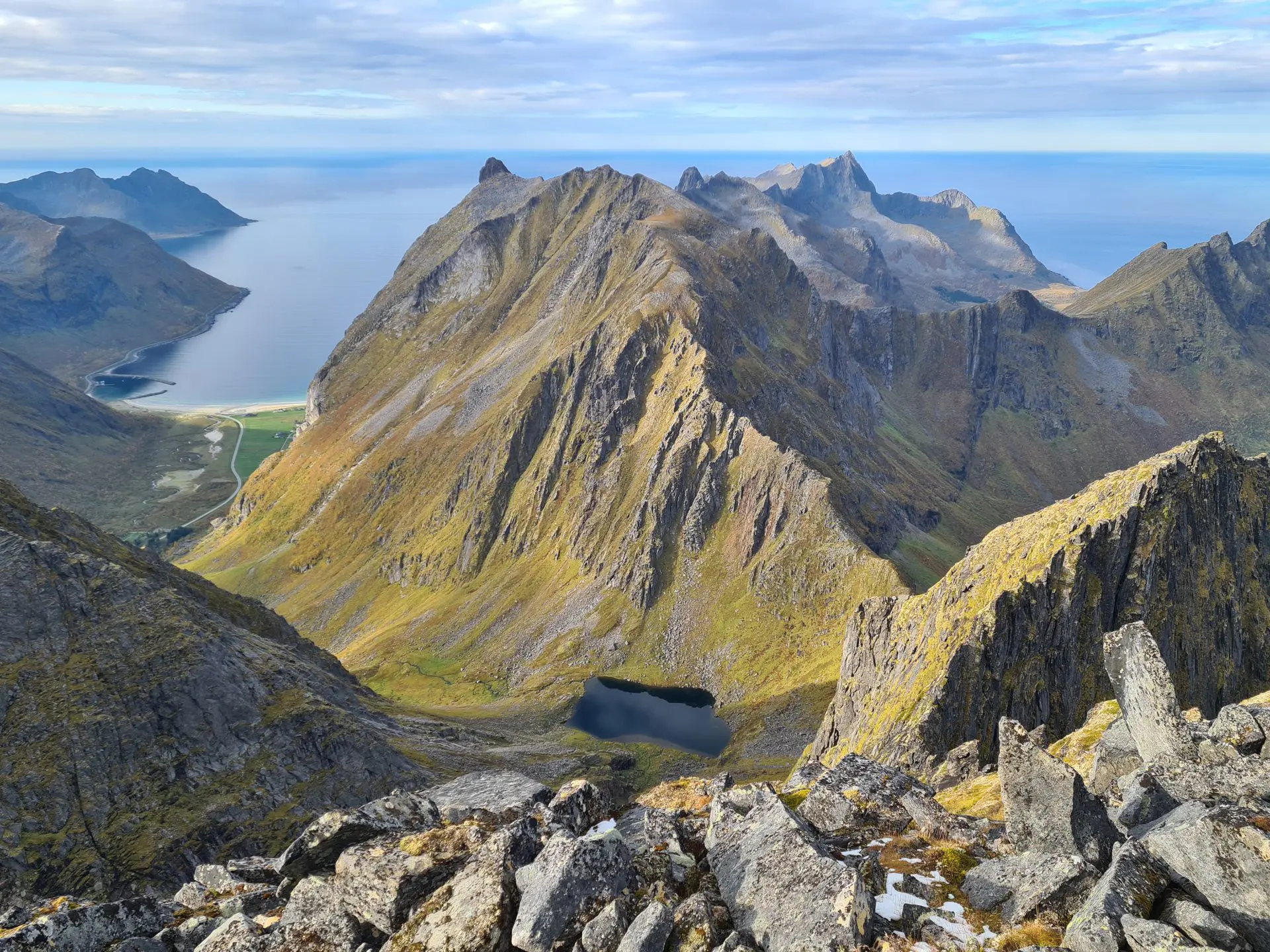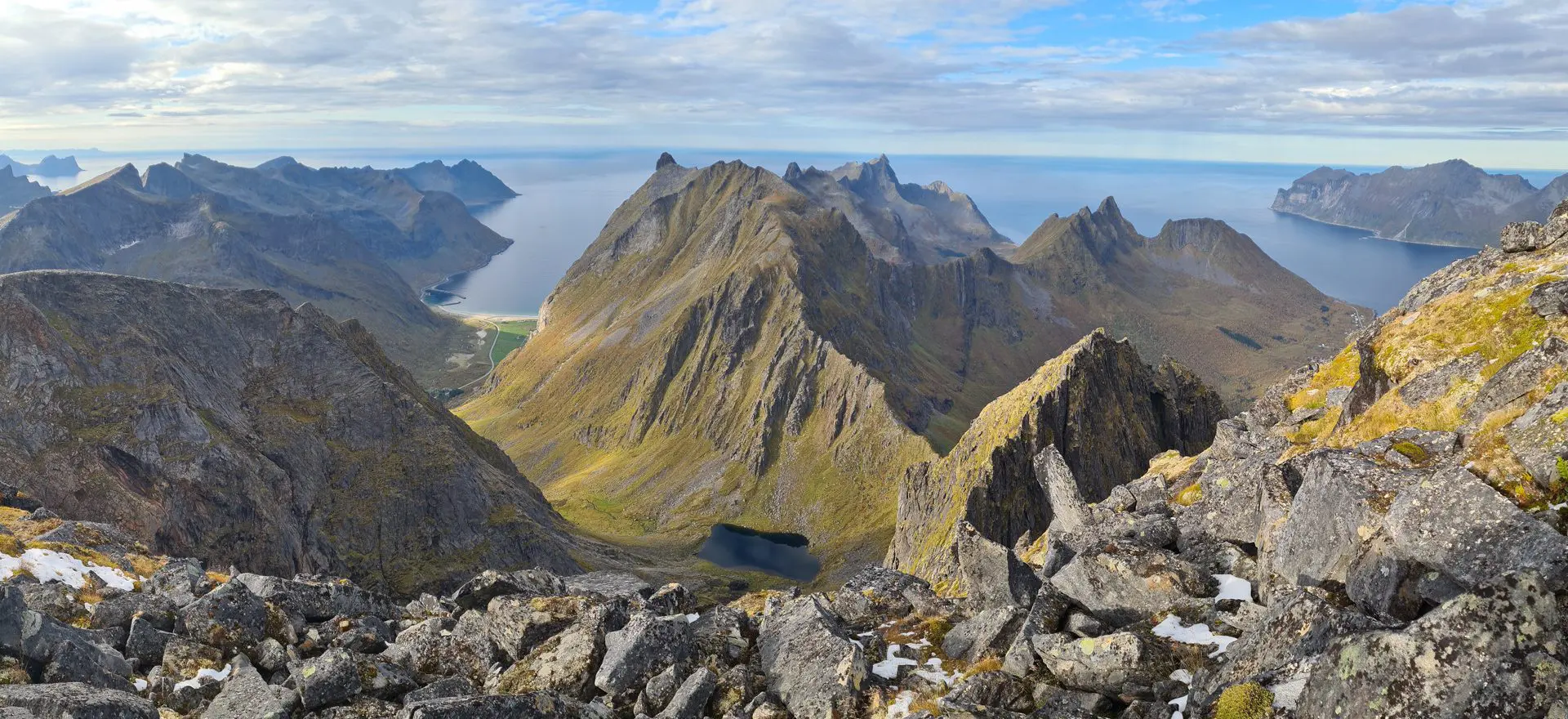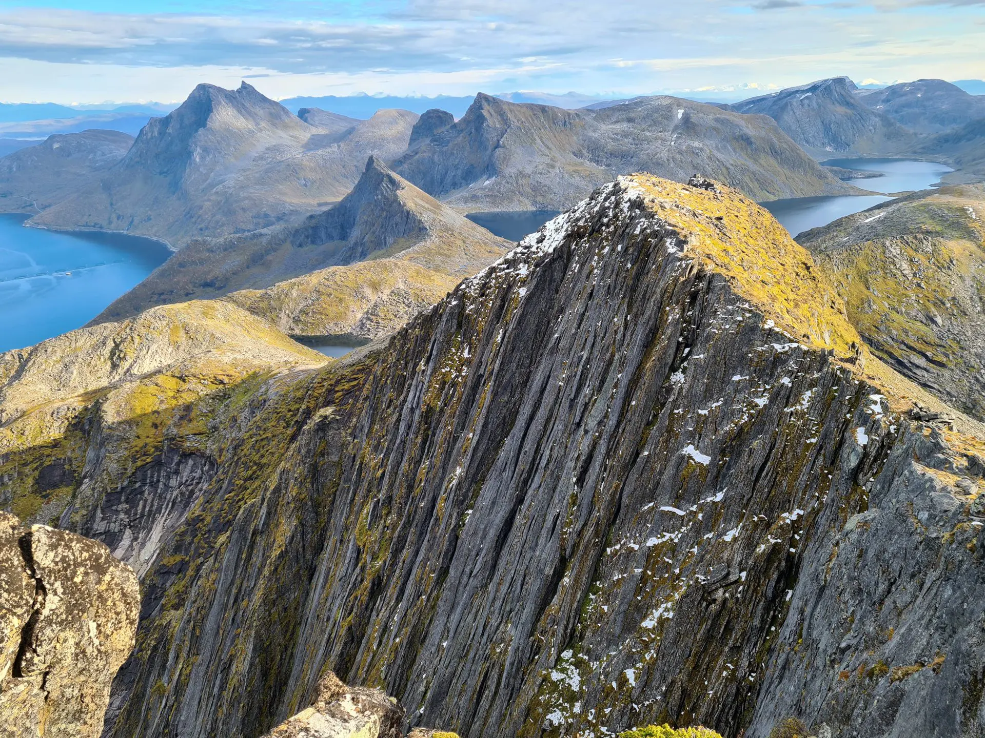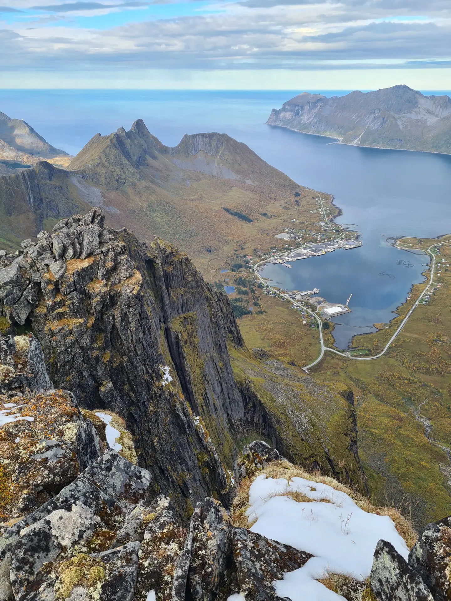 - Panorama exceptionnel depuis le sommet : vues à 360° sur les montagnes escarpées et le littoral spectaculaire de Senja, avec les fjords d'Ersfjorden et de Medfjorden de part et d'autre.