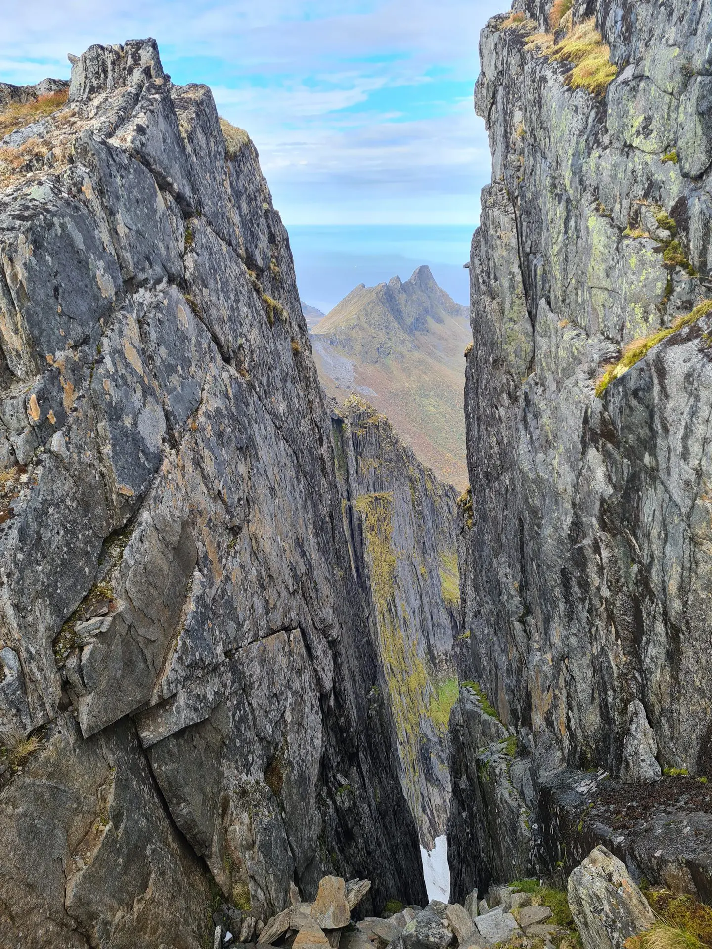 La seconde partie de la randonnée suit la crête de Roalden. Malgré ce que l'on pourrait croire, l'itinéraire demeure peu exposé : le sentier ne longe jamais la falaise de près et ne présente aucun passage vertigineux. Cependant, si vous envisagez de rejoindre le sommet exact de Roalden, soyez prudent : la fin du parcours devient nettement plus aérienne et technique. Il est fortement conseillé de s'arrêter à la boîte aux lettres, située quelques mètres avant le sommet, où la vue s'avère tout aussi magnifique.