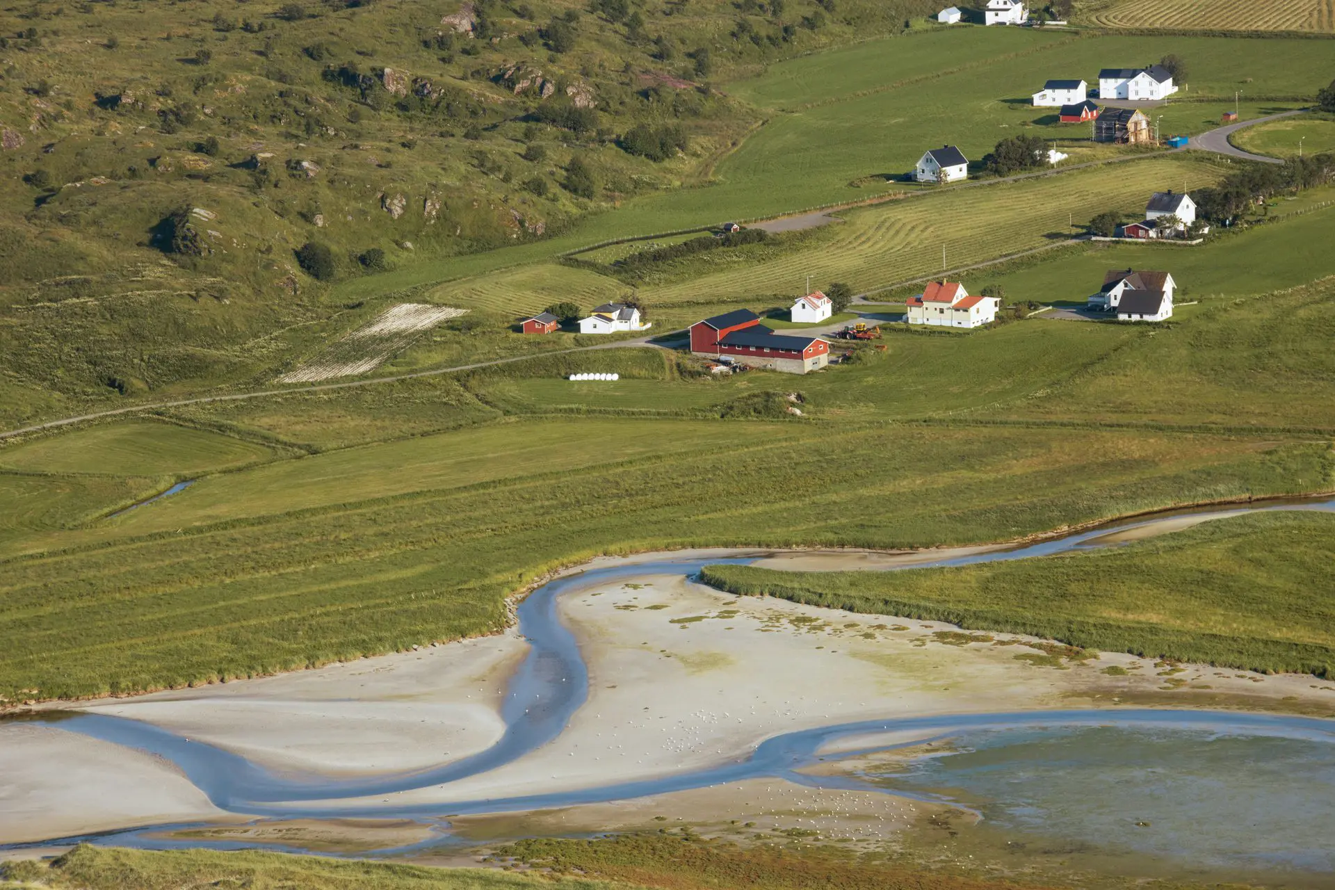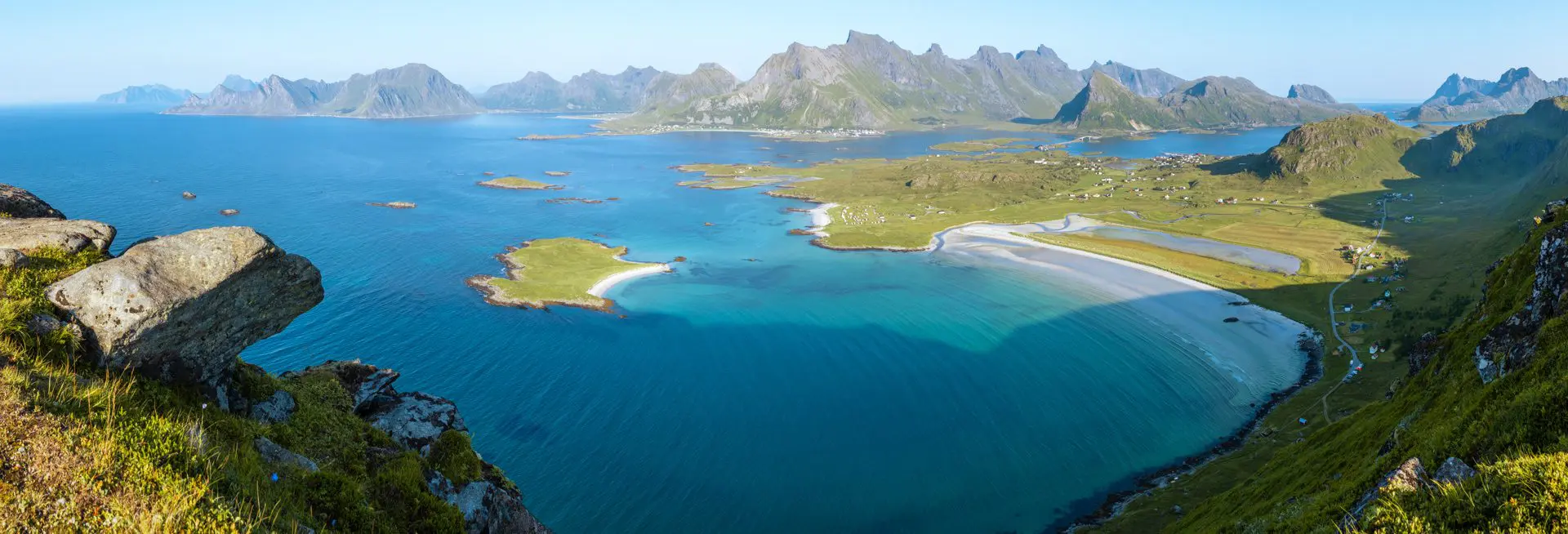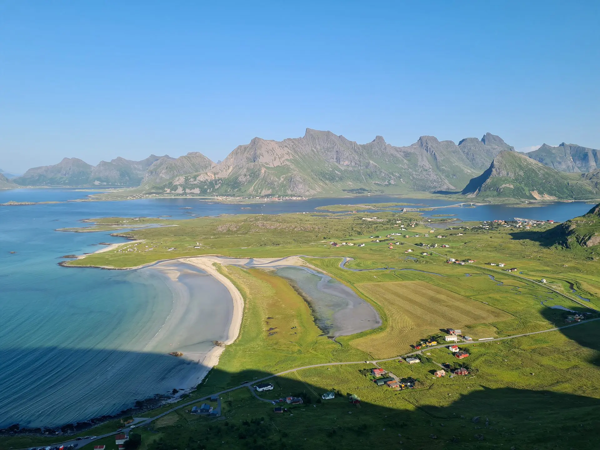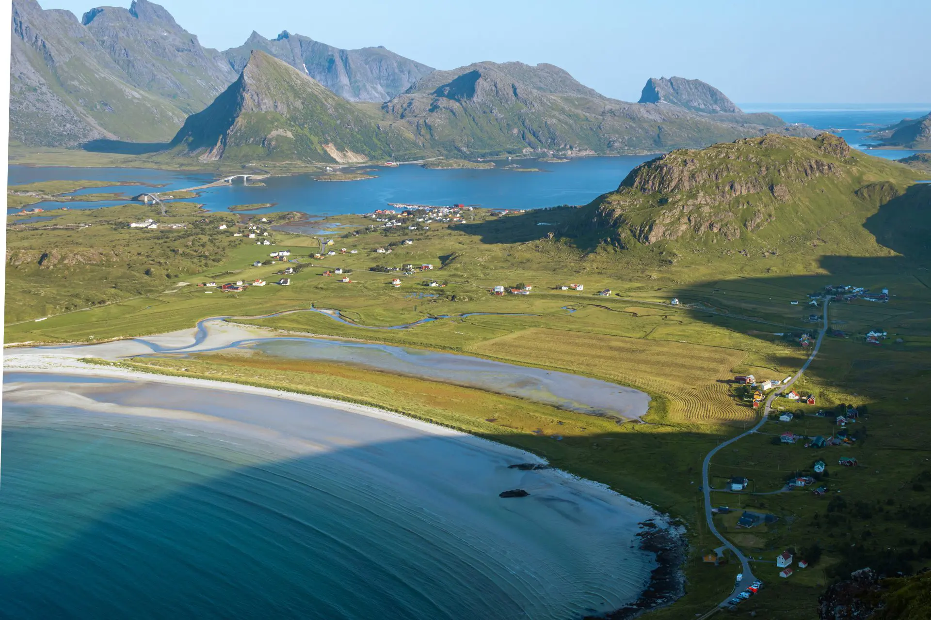 La randonnée de Røren vous mène au sommet d'une modeste colline de 295 mètres située à la pointe nord de l'île de Moskenesøya, dans l'archipel des Lofoten. Cet itinéraire facile révèle des vues magnifiques sur la plage de sable blanc de Sandbotnen, les eaux turquoise de la mer de Norvège et les sommets de l'ile de Flakstadøya.