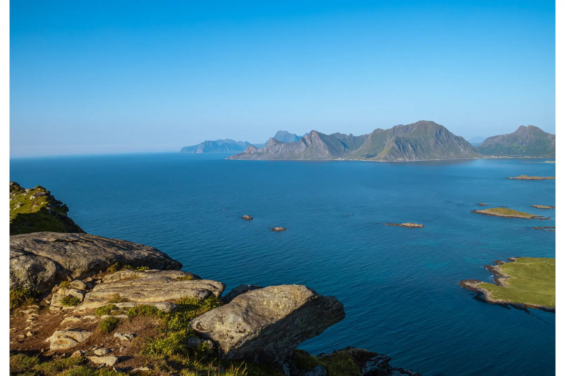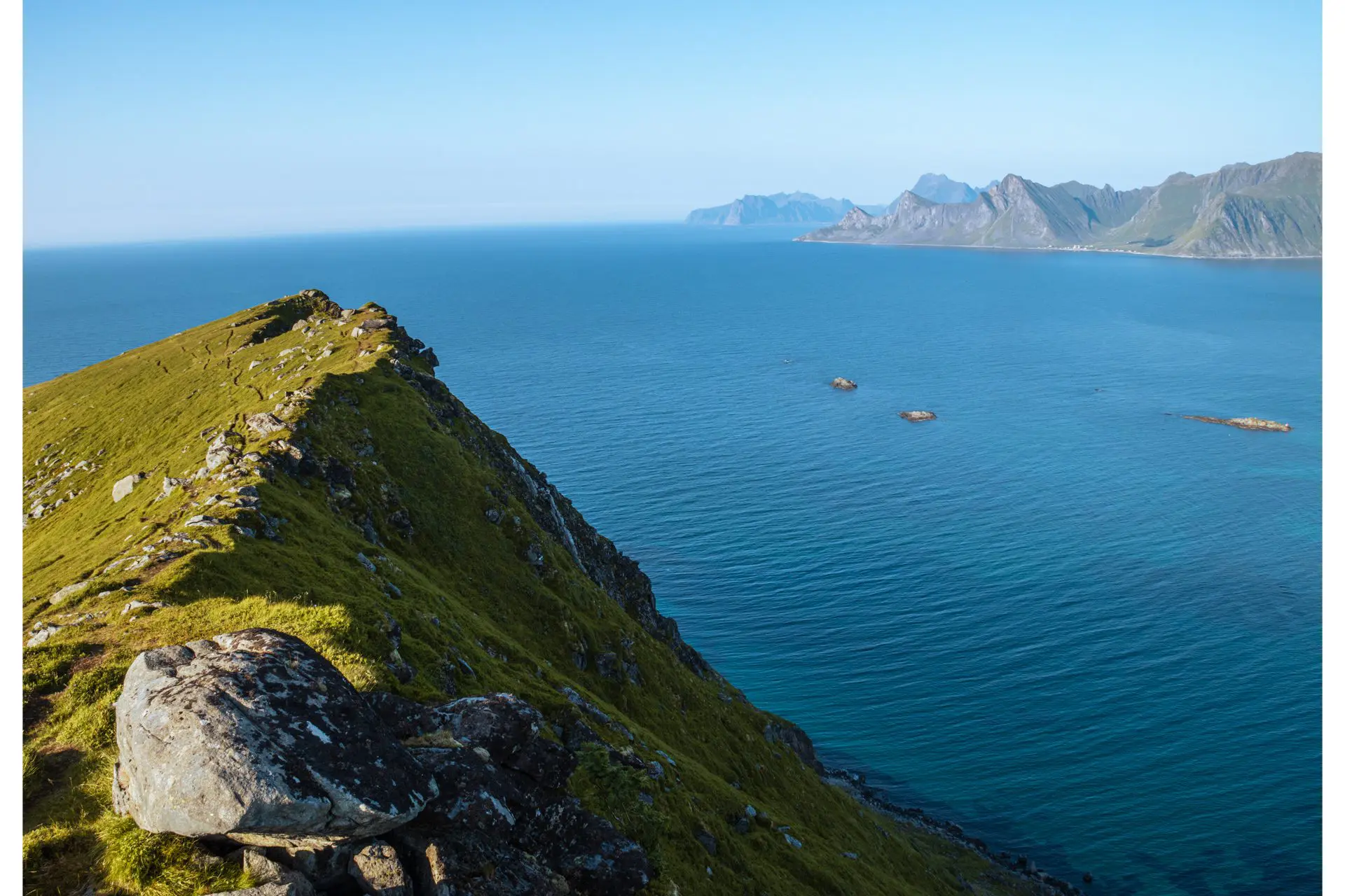 - Panorama exceptionnel depuis le sommet : vue imprenable sur les massifs de l'île de Moskenesøya et de l'ouest de Flakstadøya.